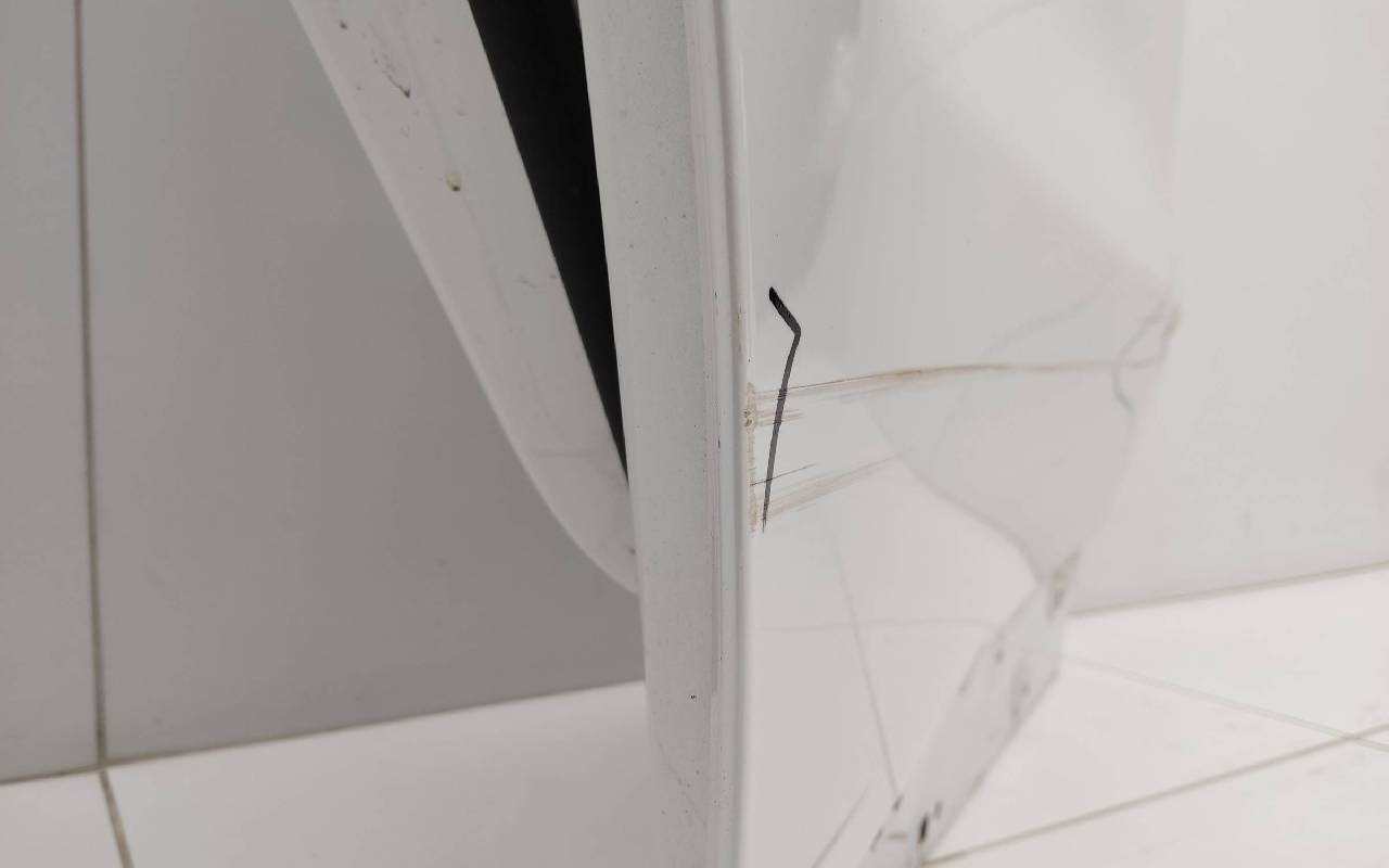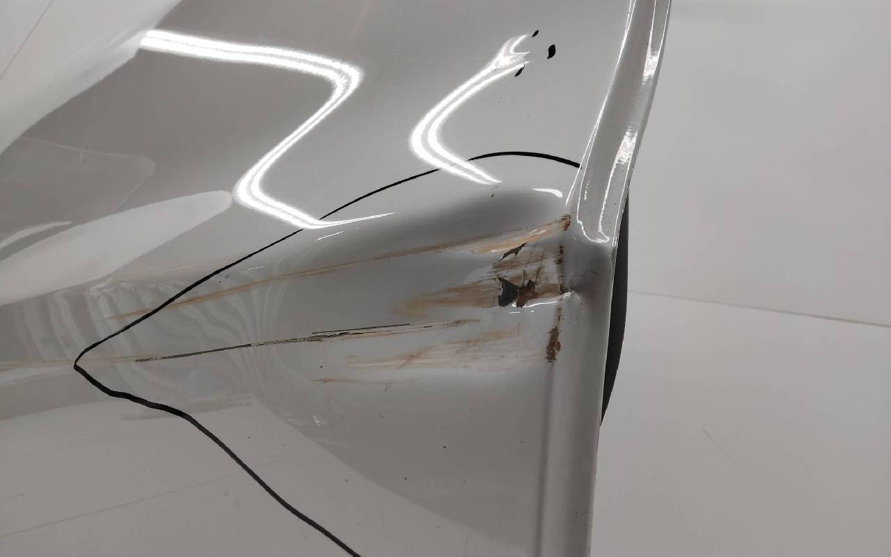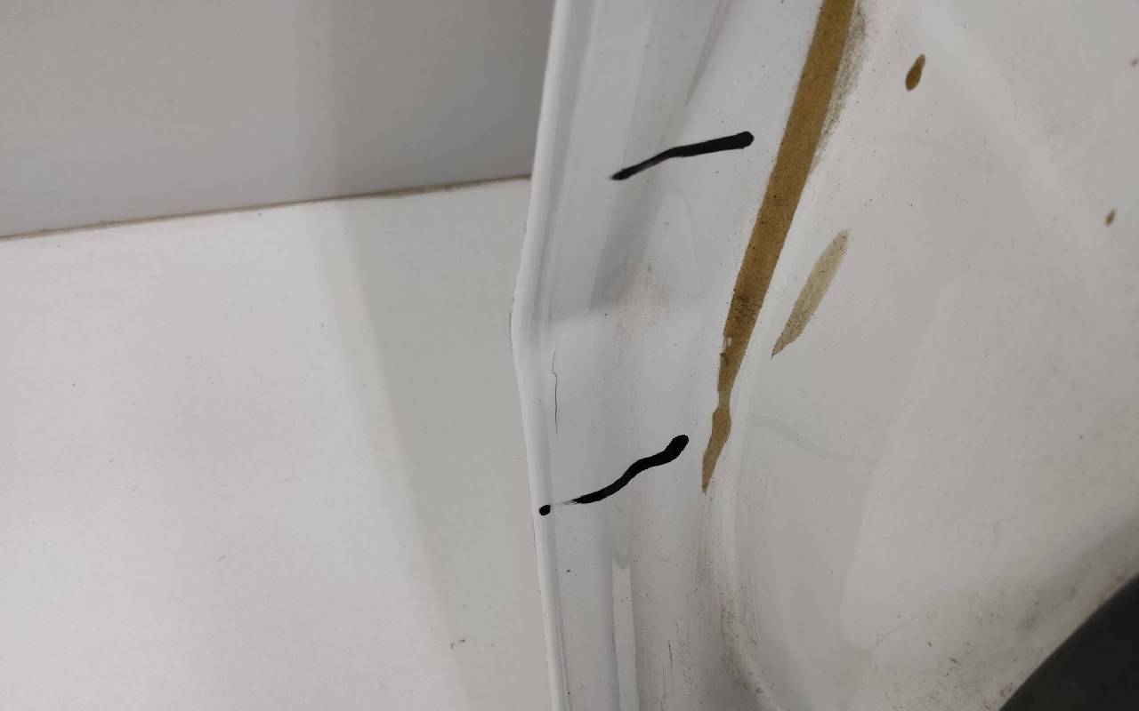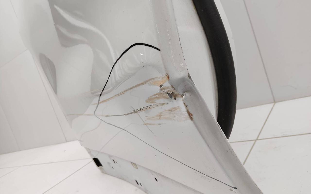 Состояние детали хорошее. Белого цвета (перламутр), скол ЛКП. Вмятина. Потребуется незначительный ремонт