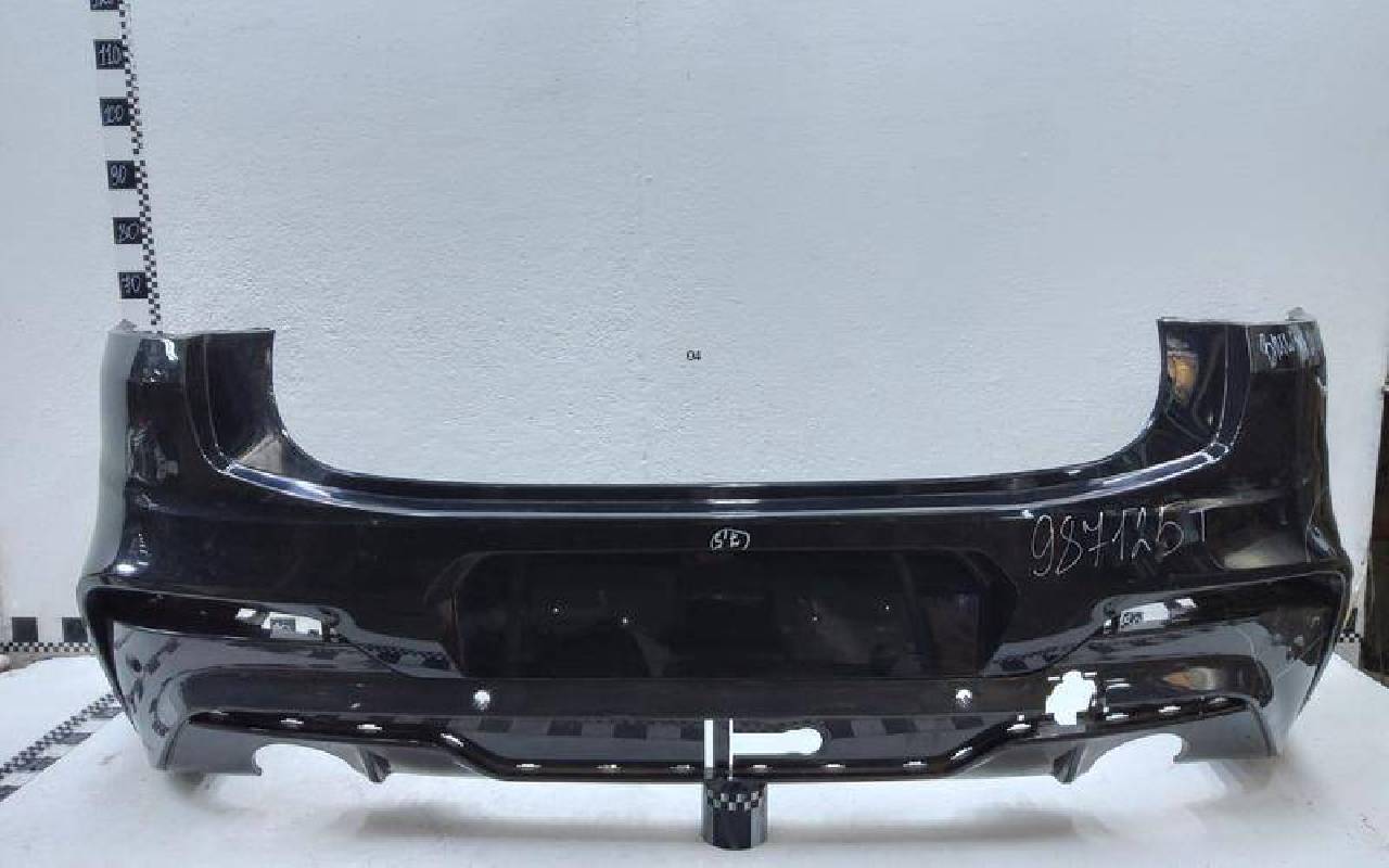 Состояние детали хорошее. Тёмно-синего цвета под парктроники. Вмятина, небольшие трещины. Крепления целые. Потребуется ремонт