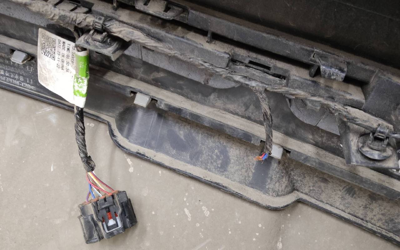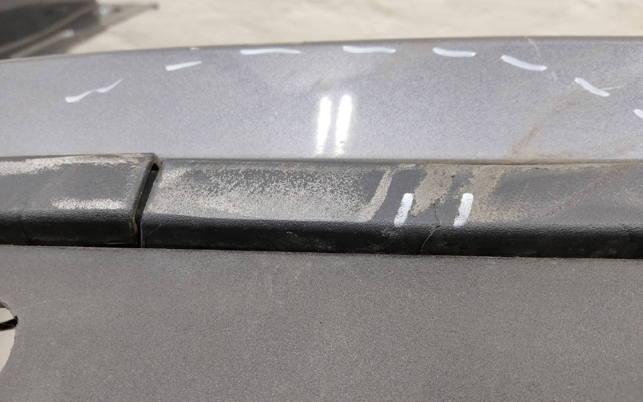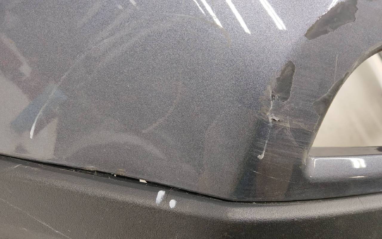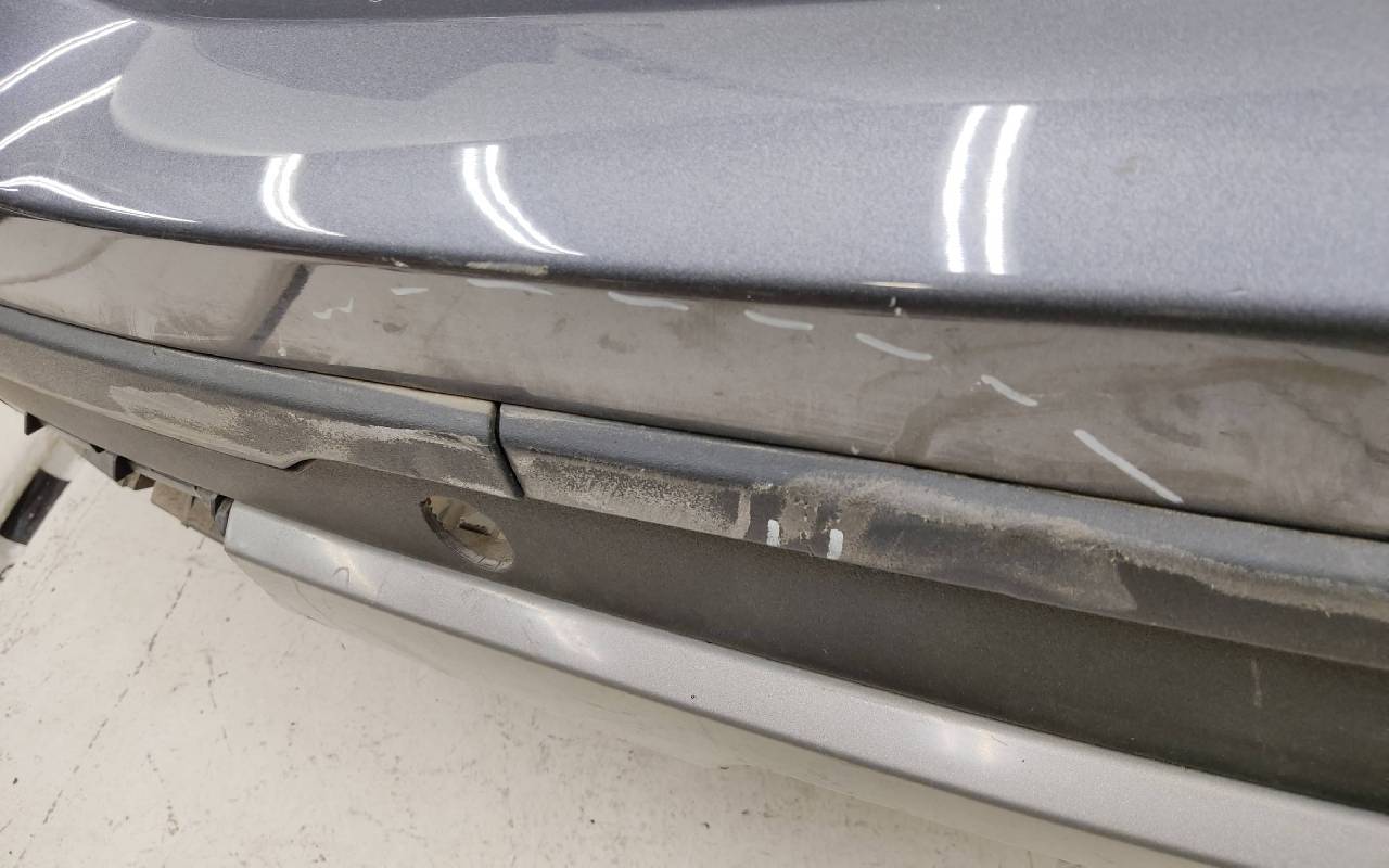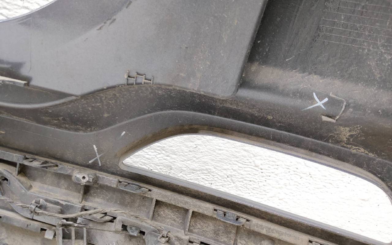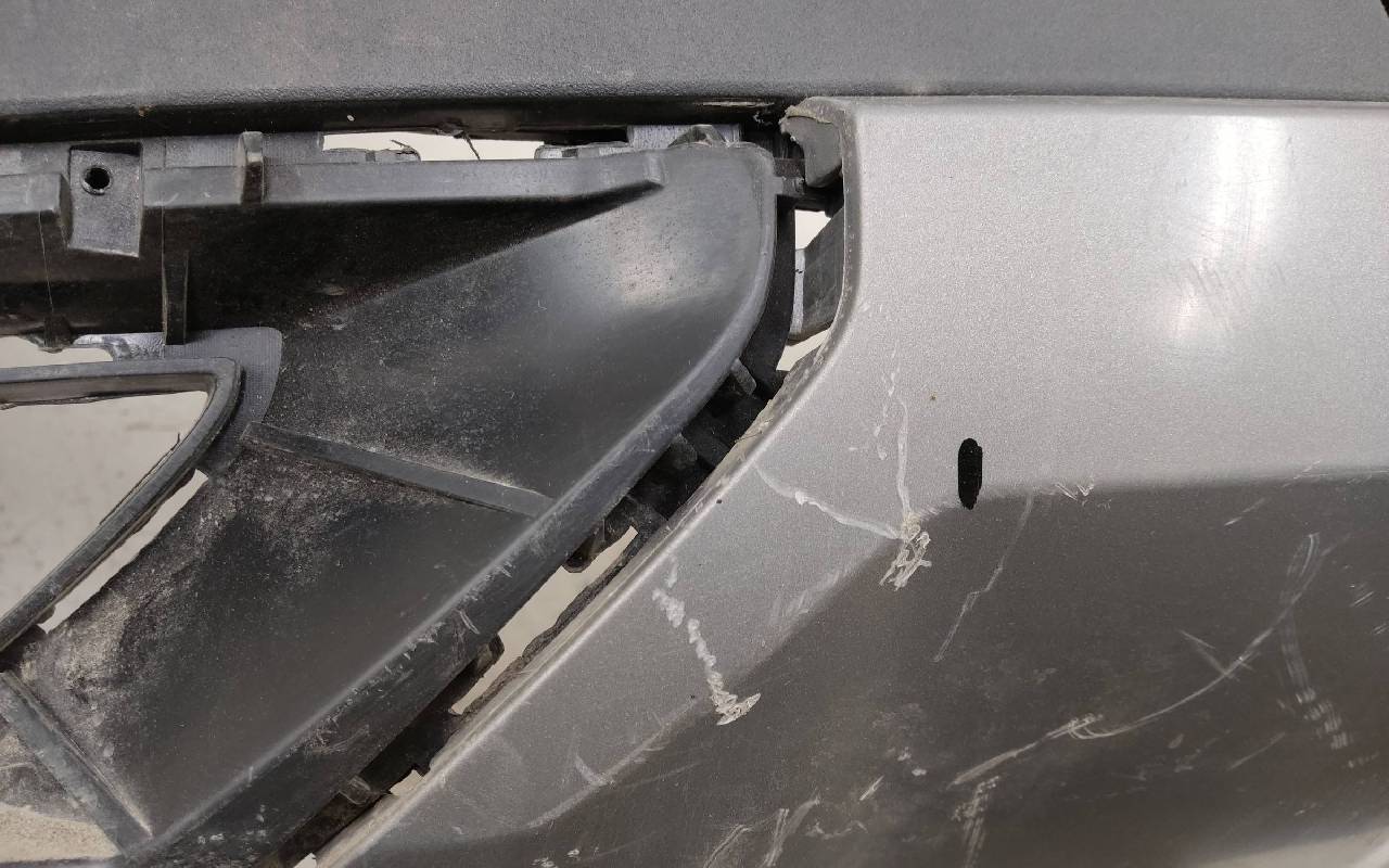 Состояние детали хорошее. Серого цвета с юбкой под парктроники. Вмятинки, царапины. Дефект пластика накладок на фото. Отсутствуют два крепления под левую ПТФ. Обрезана фишка на проводке. Потребуется незначительный ремонт