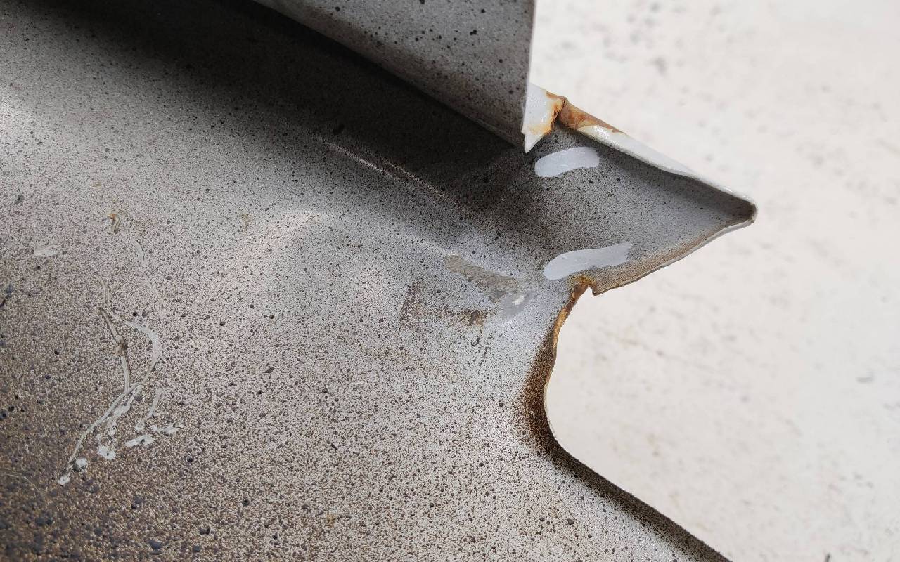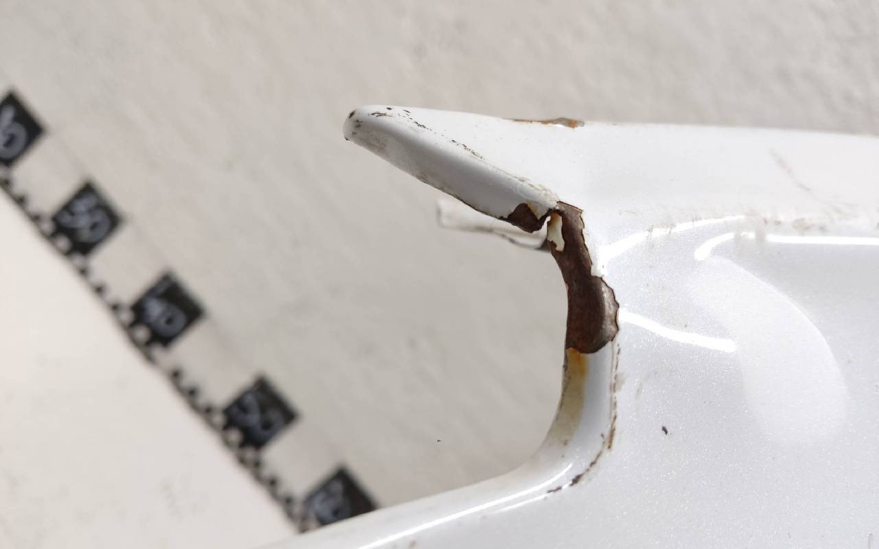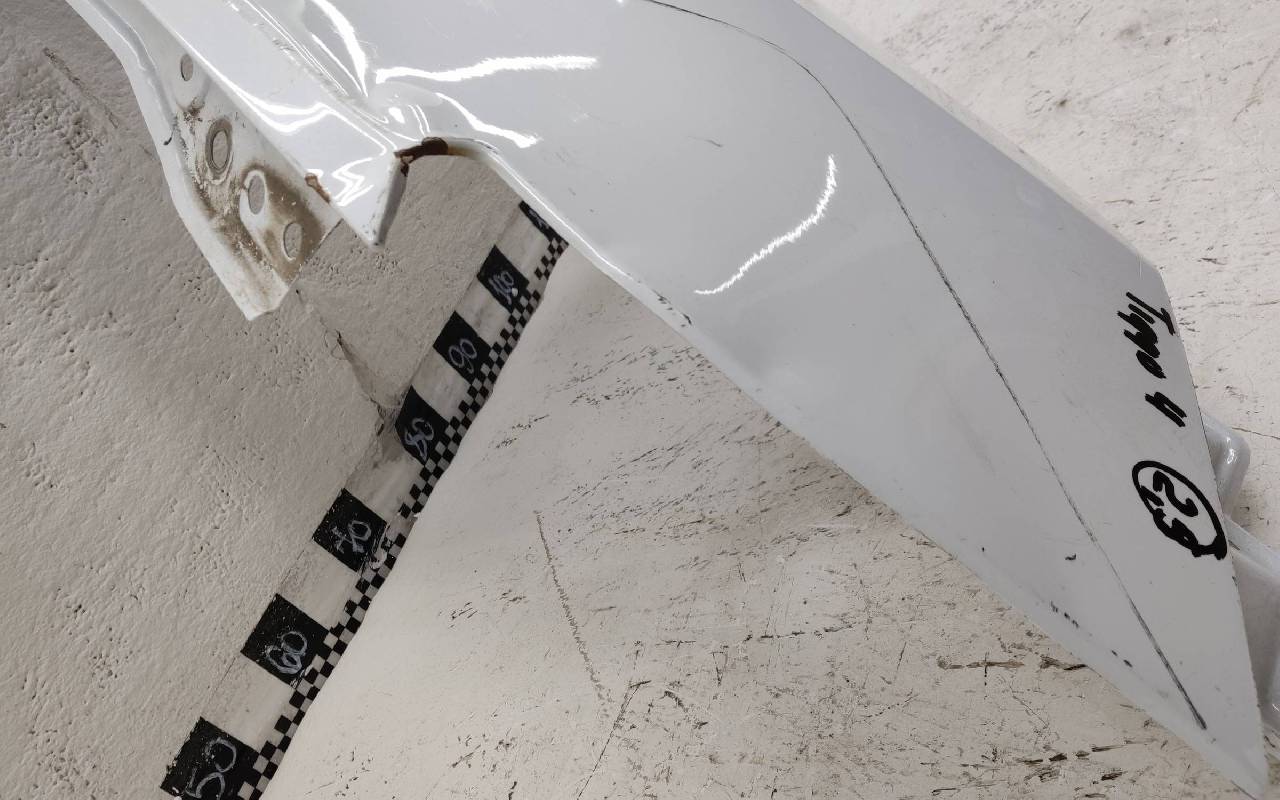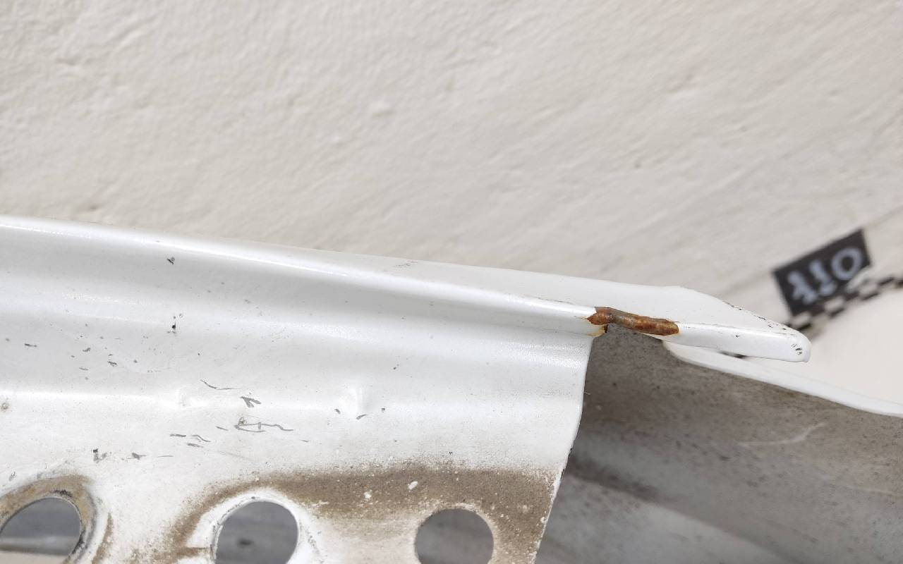 Состояние детали удовлетворительное. Белого цвета, скол ЛКП. Вмятина, дефект металла. Потребуется ремонт