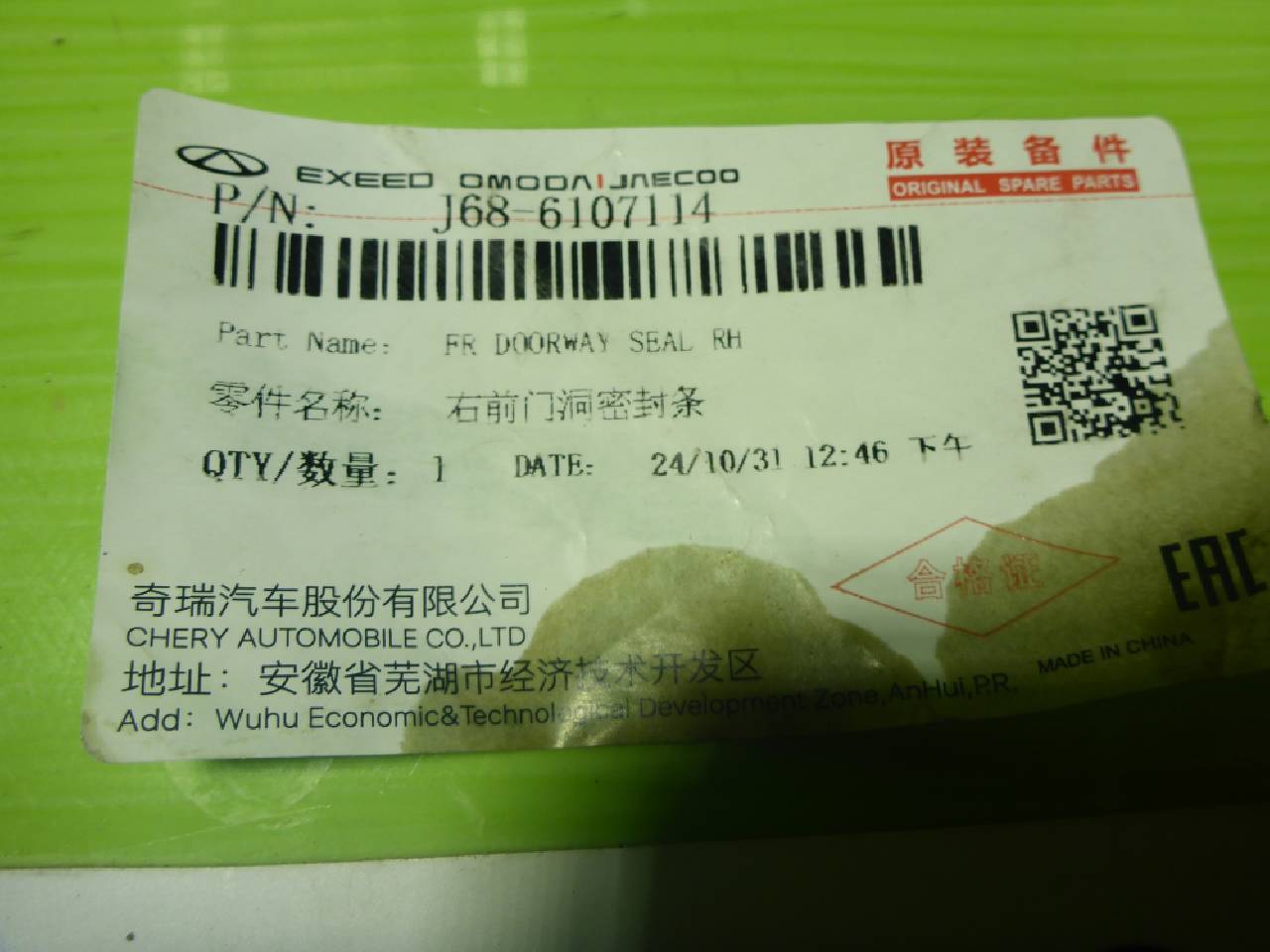 Деталь: Chery Tiggo 4 Pro - Уплотнитель двери передней правой (на кузов) (J686107114 554001484AA)