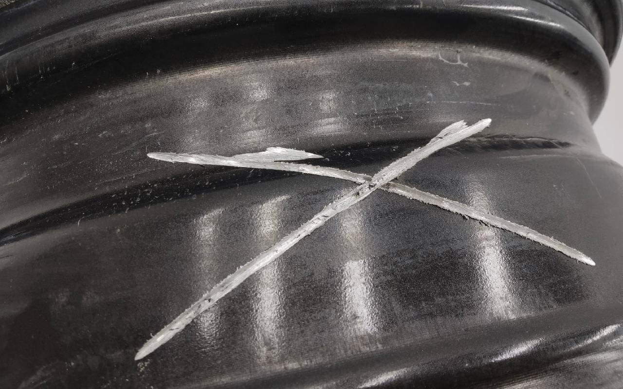 Состояние детали удовлетворительное. Серого цвета, дефект ЛКП. Надпилы по борту и на лицевой поверхности. Потребуется ремонт