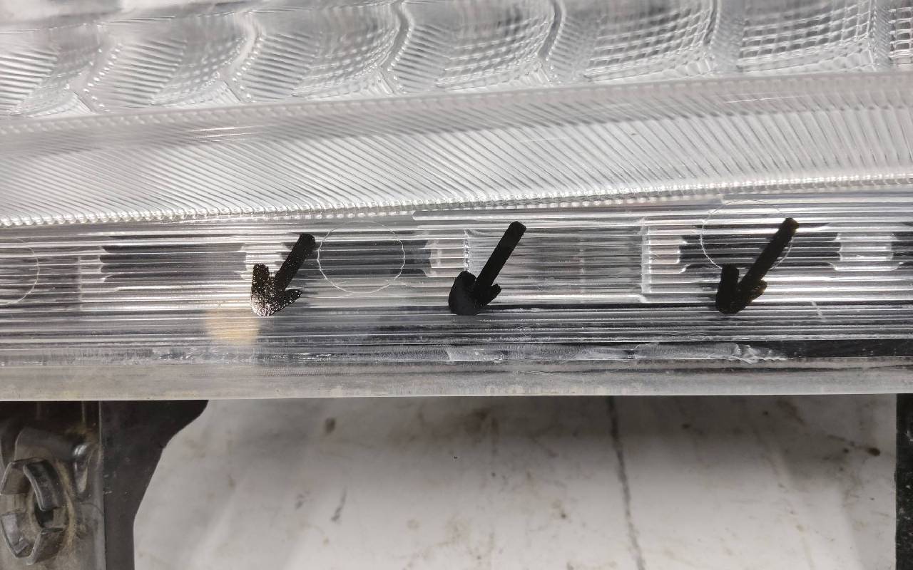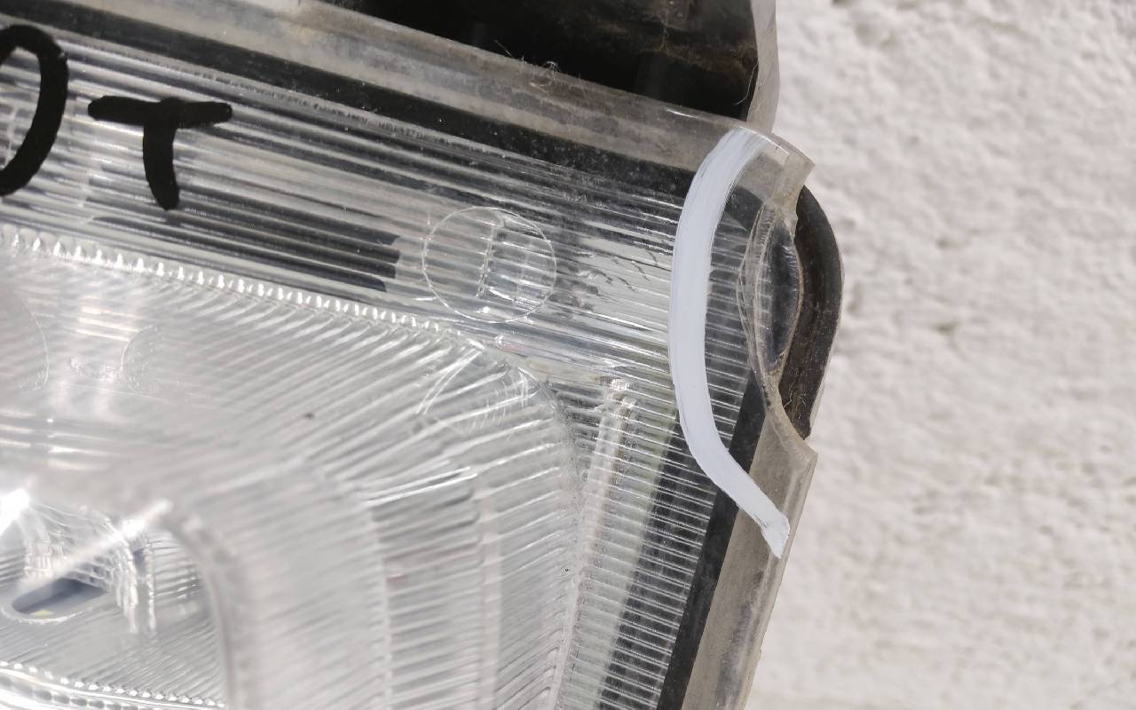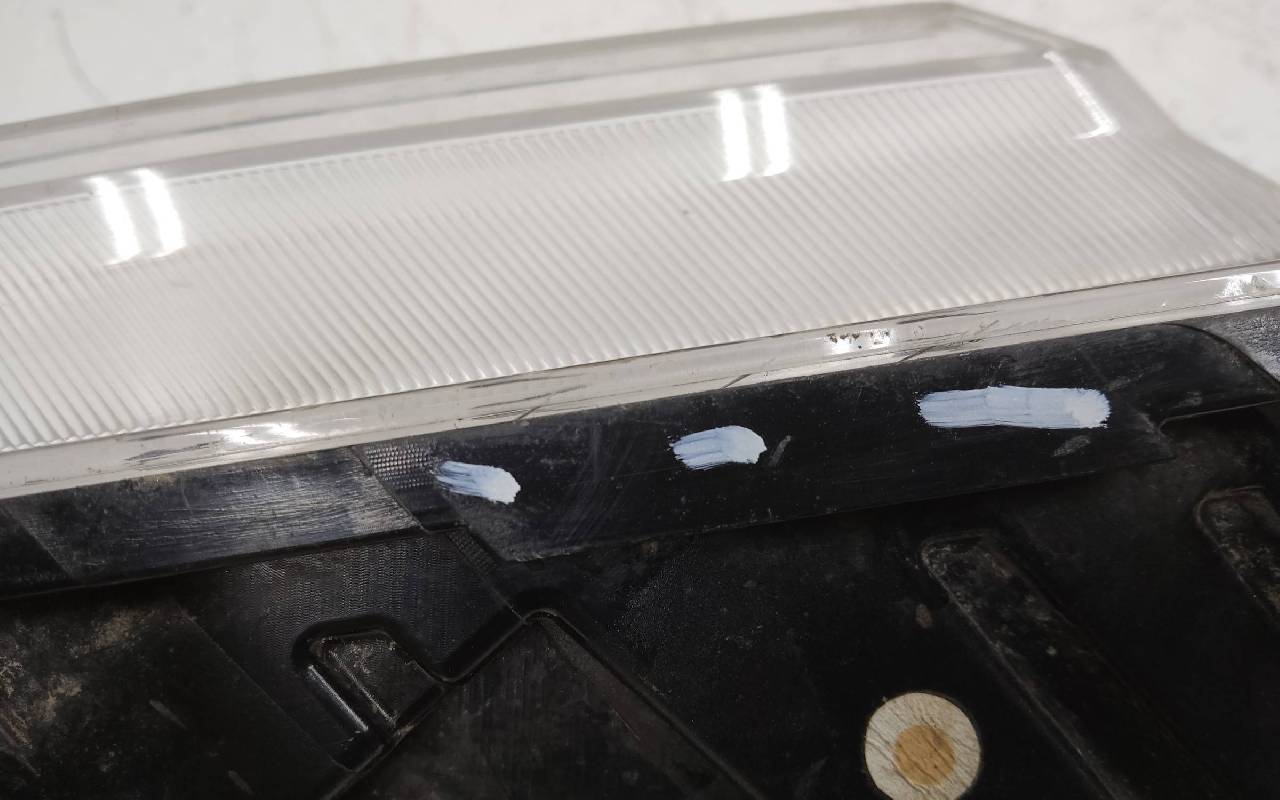 Состояние детали удовлетворительное. Скол по кромке стекла (не сквозной), трещинки на границе с корпусом. Крепления целые. Потребуется ремонт
