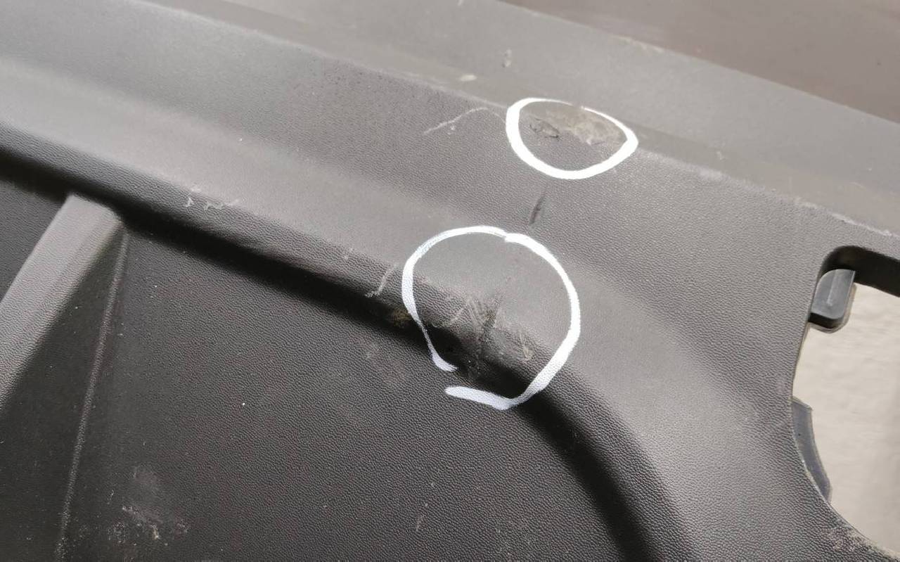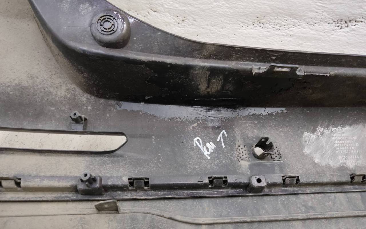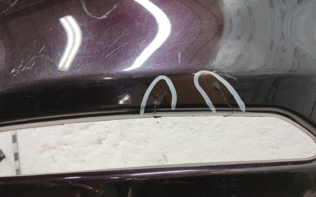 Состояние детали хорошее Chery Tiggo 8 Pro Max. Фиолетового цвета под парктроники. После небольшого ремонта, дефект пластика. Вмятинки. Отсутствует одно крепление под правую ПТФ. Потребуется незначительный дополнительный ремонт