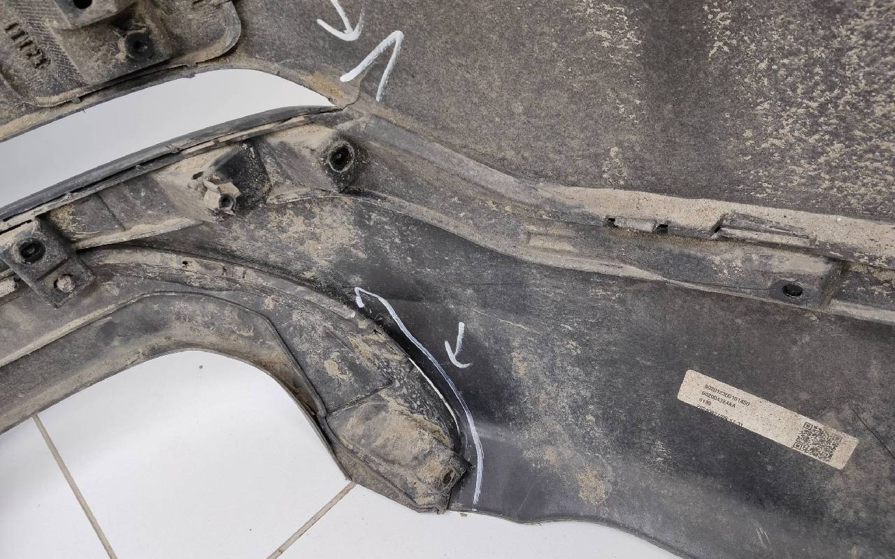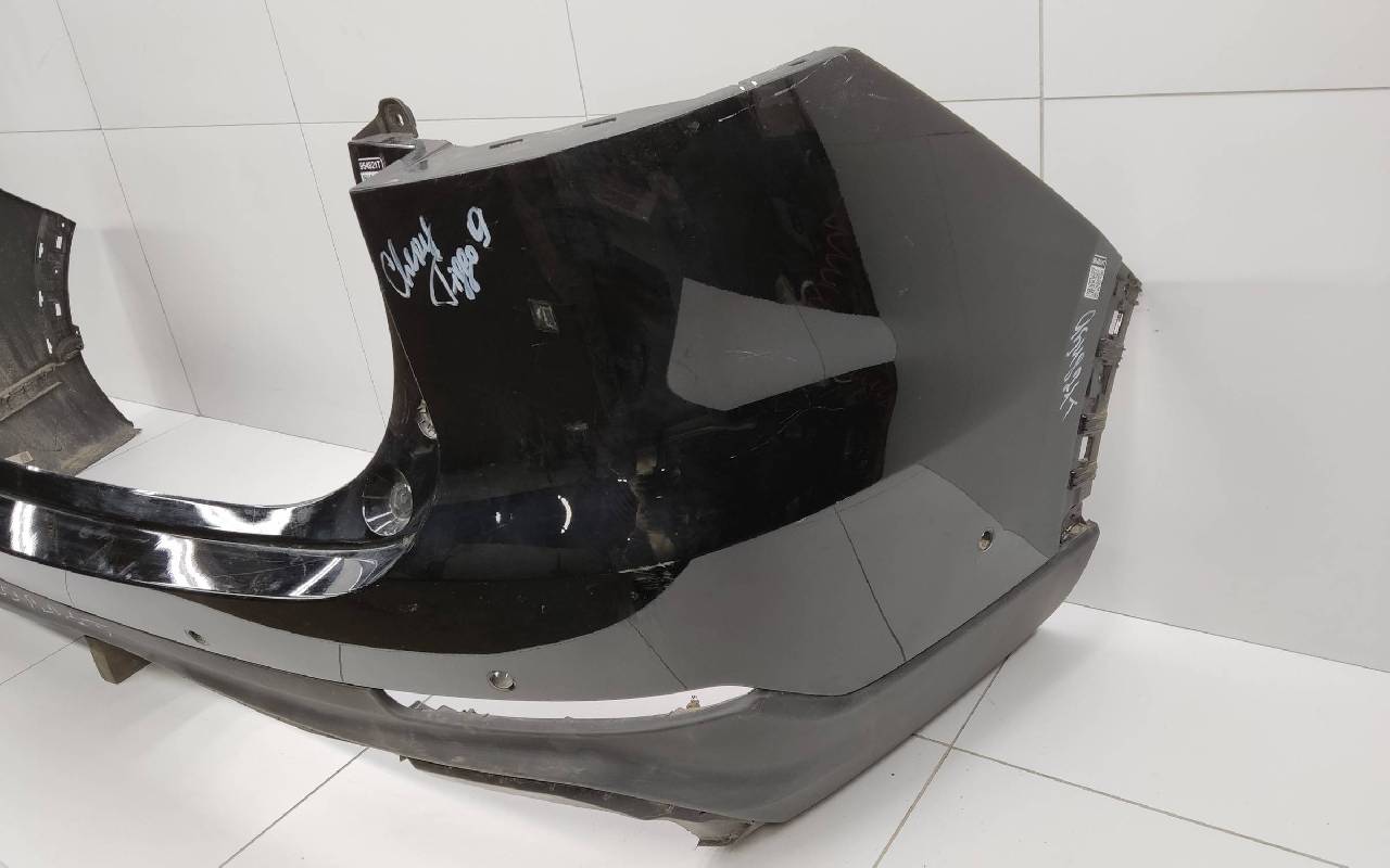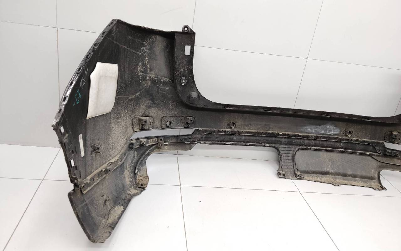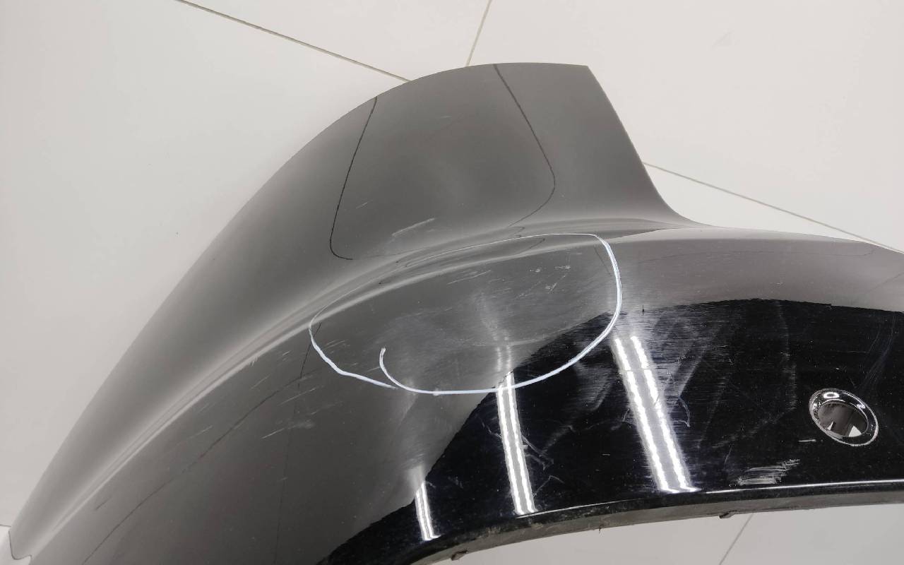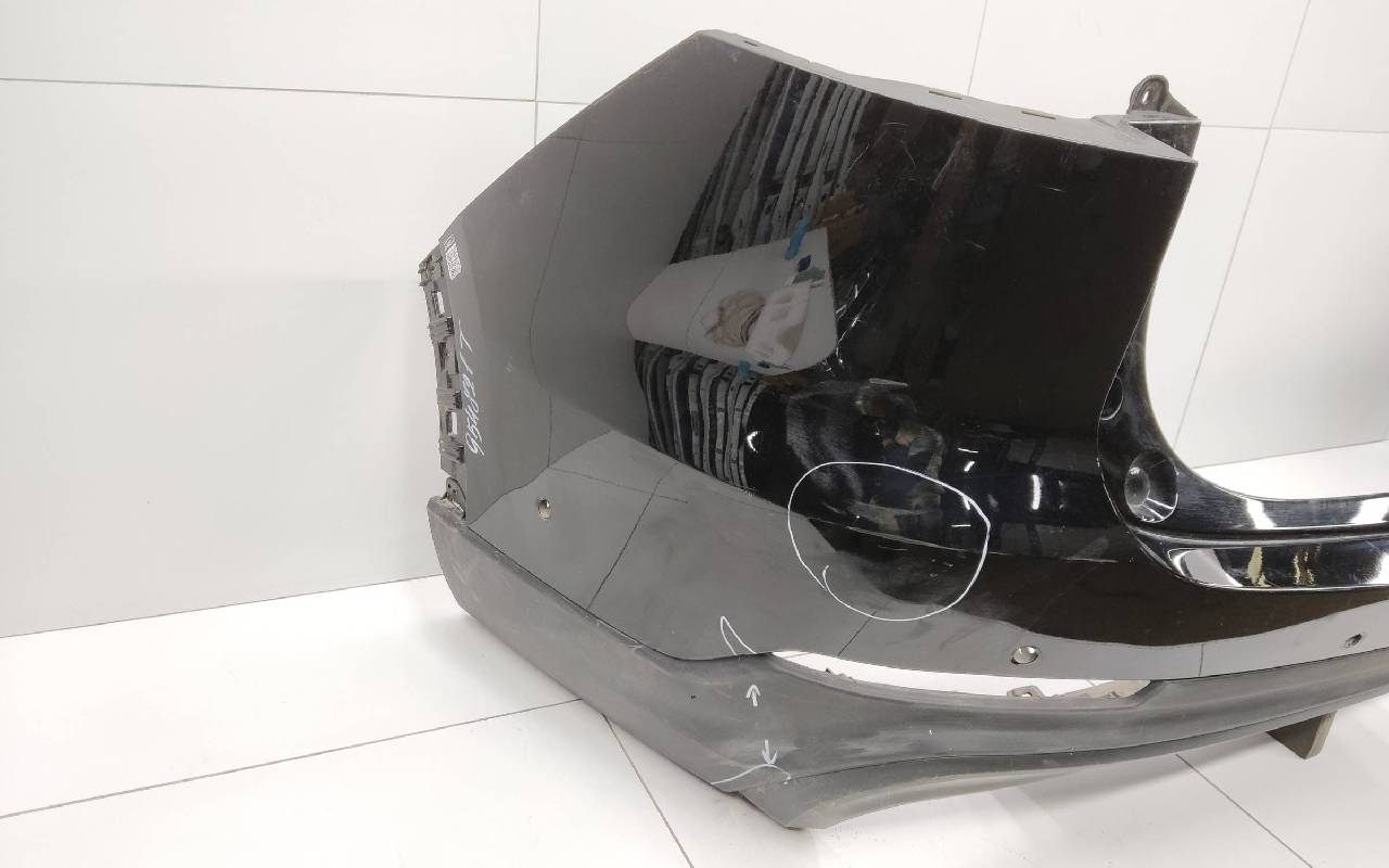 Состояние детали удовлетворительное. Чёрного цвета под парктроники. Трещины. Вмятина слева. Крепления целые. Потребуется ремонт