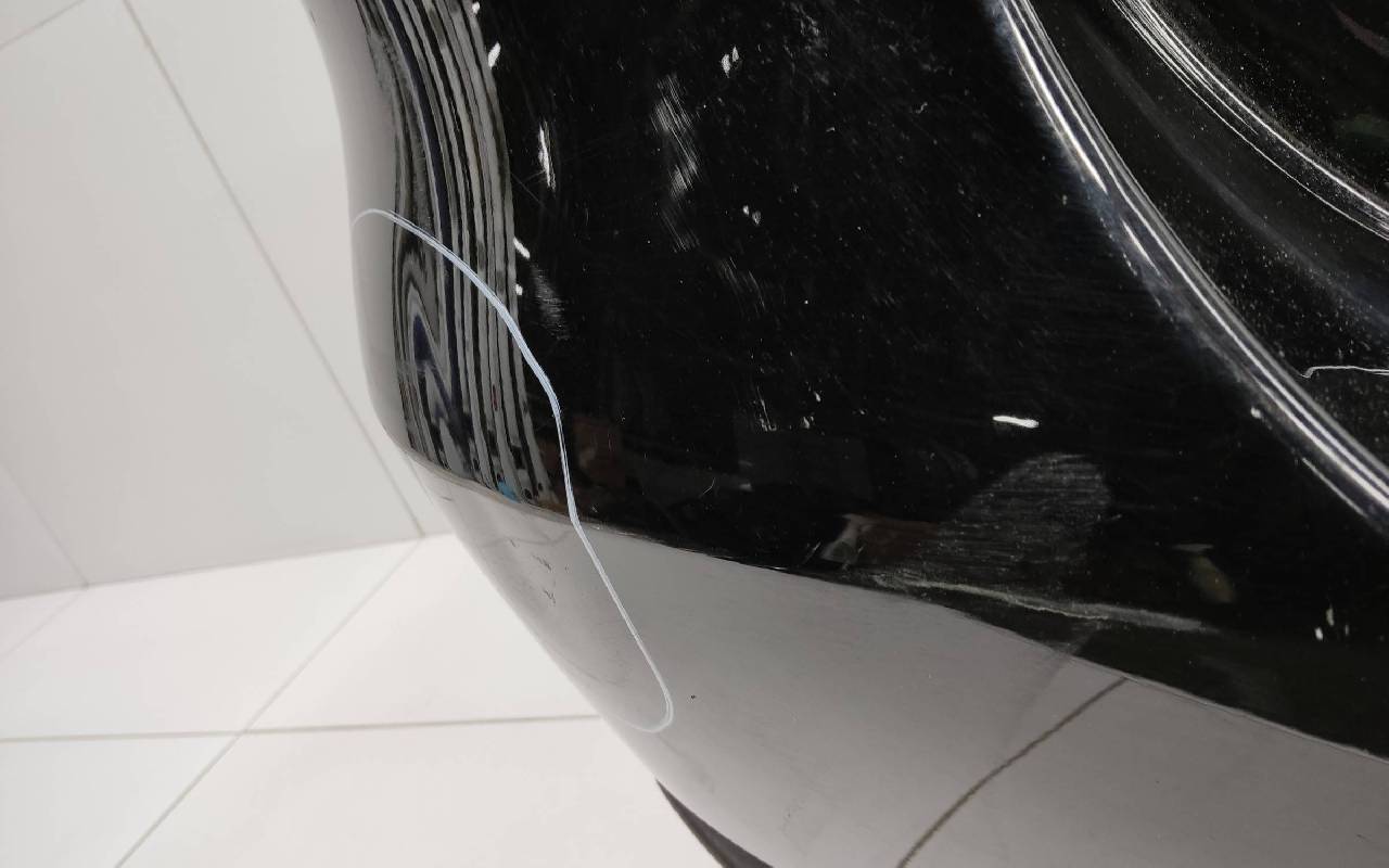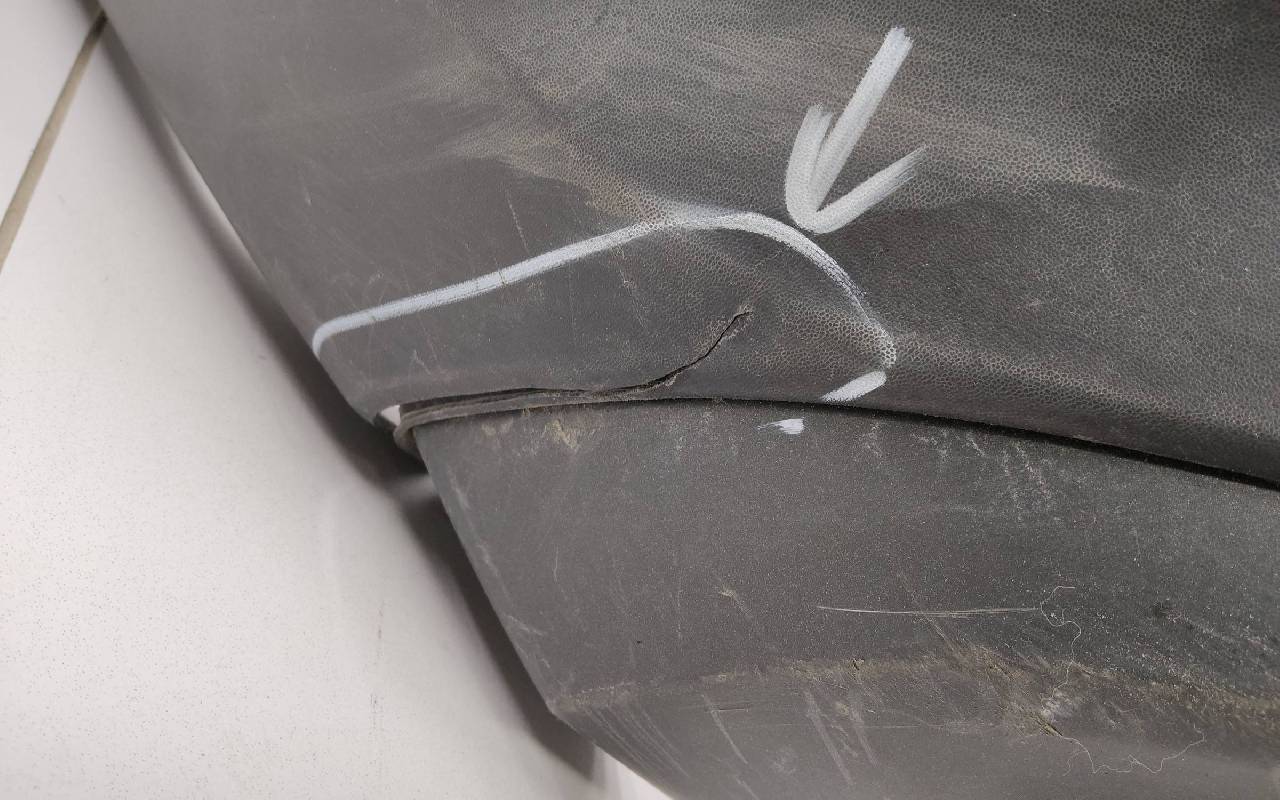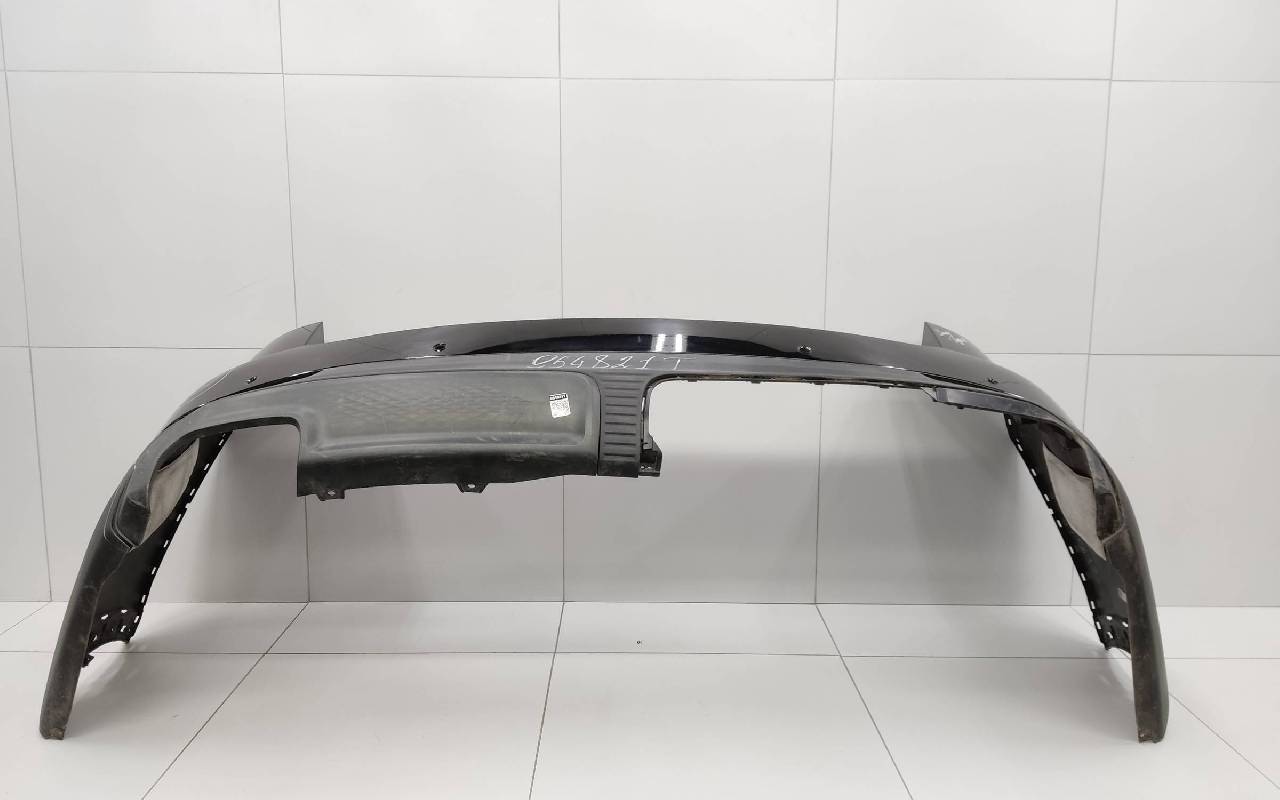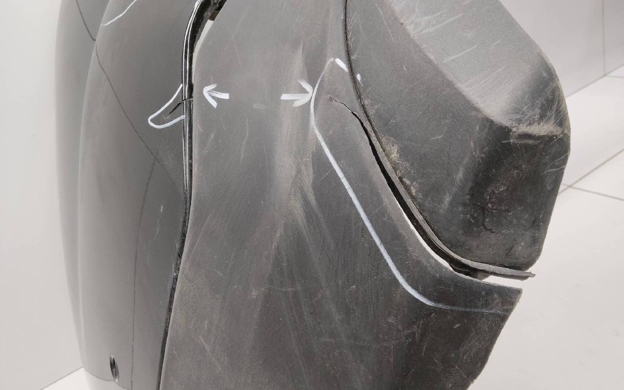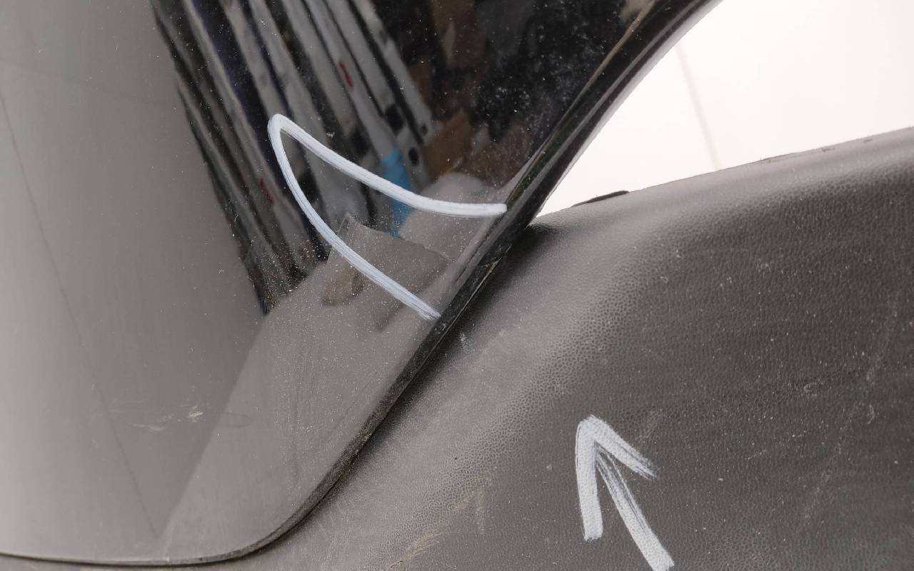 Состояние детали удовлетворительное. Чёрного цвета под парктроники. Трещины. Вмятина слева. Крепления целые. Потребуется ремонт