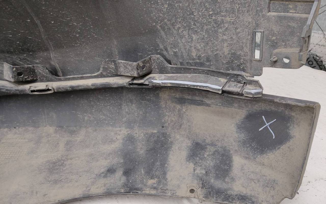 Состояние детали удовлетворительное. Серого цвета под парктроники, небольшие трещины. Юбка порвана, небольшие сколы на каркасе решетки радиатора на внутренней поверхности. Отсутствует одно крепление на юбке, дефект кронштейна на фото. Потребуется ремонт