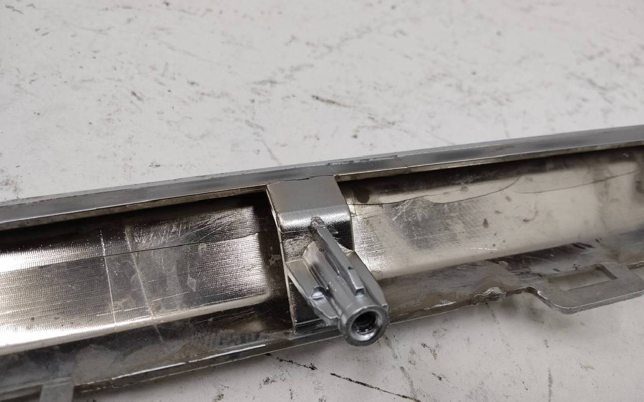 Состояние детали удовлетворительное. Вздутие хрома, небольшие трещина на внутренней поверхности. Крепления целые. Потребуется ремонт