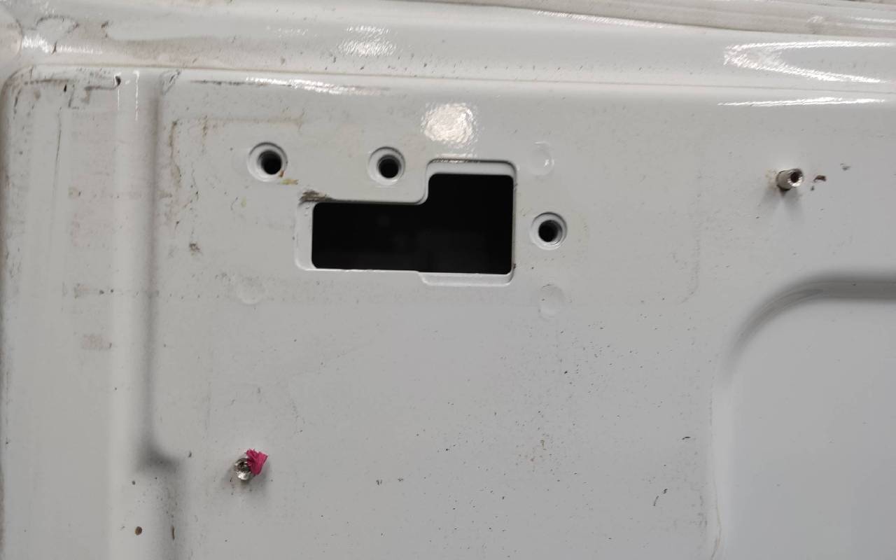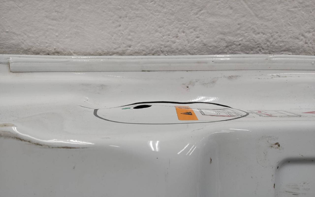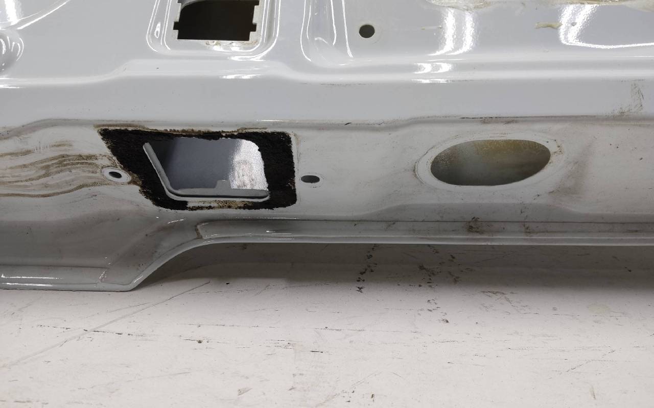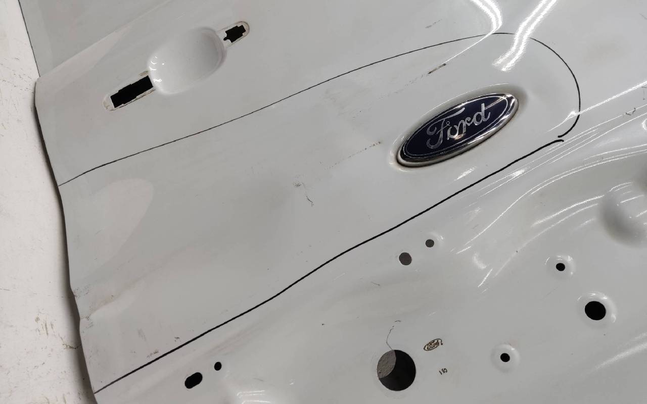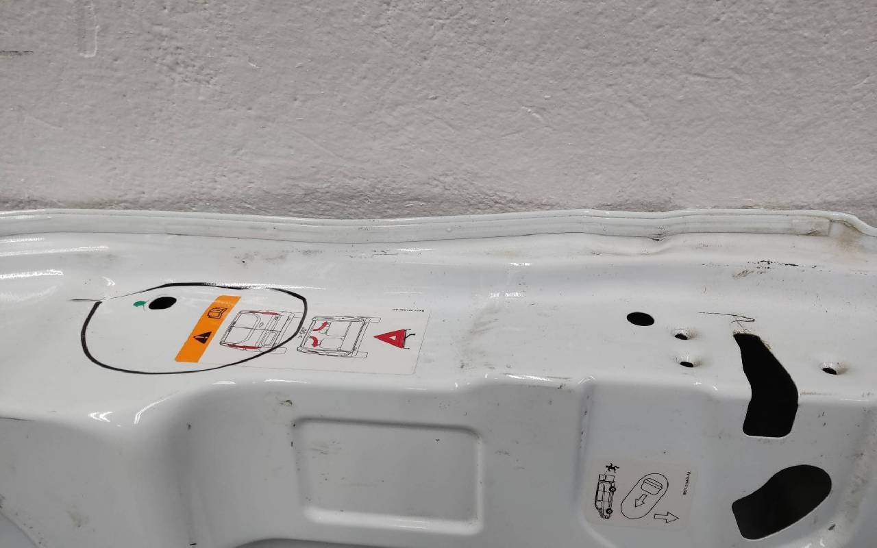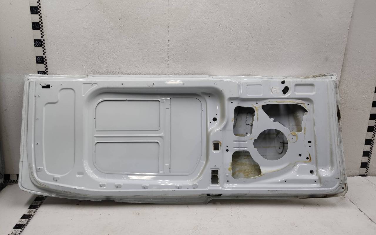 Состояние детали хорошее. Белого цвета, скол ЛКП. Вмятина на лицевой поверхности и по торцу над замком. Потребуется ремонт