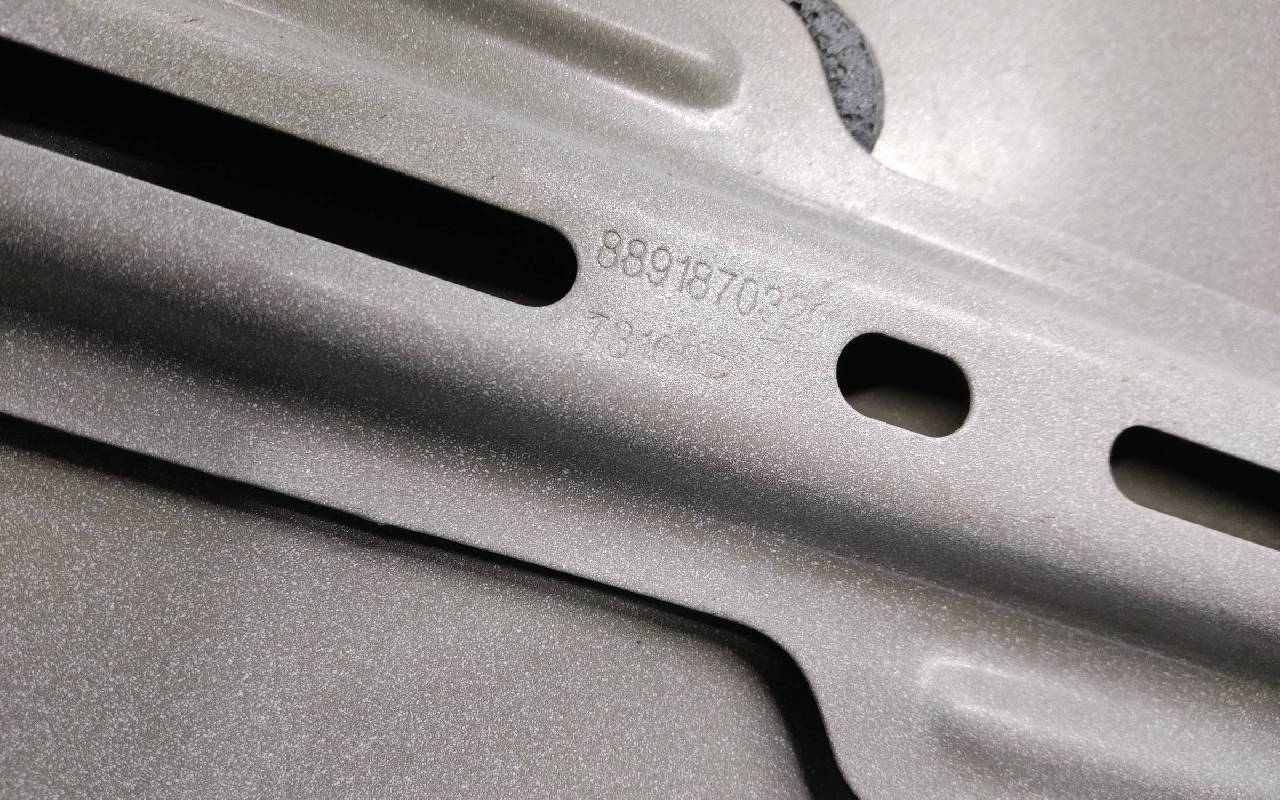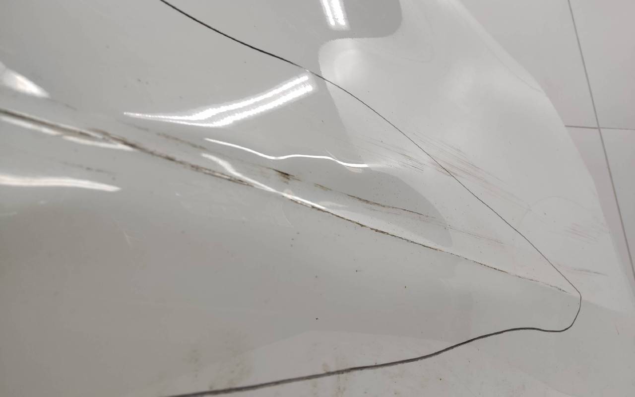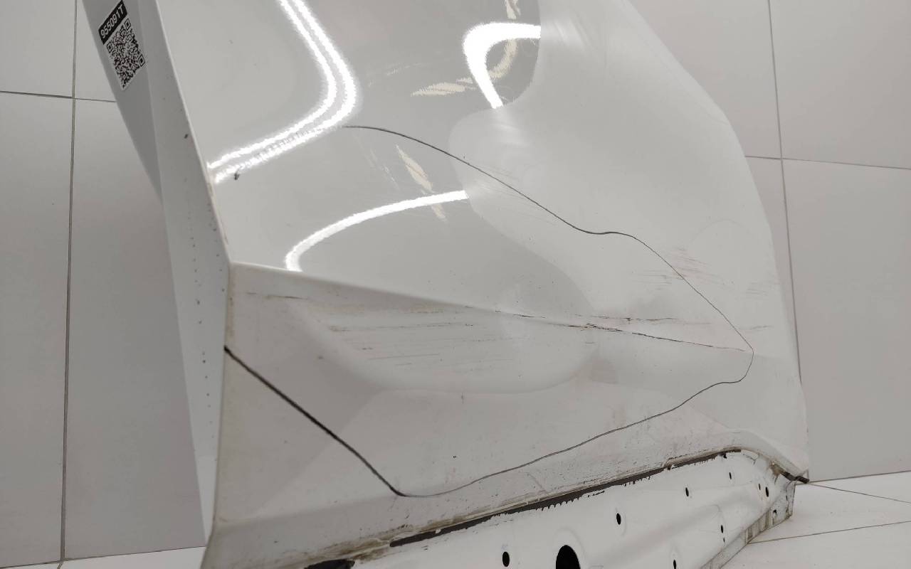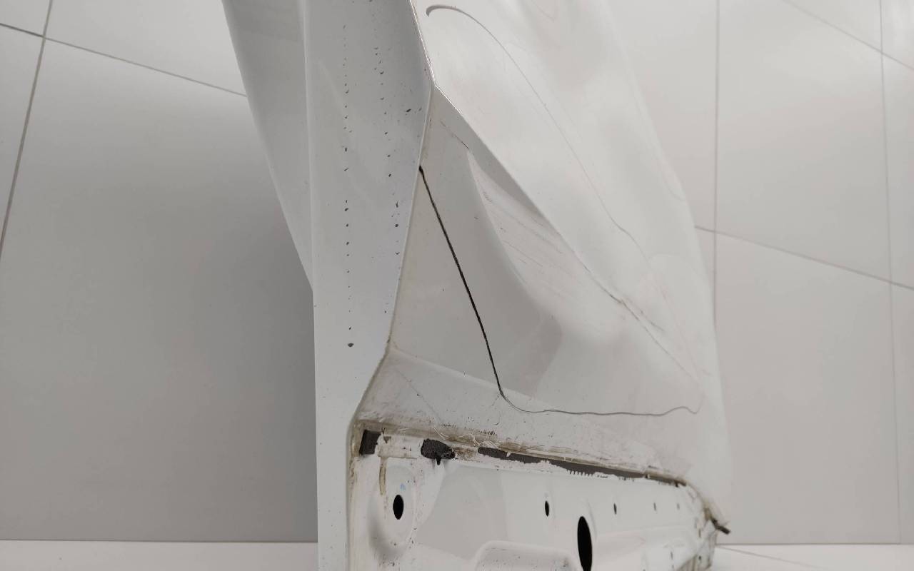 Состояние детали удовлетворительное. Белого цвета, скол ЛКП. Вмятина. Потребуется ремонт