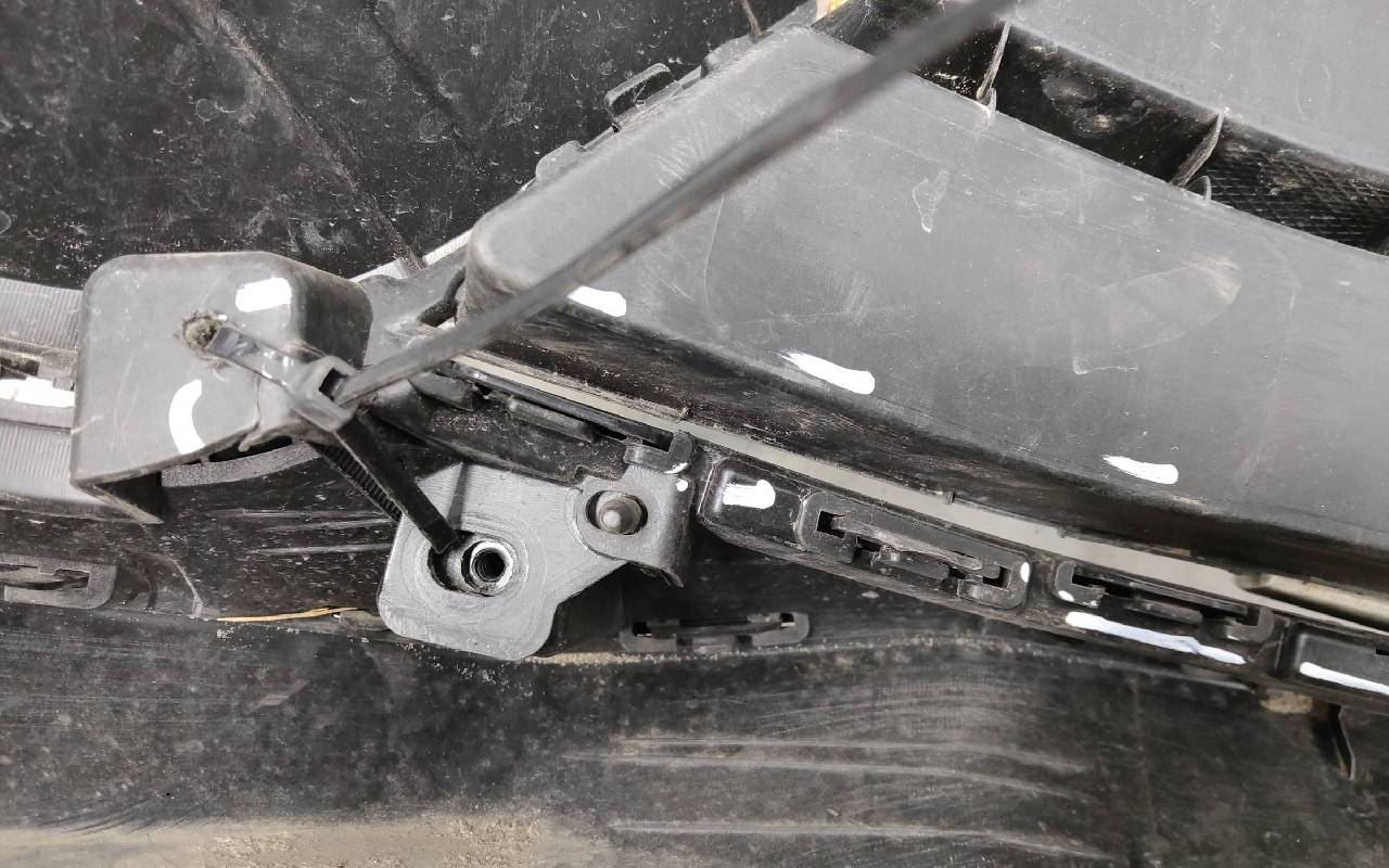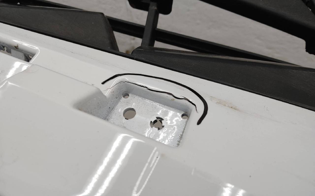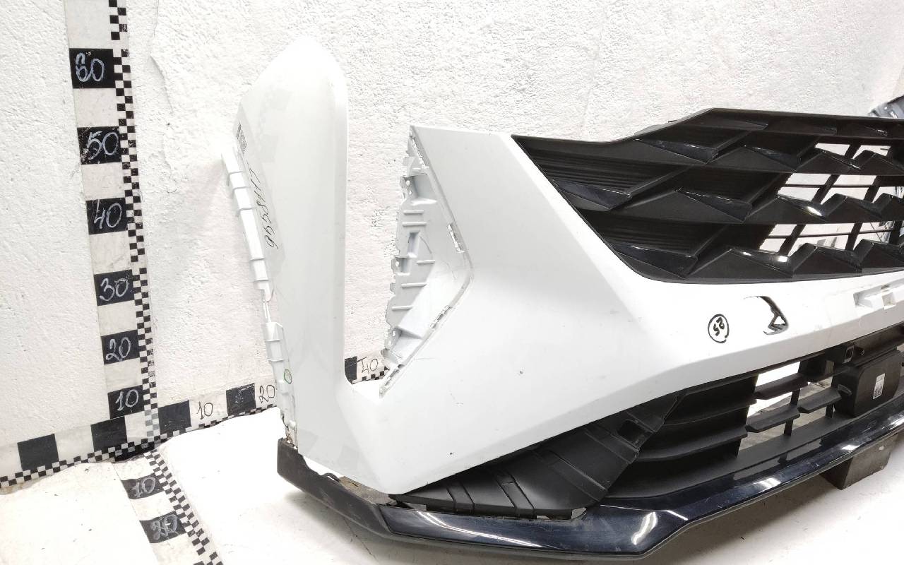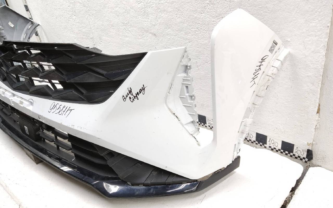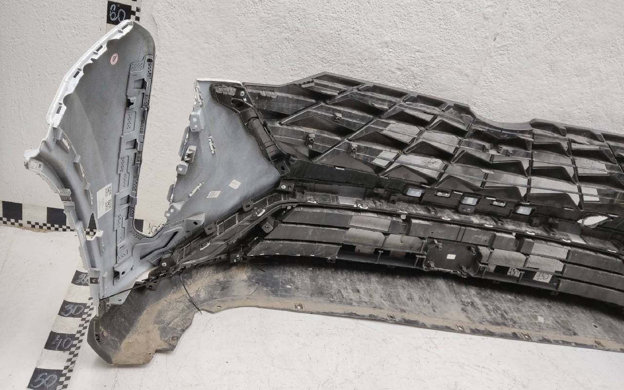 Состояние детали удовлетворительное. Белого цвета. Вмятинки, небольшие трещины. Верхняя решетка по сколами. Дефект пластика вдоль кронштейна нижней решетки к юбке. Потребуется ремонт