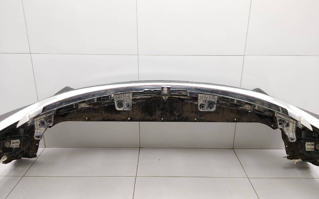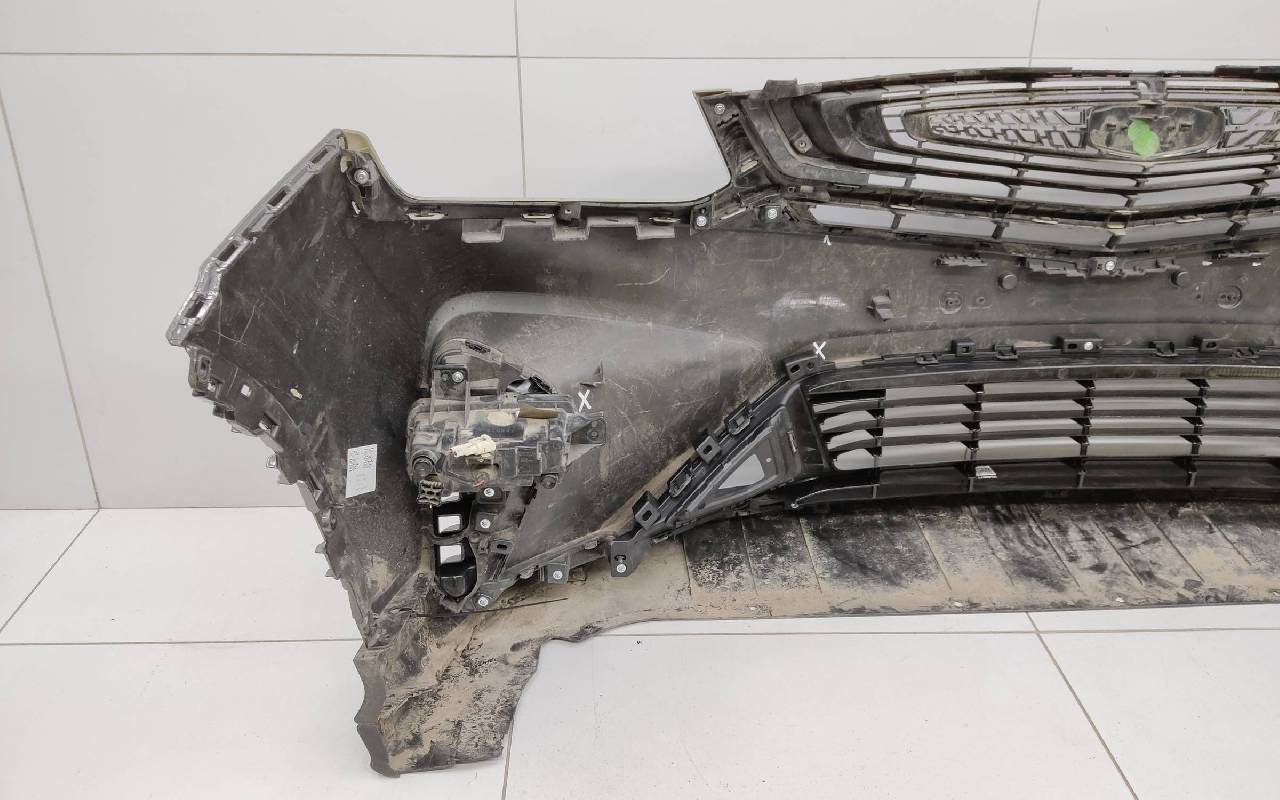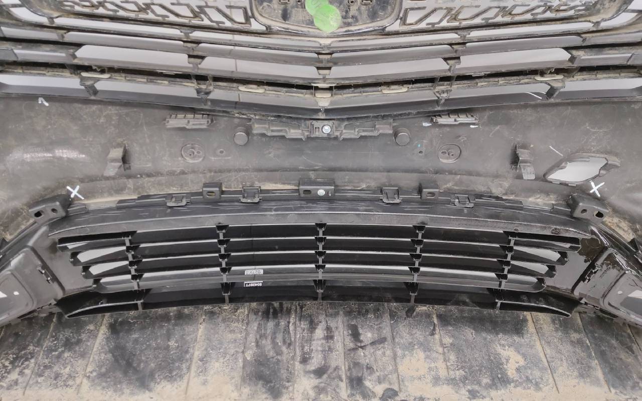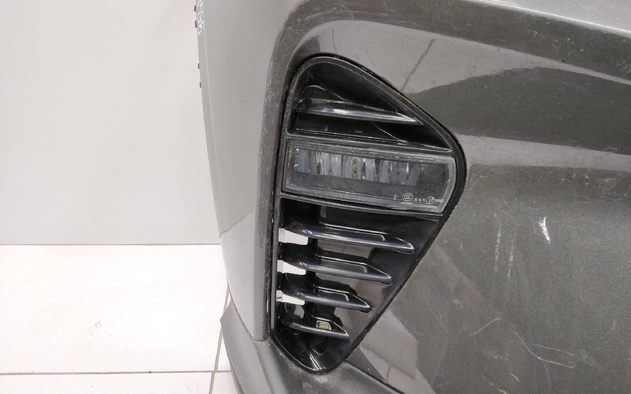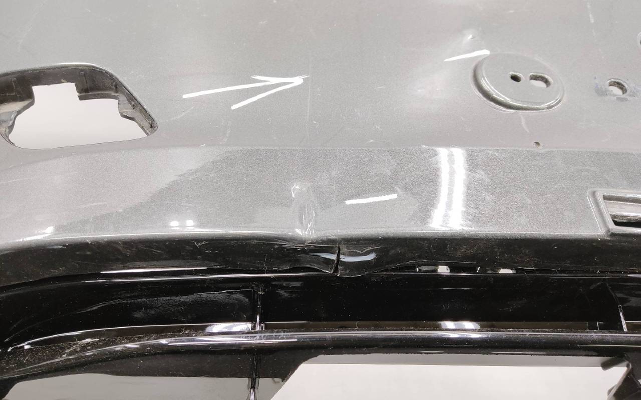 Состояние детали хорошее. Серого цвета в сборе без накладок нижней решетки. Небольшой дефект пластика на фото, трещинки на решетке. Рамки и решетка бампера не оригинал. Отсутствует одно крепление под левую ПТФ, два под нижнюю решетку и замок под правую накладку. Потребуется незначительный ремонт