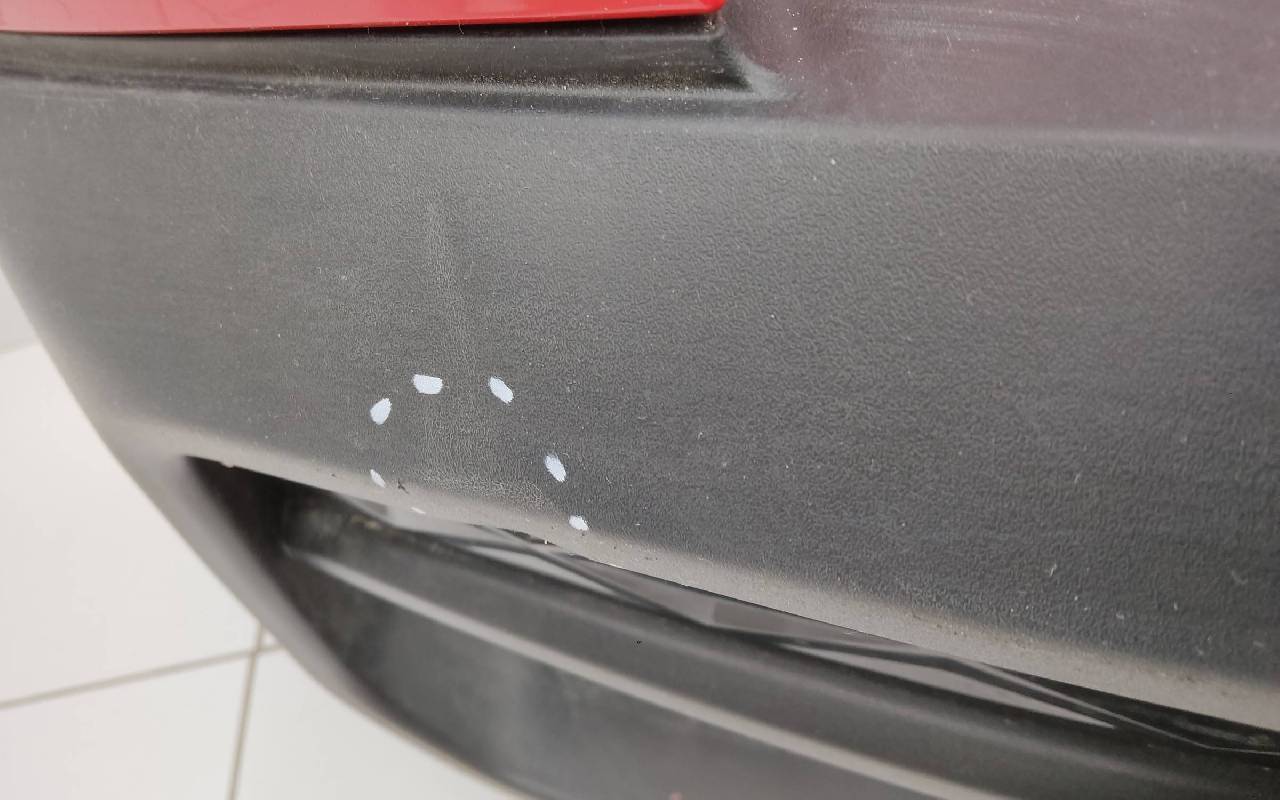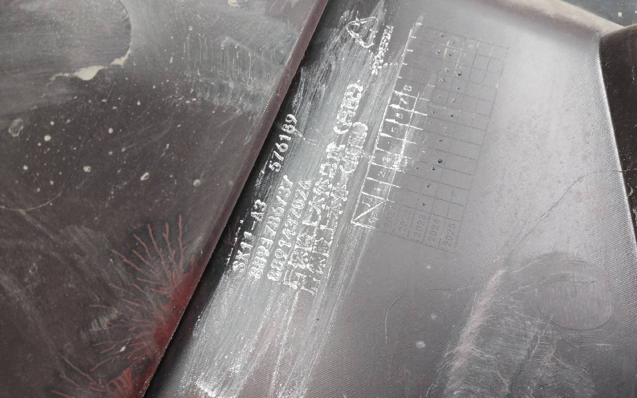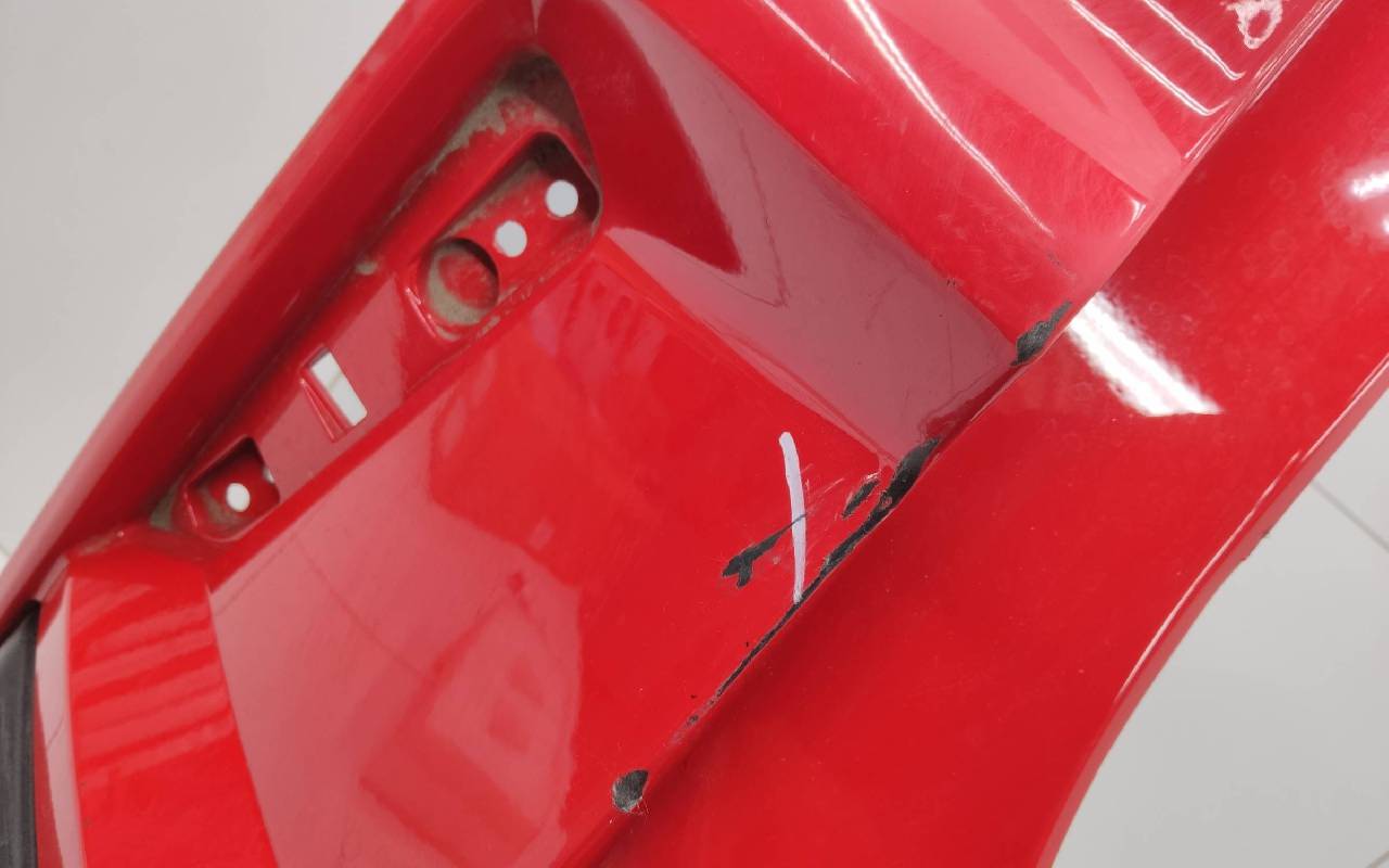 Состояние детали хорошее. Красного цвета под парктроники. Трещинка по кромке слева под фонарем и на накладке, царапины. Вмятинка на нижней части. Проводка с дефектом. Лопнули два замка по бокам, отсутствует один под нижнюю часть. Потребуется незначительный ремонт