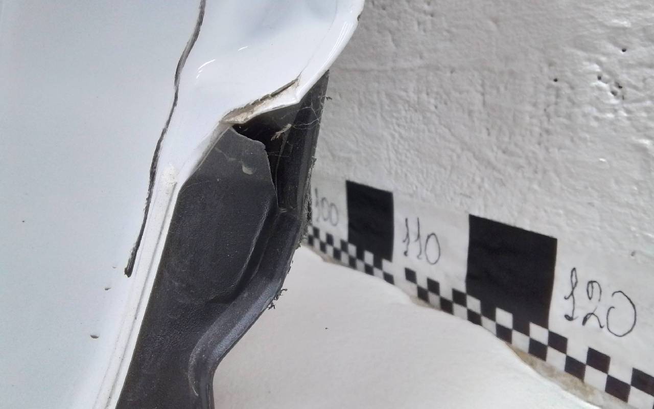 Состояние детали удовлетворительное. Белого цвета, скол ЛКП, трещина на накладке. Вмятина, дефект на внутренней поверхности. Потребуется ремонт