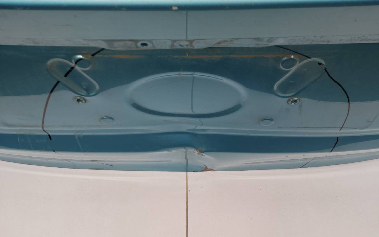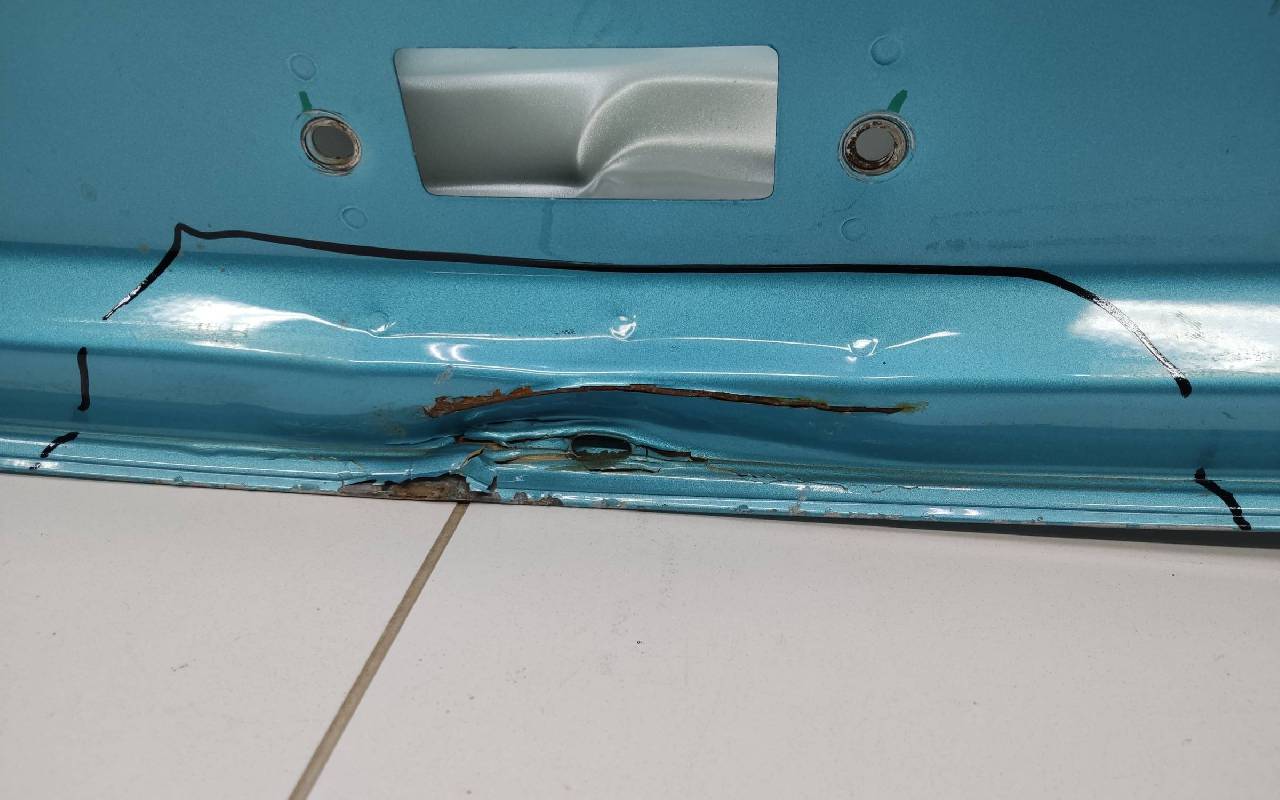 Состояние детали удовлетворительное. Голубого цвета, скол ЛКП. Вмятины в нижней части и на внутренней поверхности. Потребуется ремонт