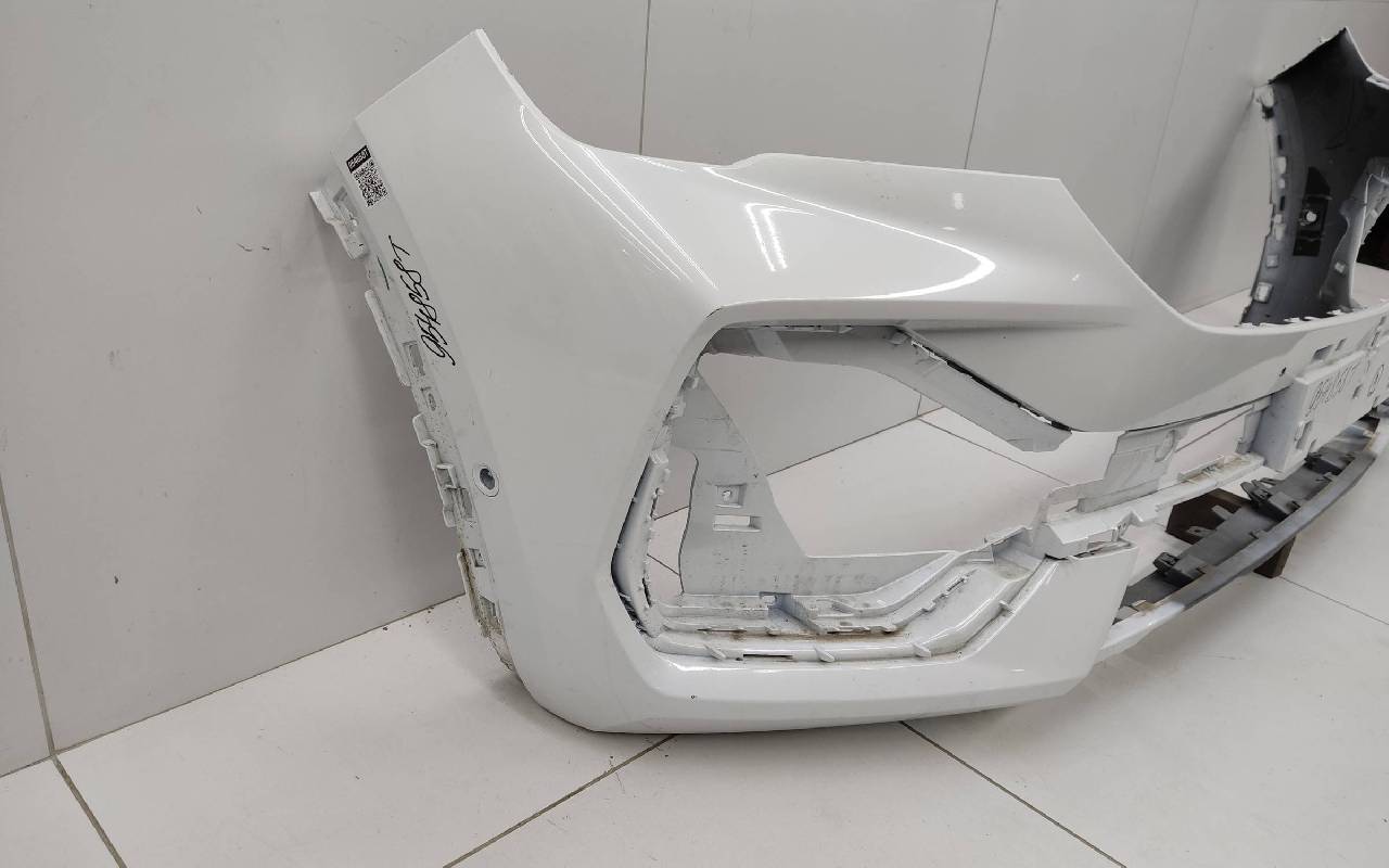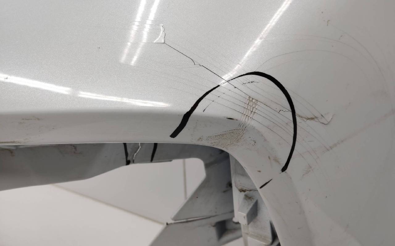 Состояние детали хорошее. Белого цвета под парктроники. Вмятинка, небольшая трещина в проёме под левую решётку. Крепления целые. Потребуется незначительный ремонт