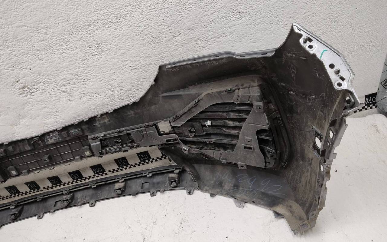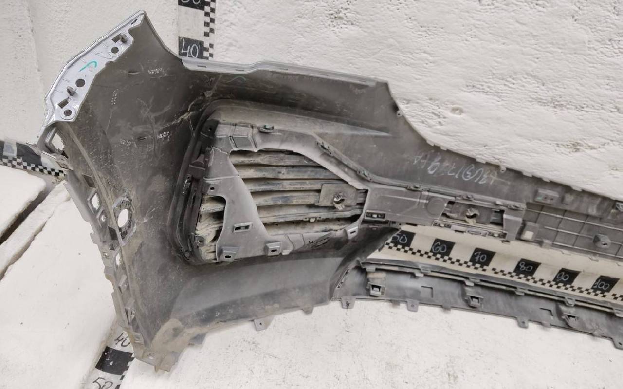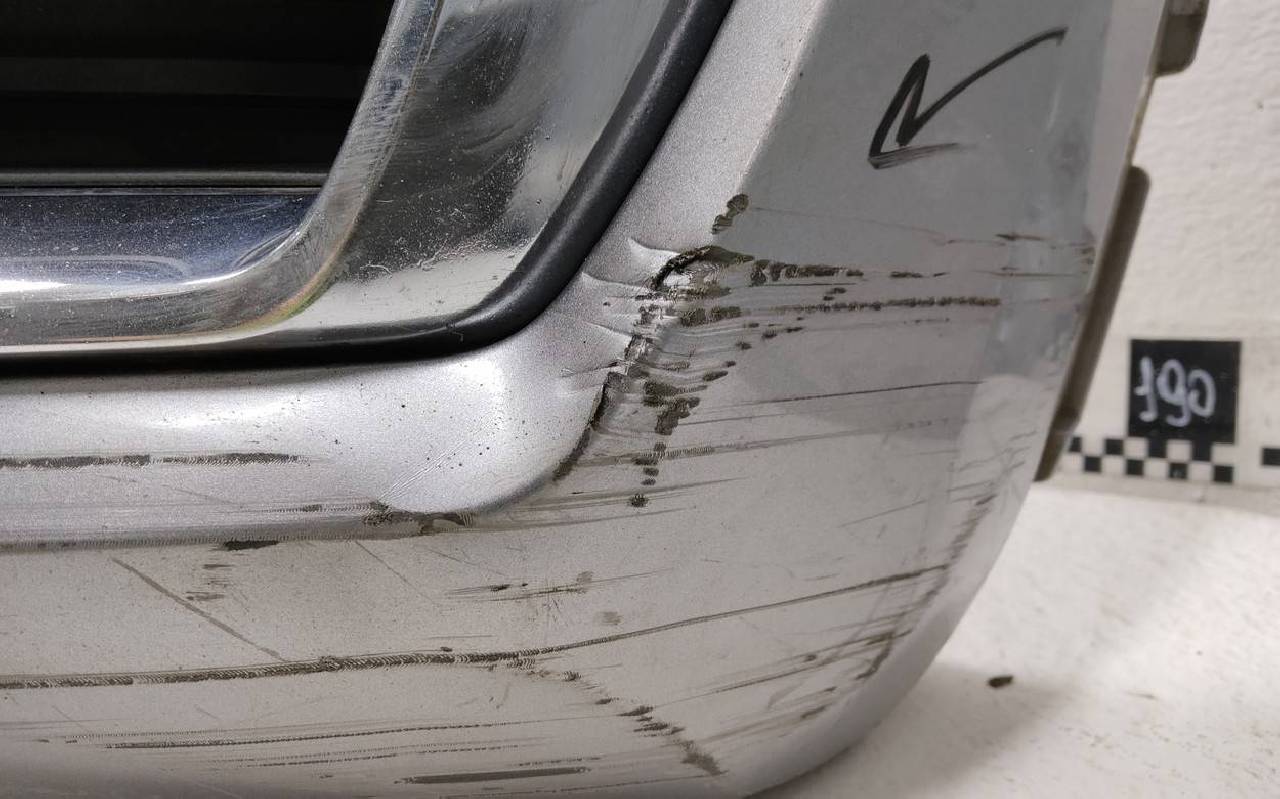 Состояние детали хорошее. Серого цвета под парктроники (кронштейны в комплекте). Вмятина, царапины. Вздутие хрома, трещины на левой и нижней накладках. Крепления целые. Потребуется незначительный ремонт