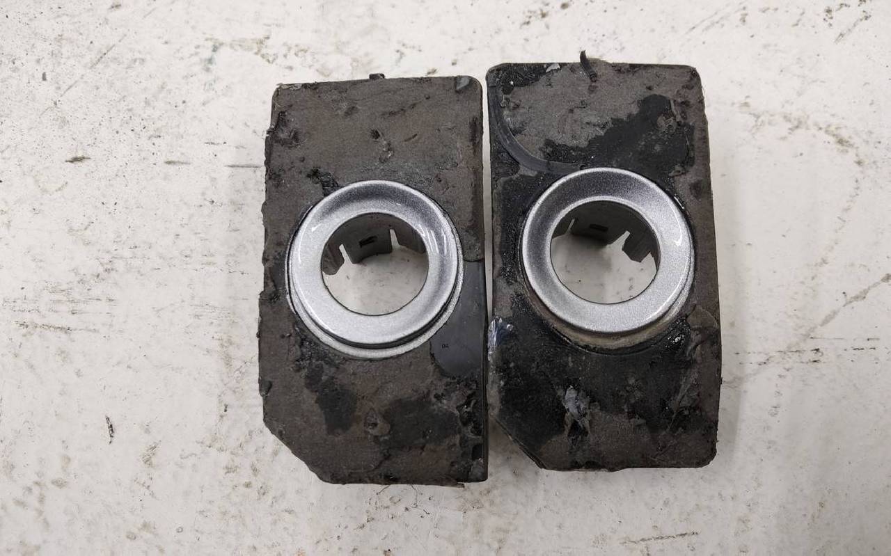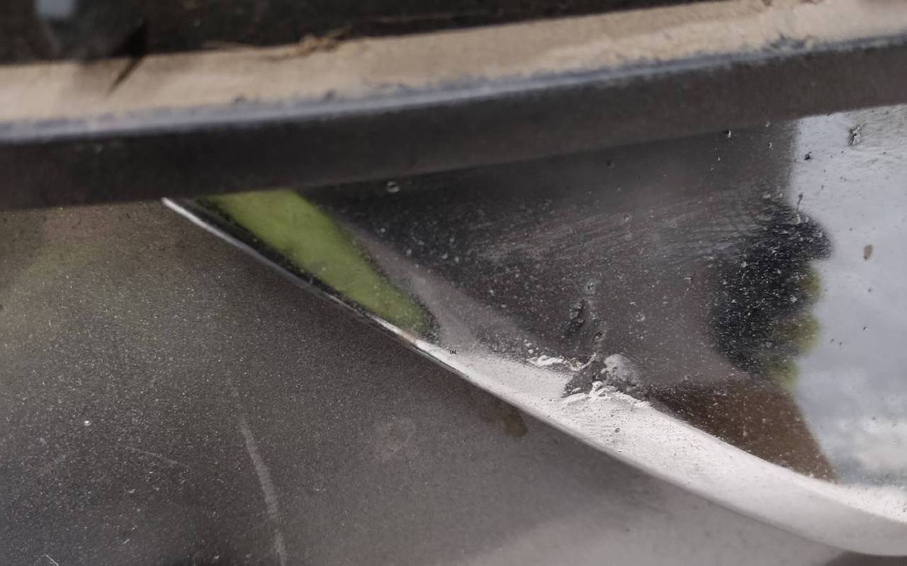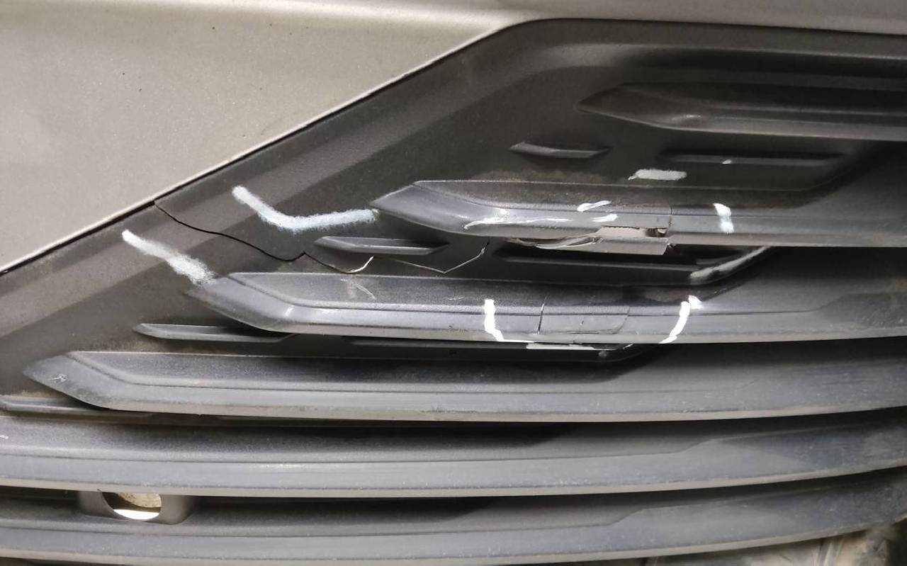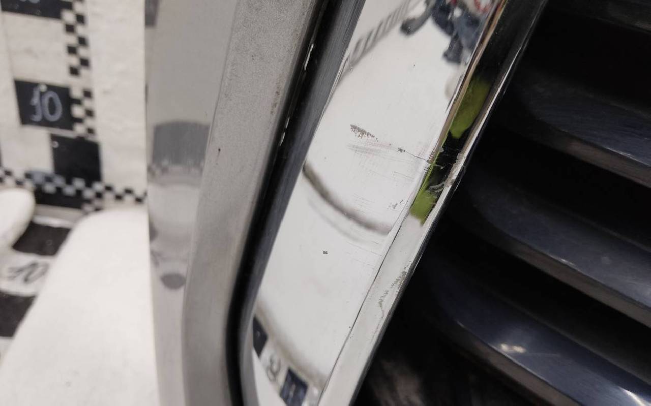 Состояние детали хорошее. Серого цвета под парктроники (кронштейны в комплекте). Вмятина, царапины. Вздутие хрома, трещины на левой и нижней накладках. Крепления целые. Потребуется незначительный ремонт