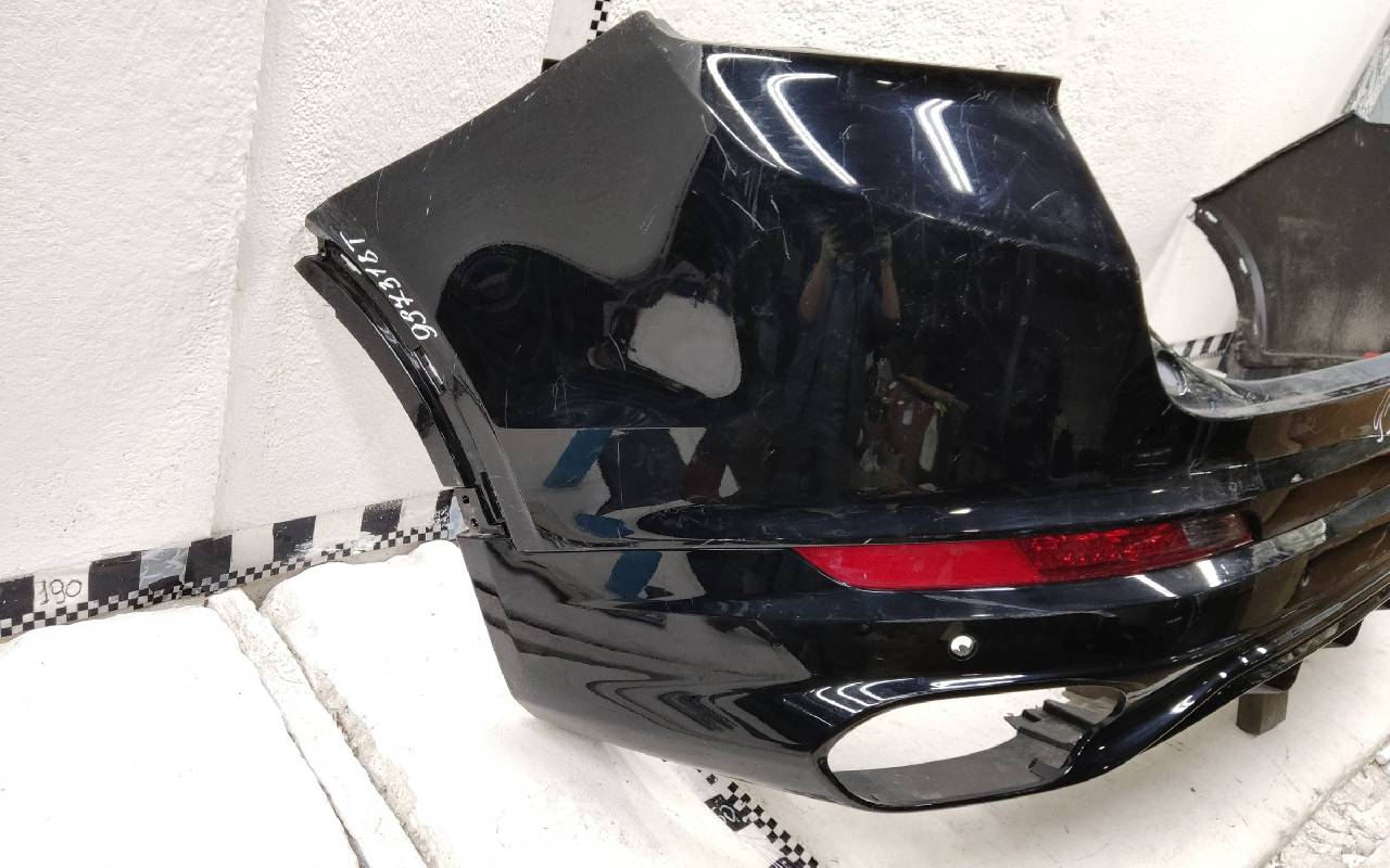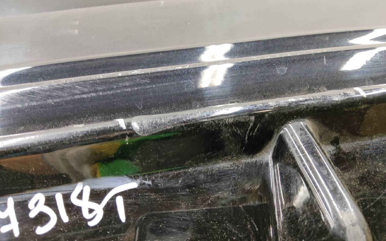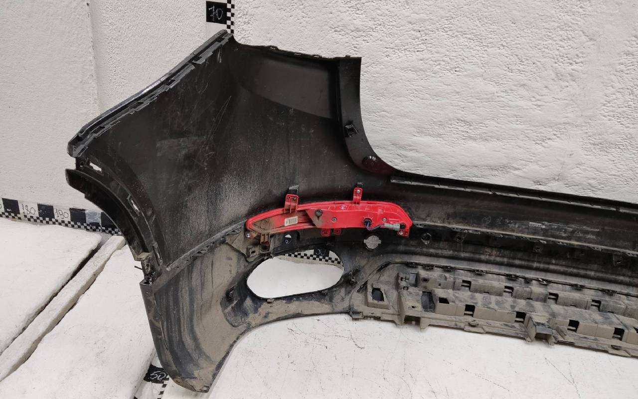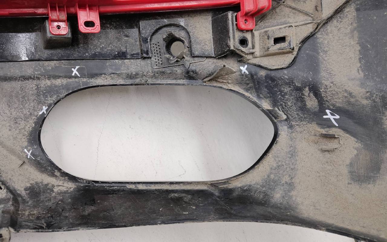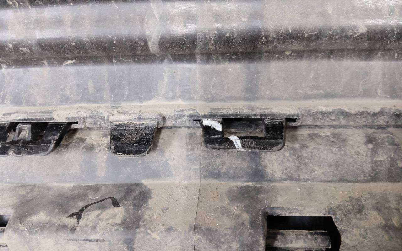 Состояние детали хорошее. Чёрного цвета. Нижняя часть RESTAIL под парктроники. Царапина на верхней части (сквозная). Вмятинка на накладке. Отсутствуют четыре крепления и направляющая под кронштейн левой насадки на юбке. Дефект одного замка на нижней накладке, приклеено одно крепление правой ПТФ. Потребуется незначительный ремонт