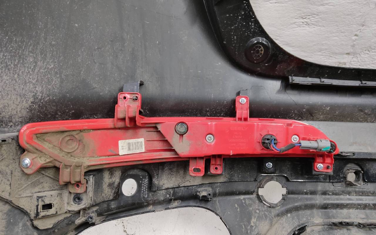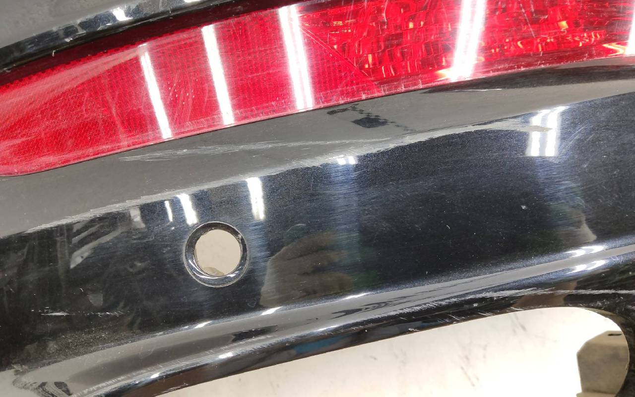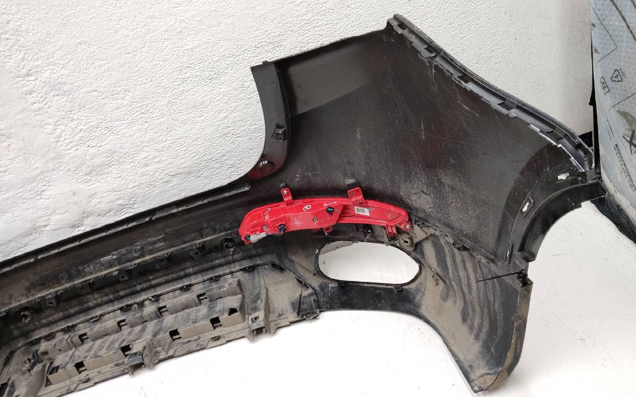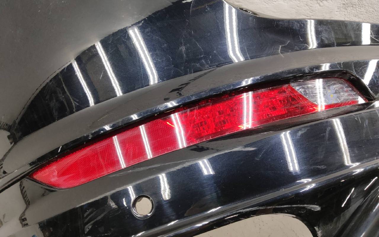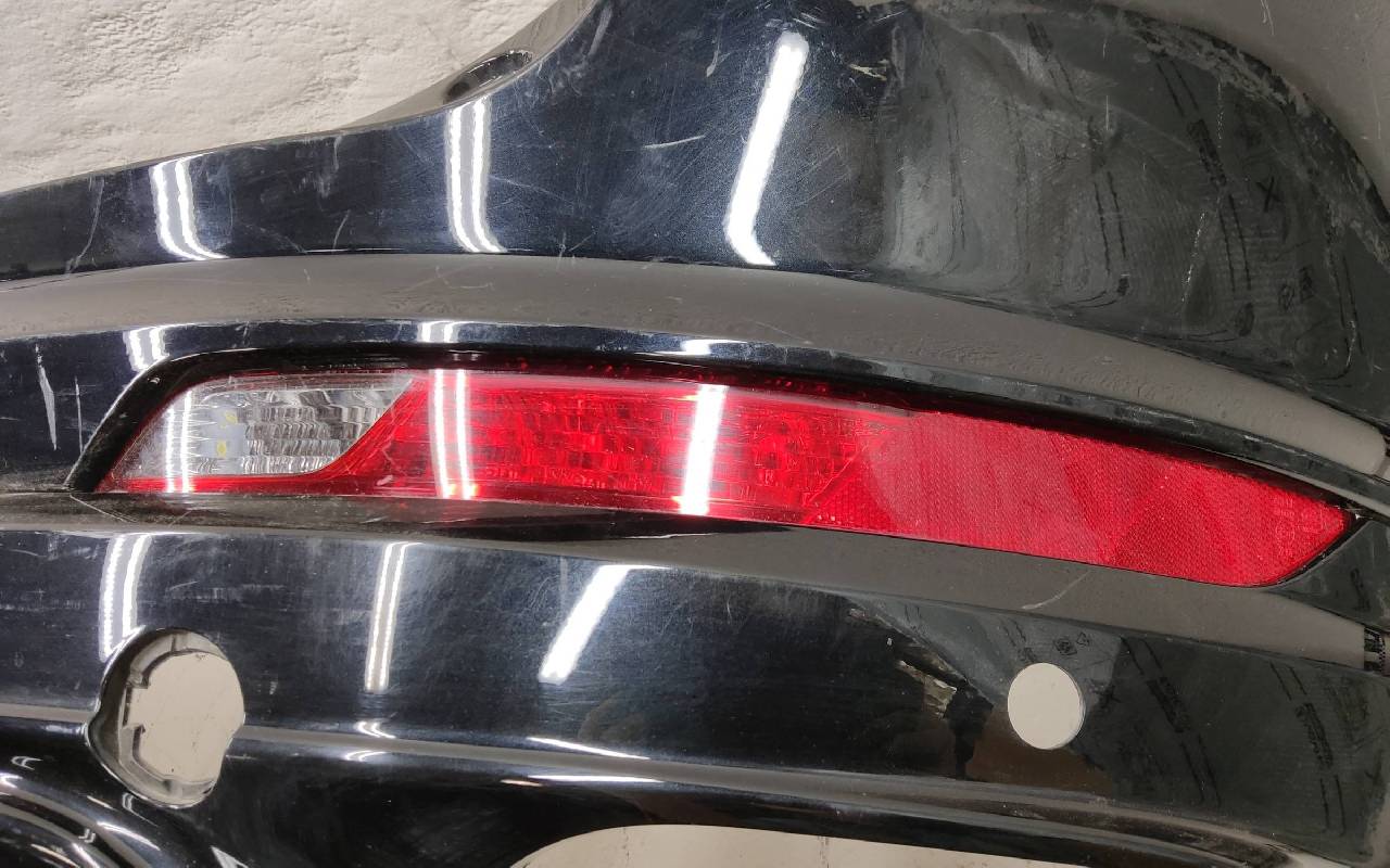 Состояние детали хорошее. Чёрного цвета. Нижняя часть RESTAIL под парктроники. Царапина на верхней части (сквозная). Вмятинка на накладке. Отсутствуют четыре крепления и направляющая под кронштейн левой насадки на юбке. Дефект одного замка на нижней накладке, приклеено одно крепление правой ПТФ. Потребуется незначительный ремонт