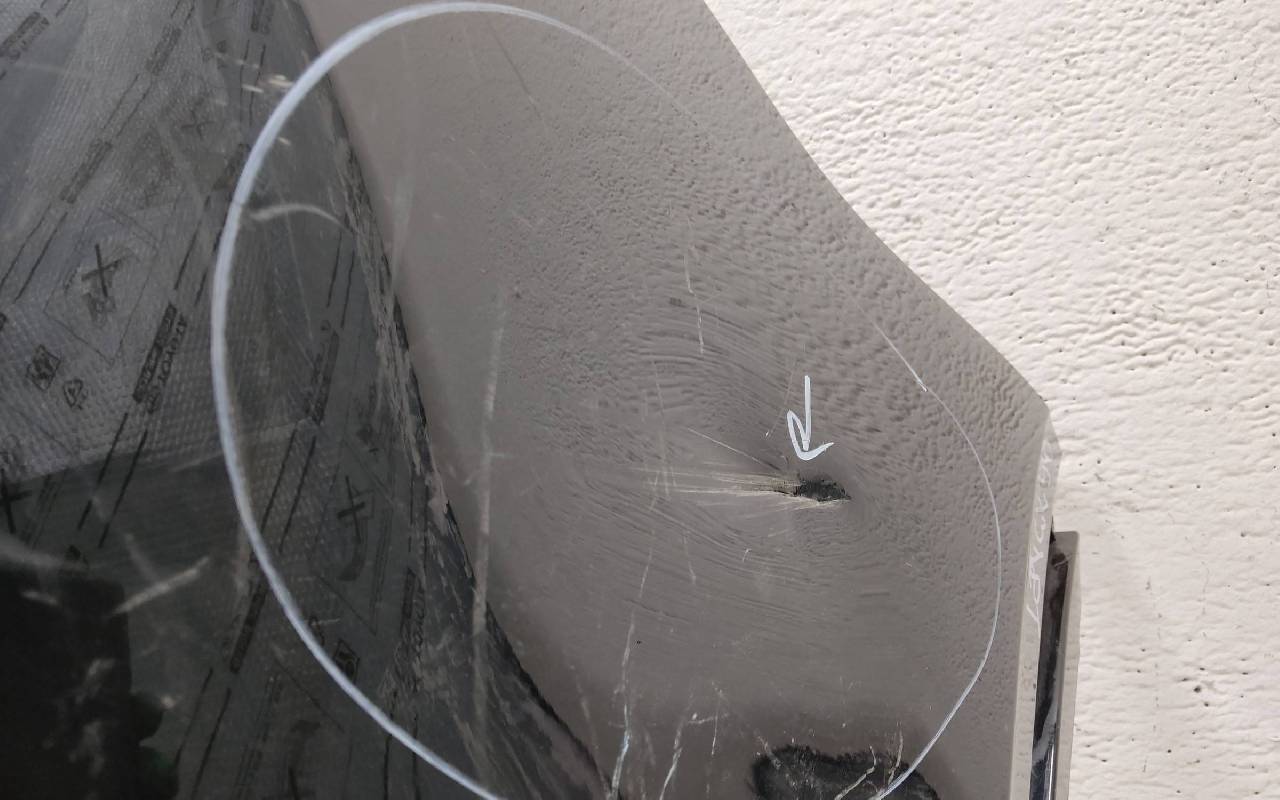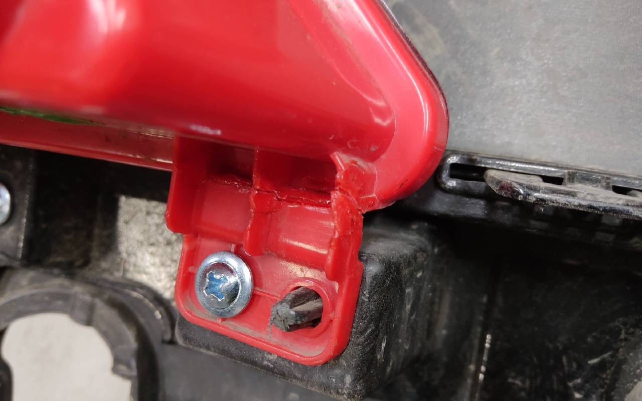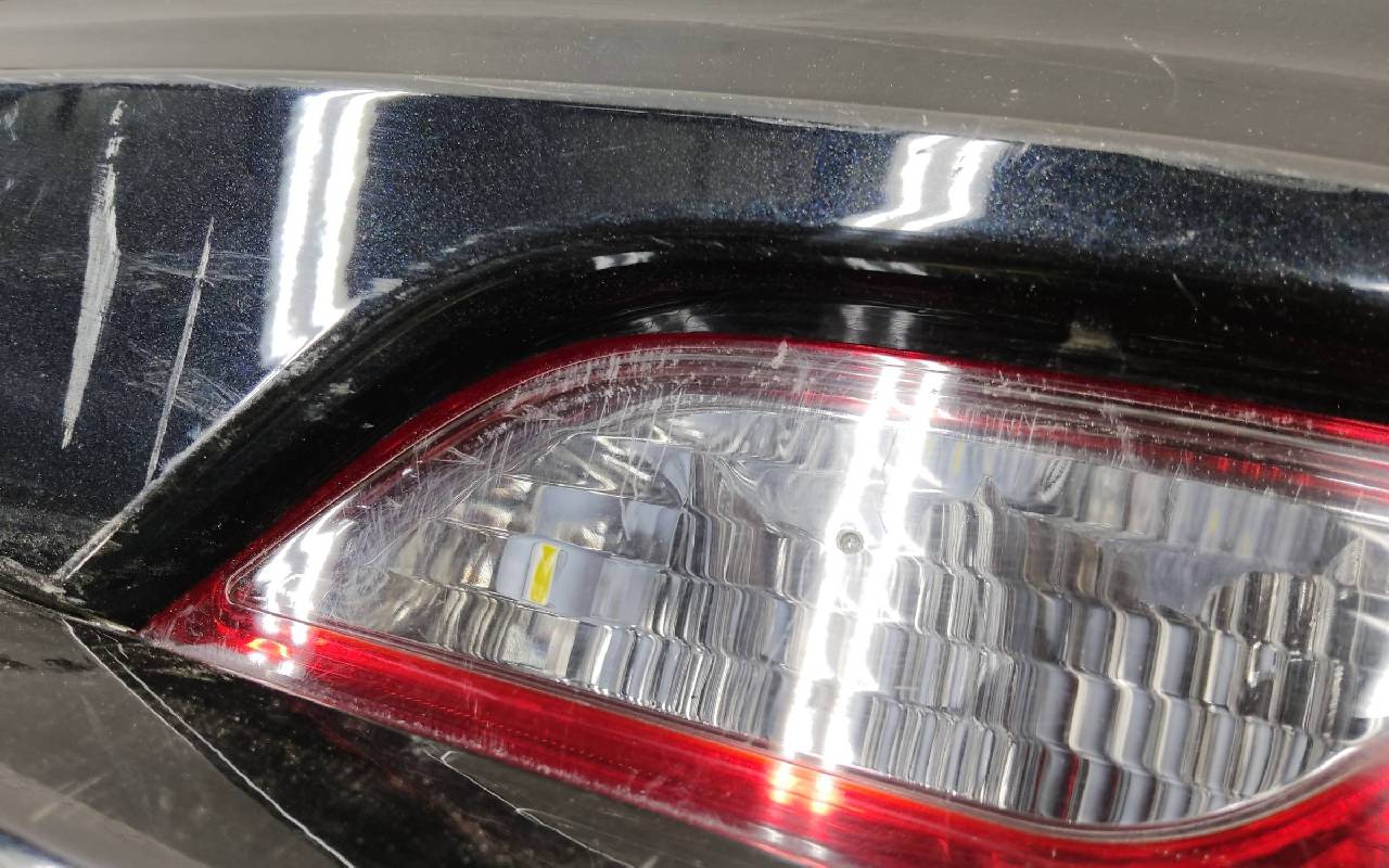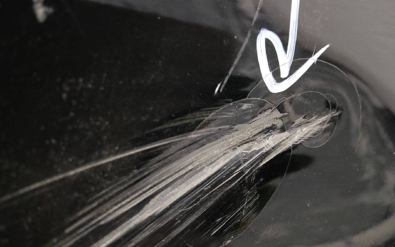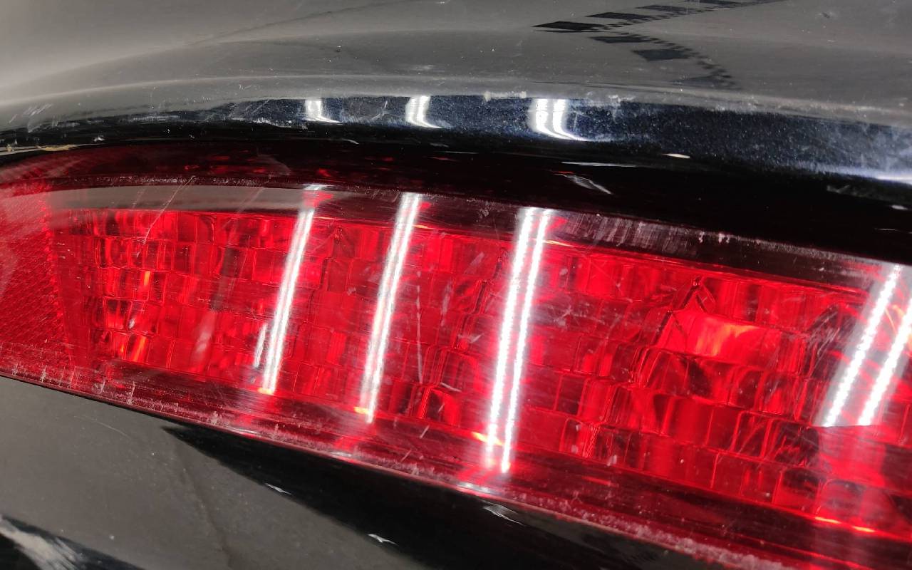 Состояние детали хорошее. Чёрного цвета. Нижняя часть RESTAIL под парктроники. Царапина на верхней части (сквозная). Вмятинка на накладке. Отсутствуют четыре крепления и направляющая под кронштейн левой насадки на юбке. Дефект одного замка на нижней накладке, приклеено одно крепление правой ПТФ. Потребуется незначительный ремонт