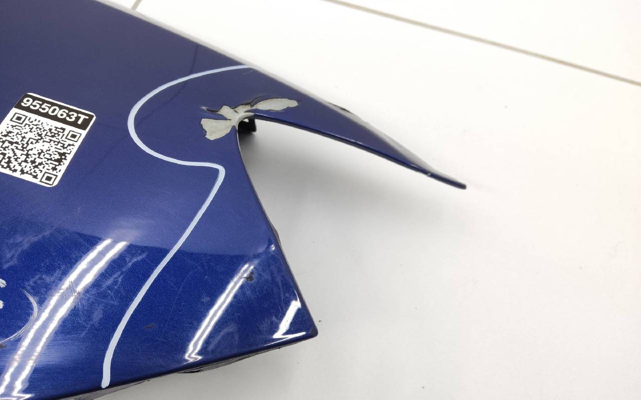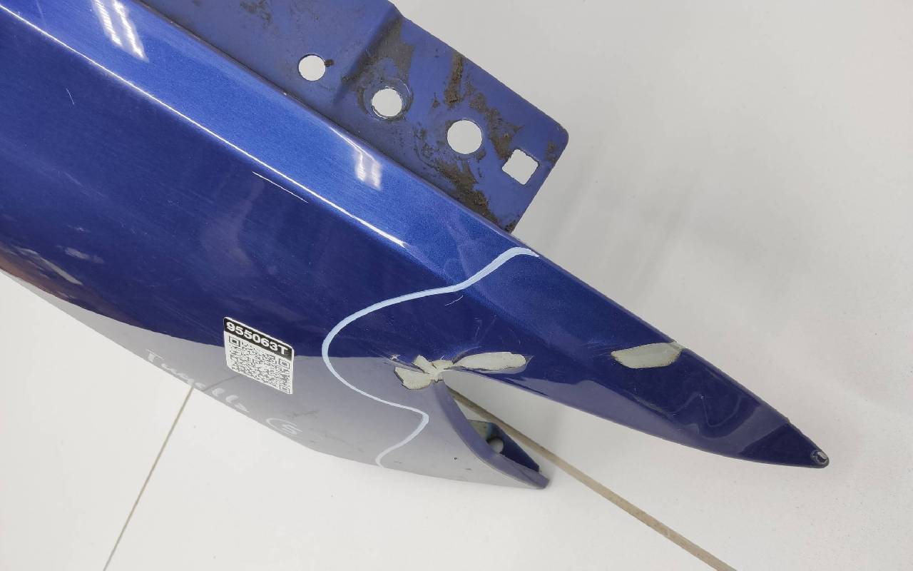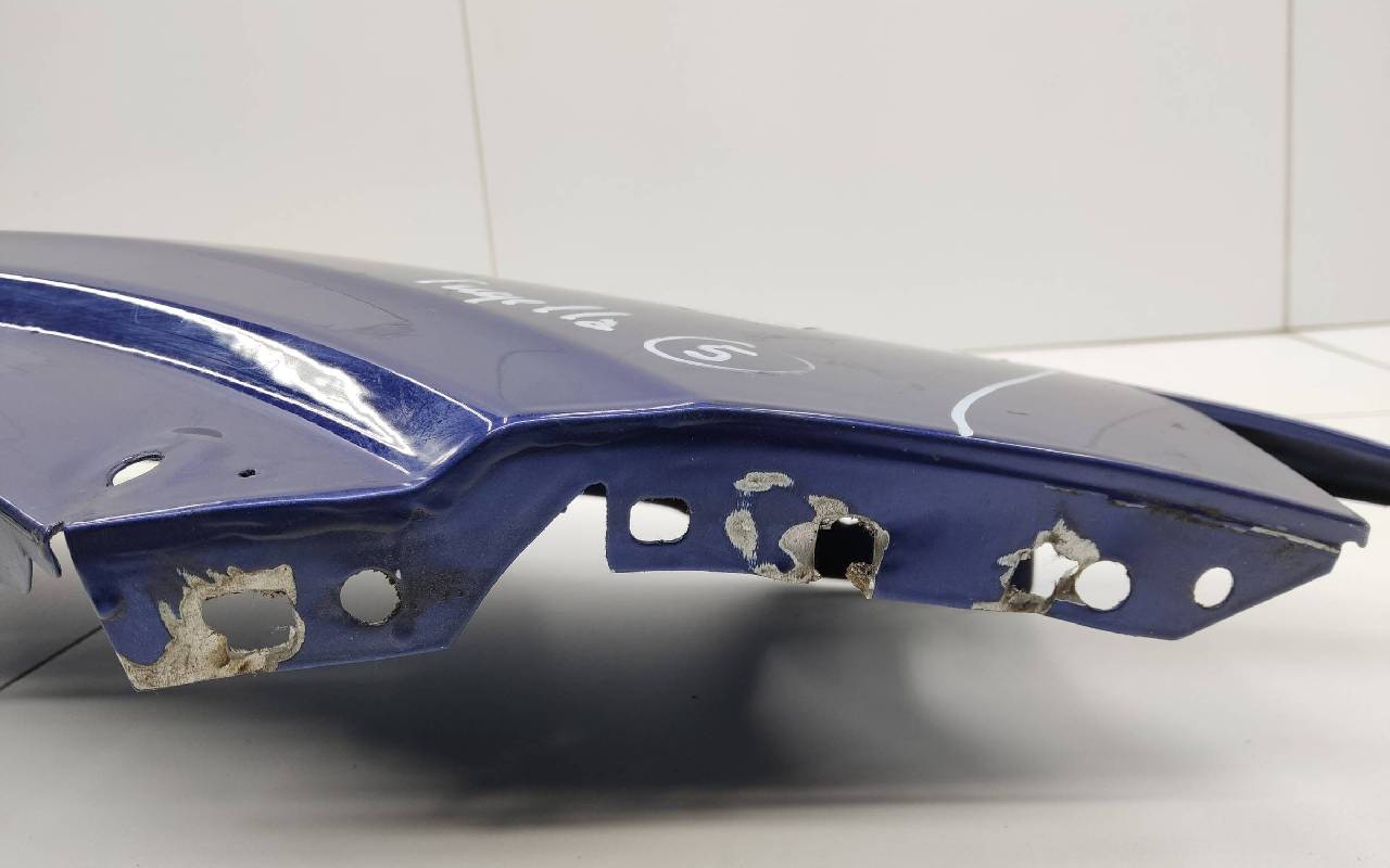 Состояние детали хорошее. Синего цвета, скол ЛКП. Вмятина в передней части, дефект металла по кронштейну. Потребуется незначительный ремонт