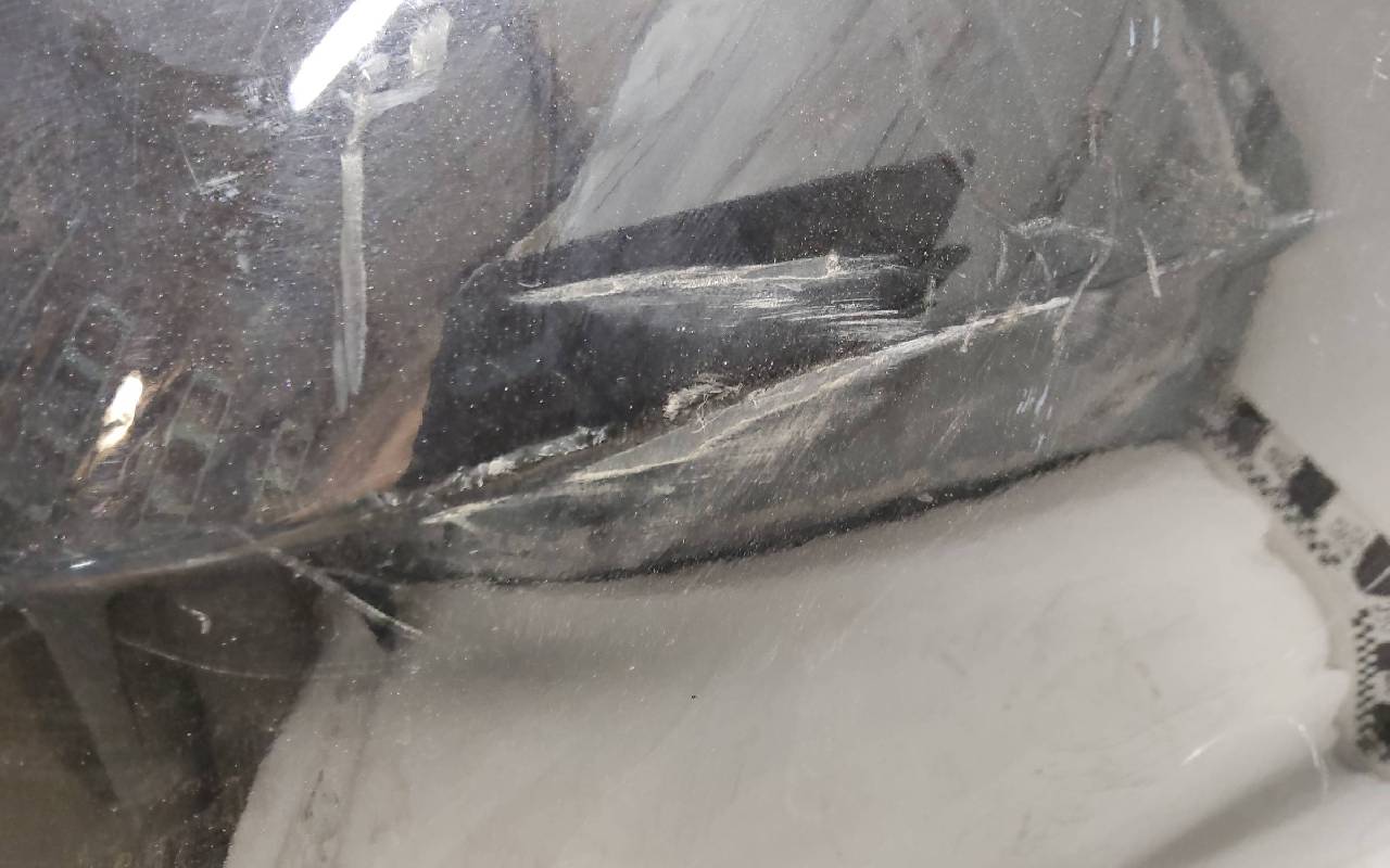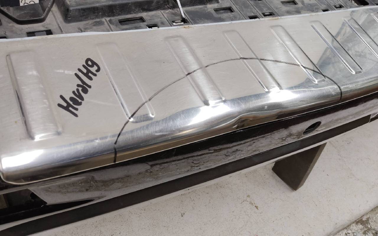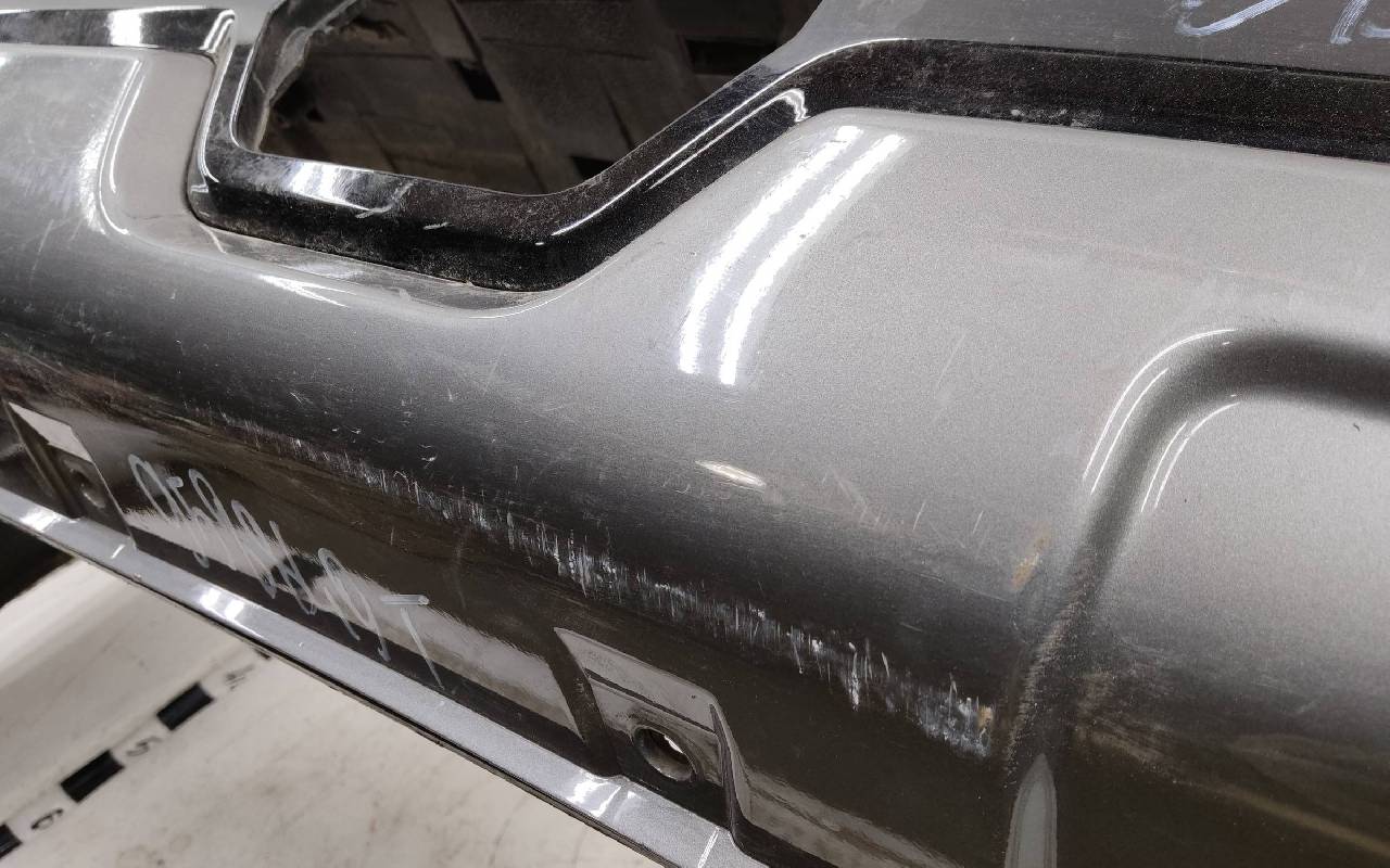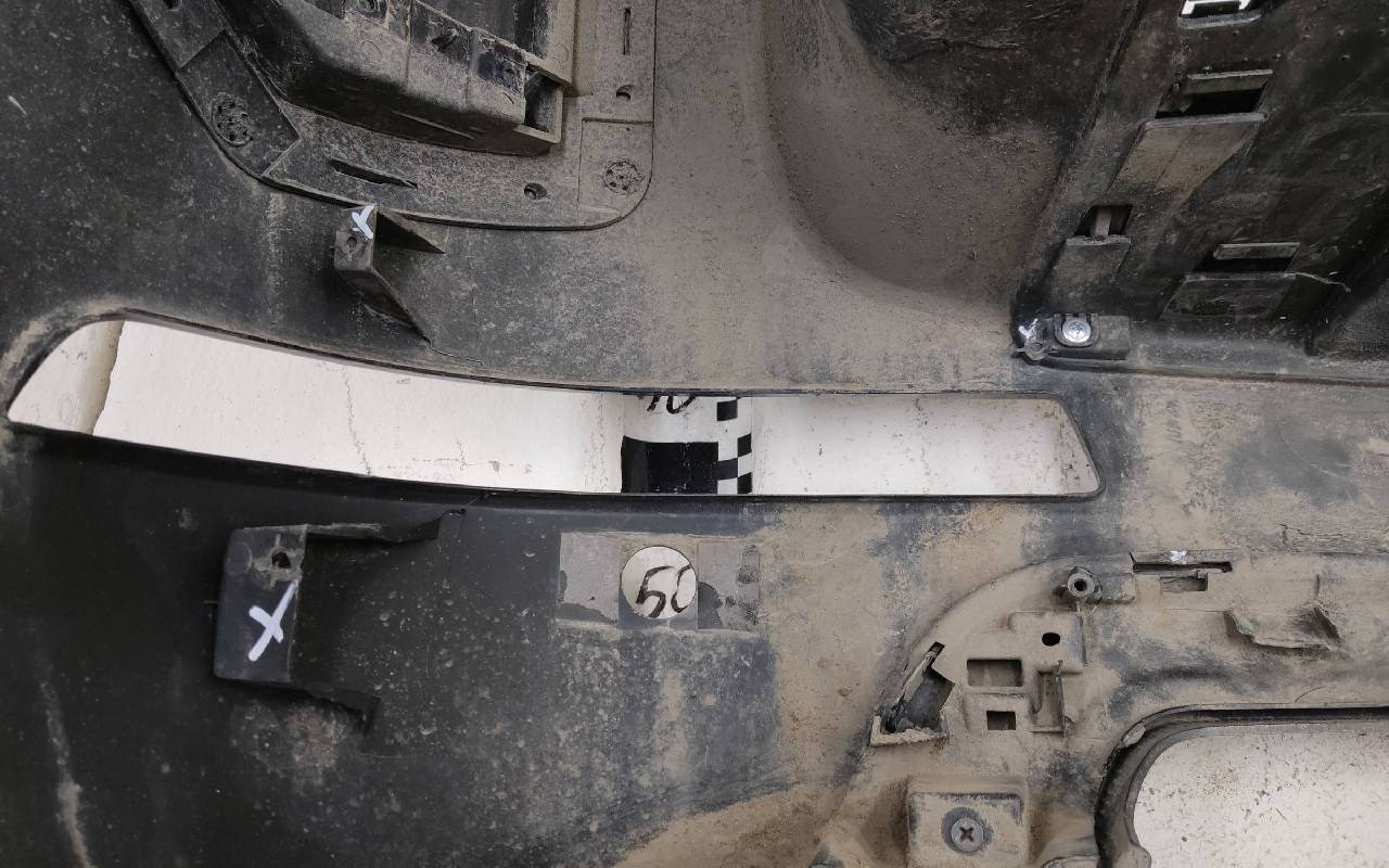Состояние детали хорошее. Чёрного цвета под парктроники. Ранее производился ремонт. Небольшие вмятины на полке бампера и накладке, царапины. Отсутствуют три крепления под правую ПТФ и одно на юбке. Потребуется незначительный ремонт