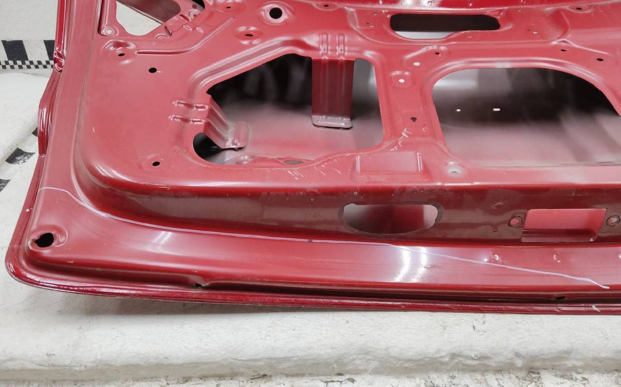 Состояние детали хорошее. Красного цвета, скол ЛКП. Вмятина в нижней части на внешней и внутренней поверхности, небольшие тычки. Потребуется ремонт