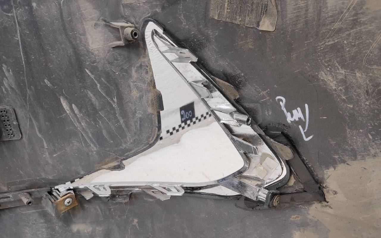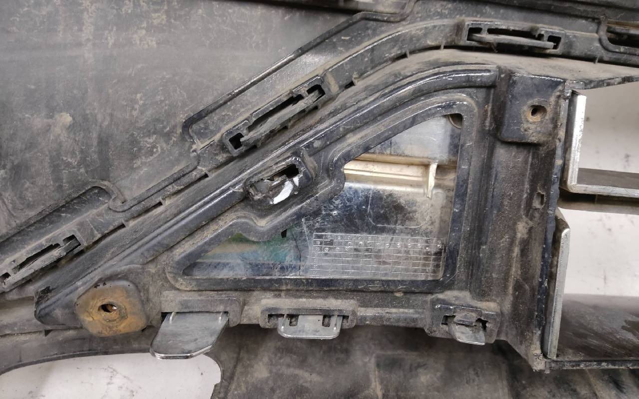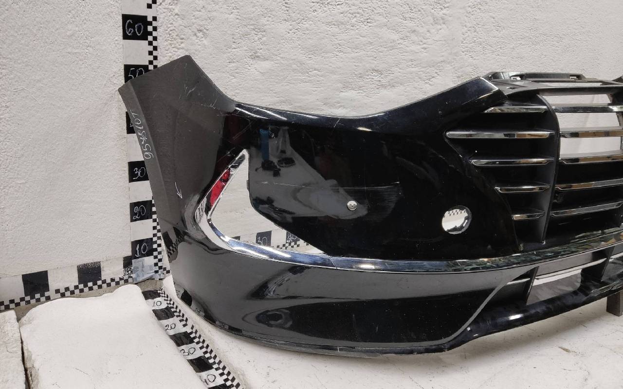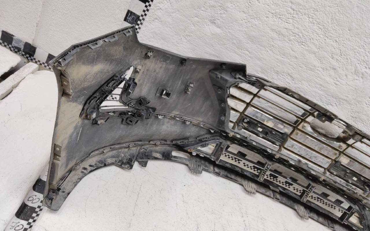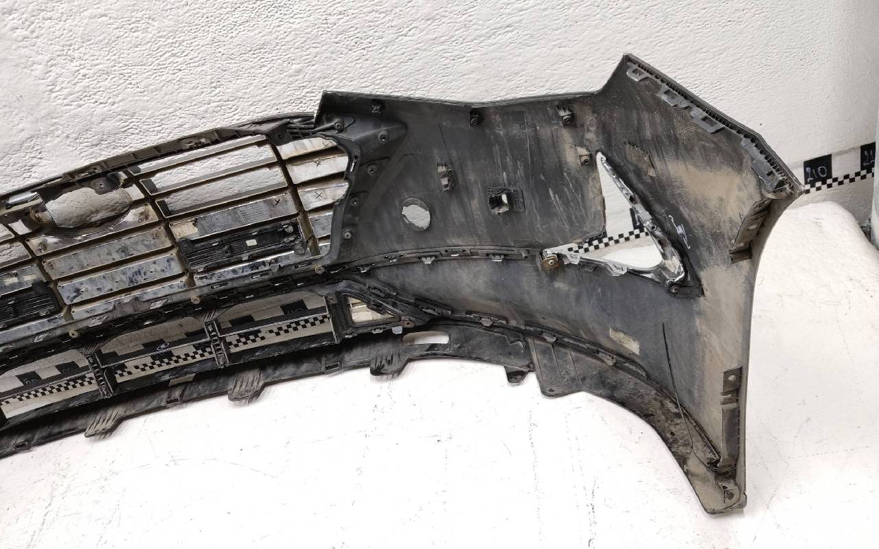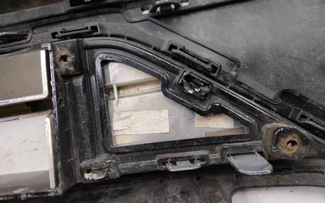 Состояние детали хорошее. Чёрного цвета под парктроники. После небольшого ремонта. В сборе с решетками и хромом. Царапинки, левая рамка сломана. Крепления бампера целые. Отсутствует несколько креплений и направляющих на решетках. Под покраску. Может потребоваться незначительный дополнительный ремонт