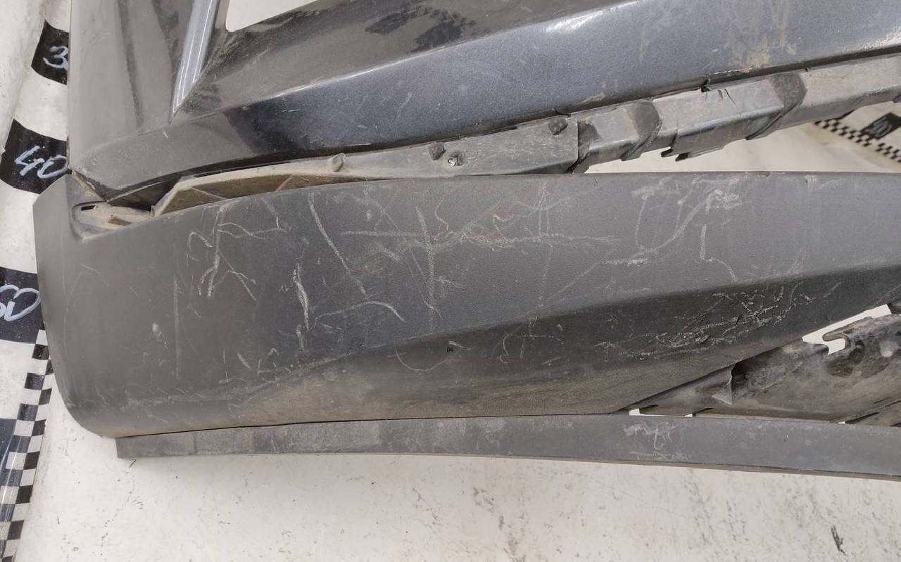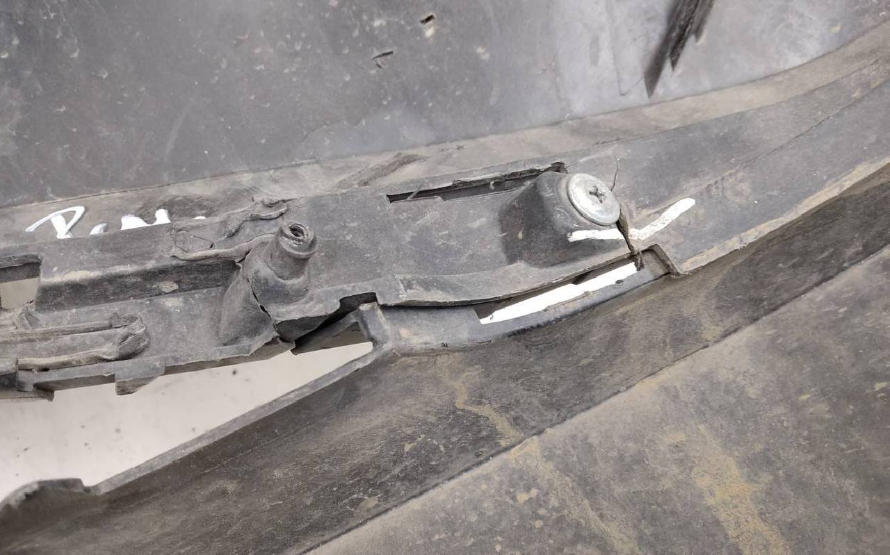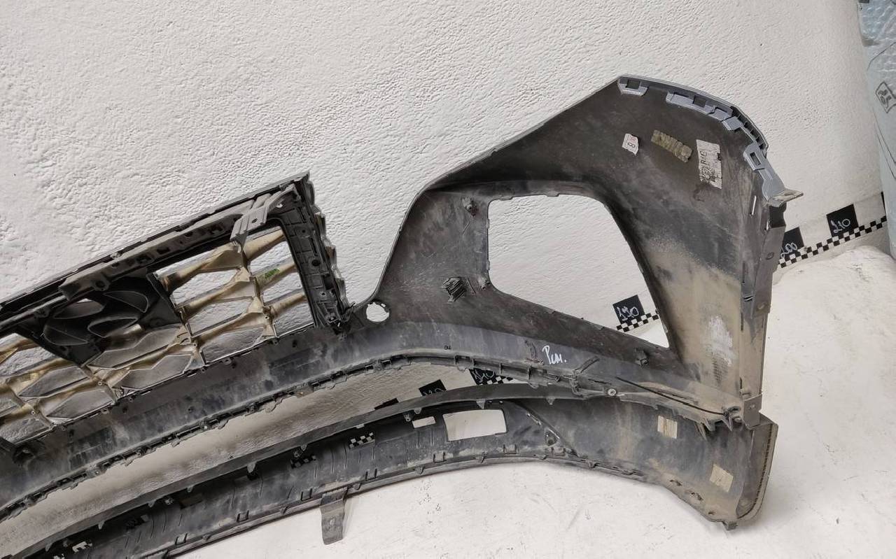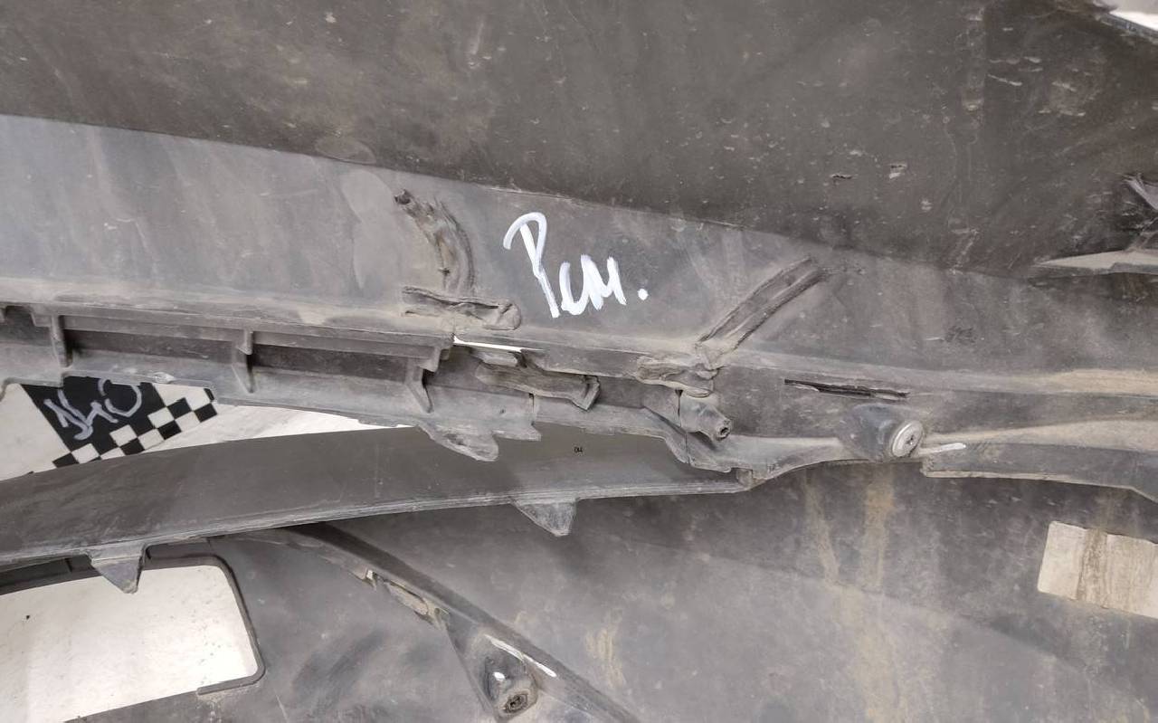 Состояние детали удовлетворительное. Тёмно-серого цвета под парктроники. Вмятины, небольшие трещины. Решетка разбита. Отсутствует один замок, дефект двух креплений на юбке. Потребуется ремонт