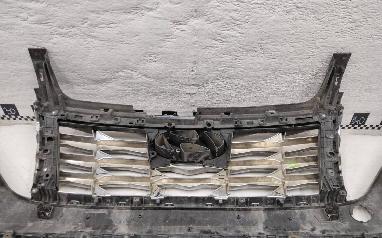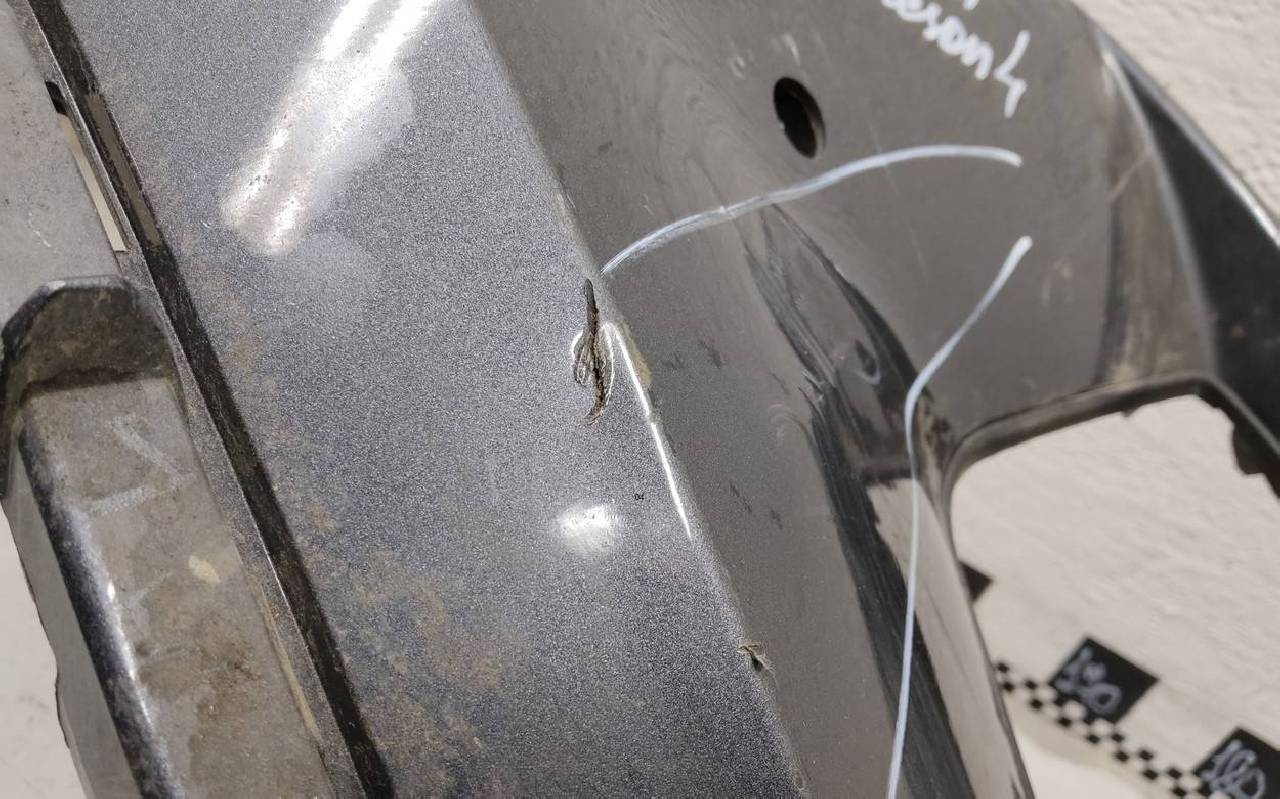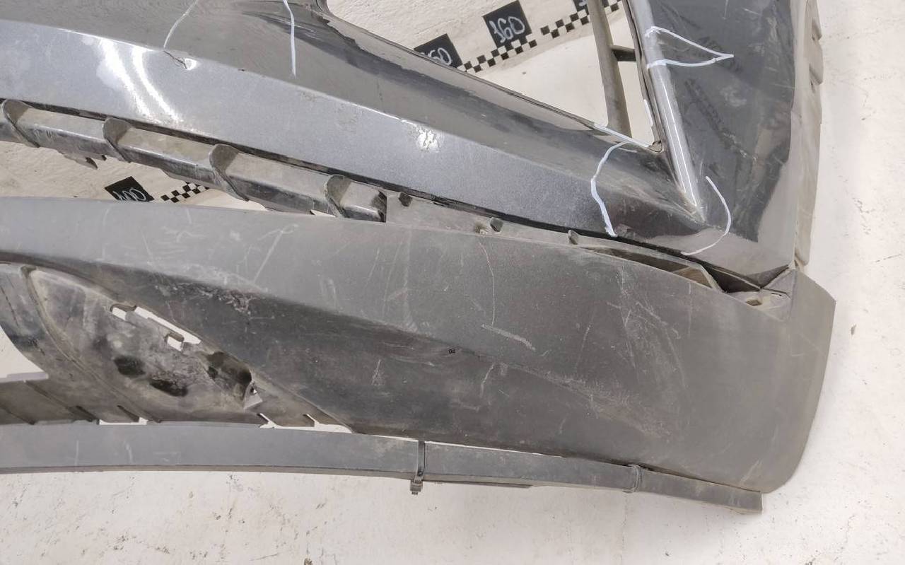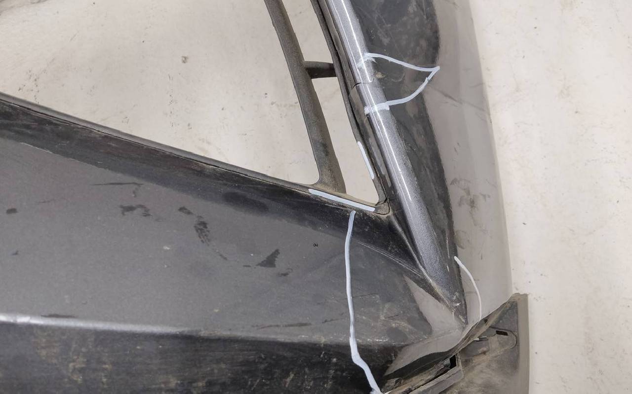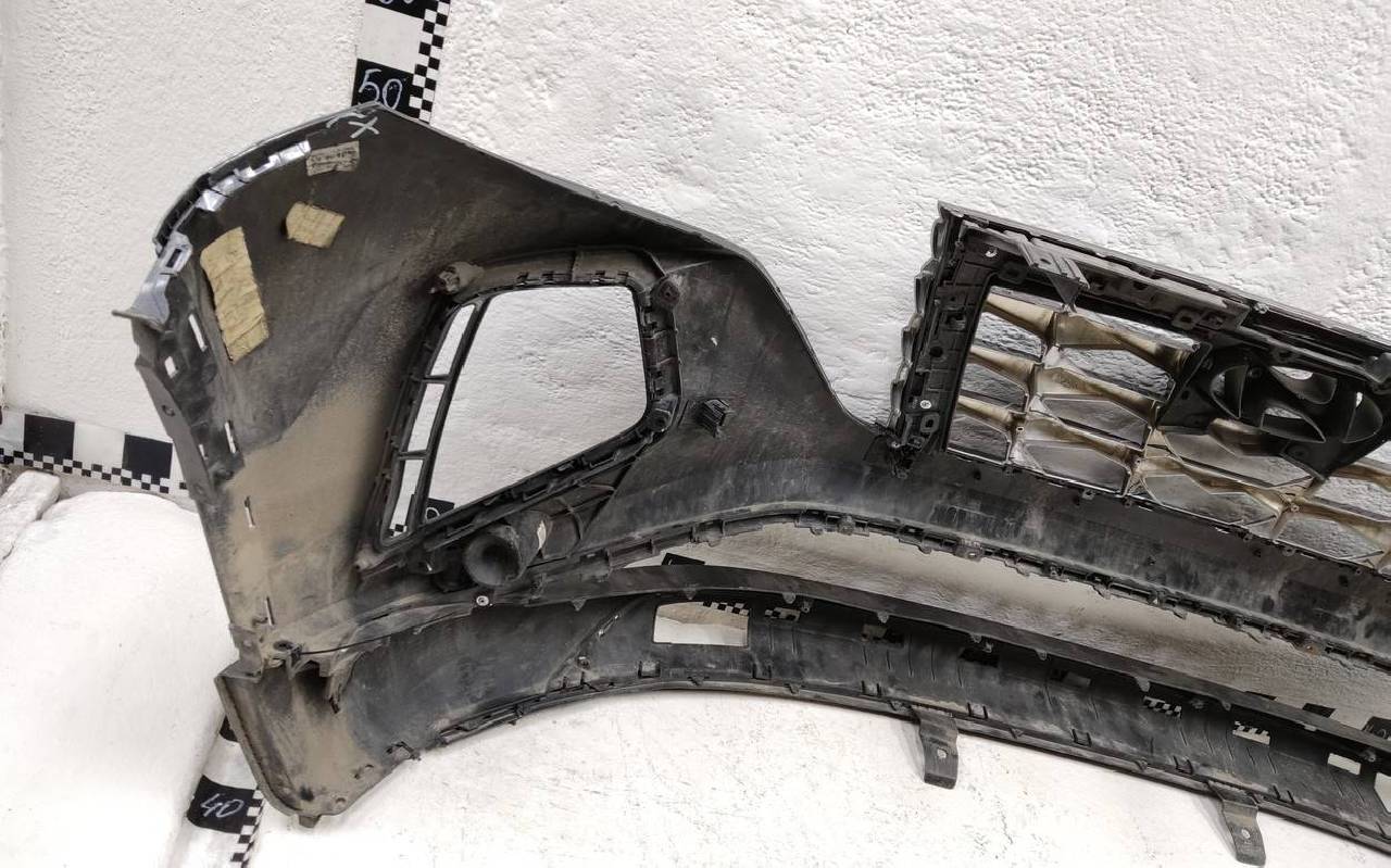 Состояние детали удовлетворительное. Тёмно-серого цвета под парктроники. Вмятины, небольшие трещины. Решетка разбита. Отсутствует один замок, дефект двух креплений на юбке. Потребуется ремонт