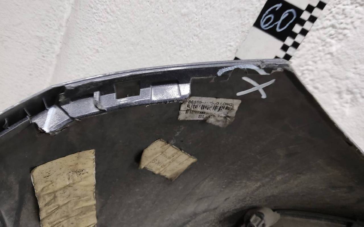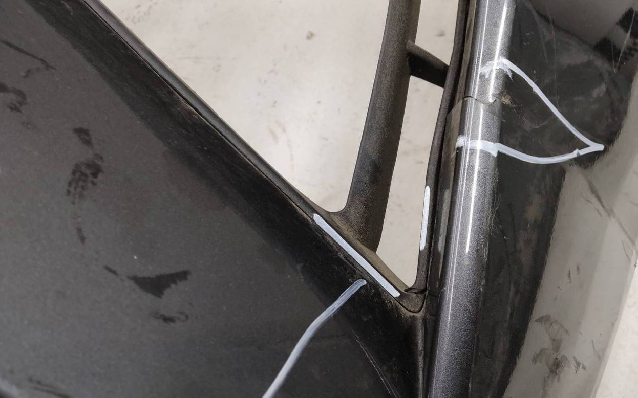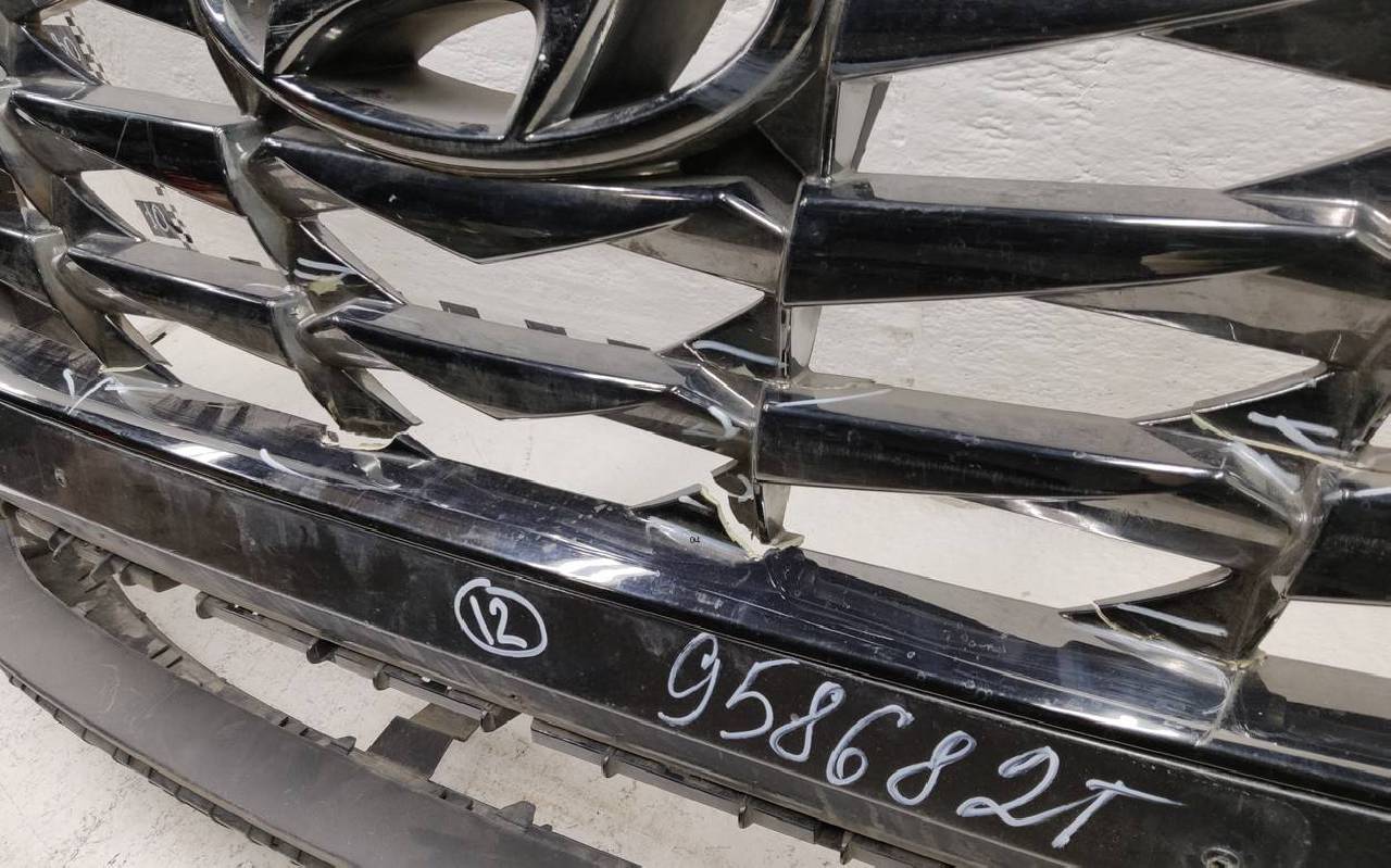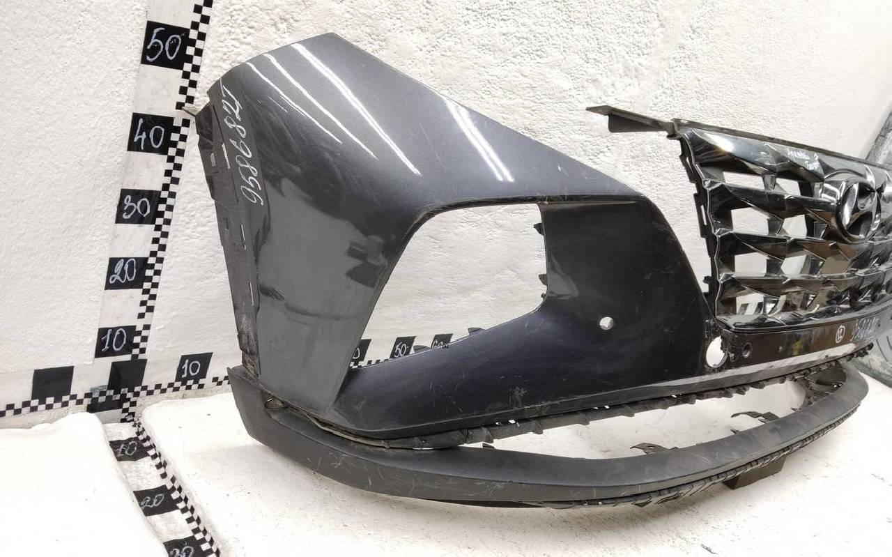 Состояние детали удовлетворительное. Тёмно-серого цвета под парктроники. Вмятины, небольшие трещины. Решетка разбита. Отсутствует один замок, дефект двух креплений на юбке. Потребуется ремонт