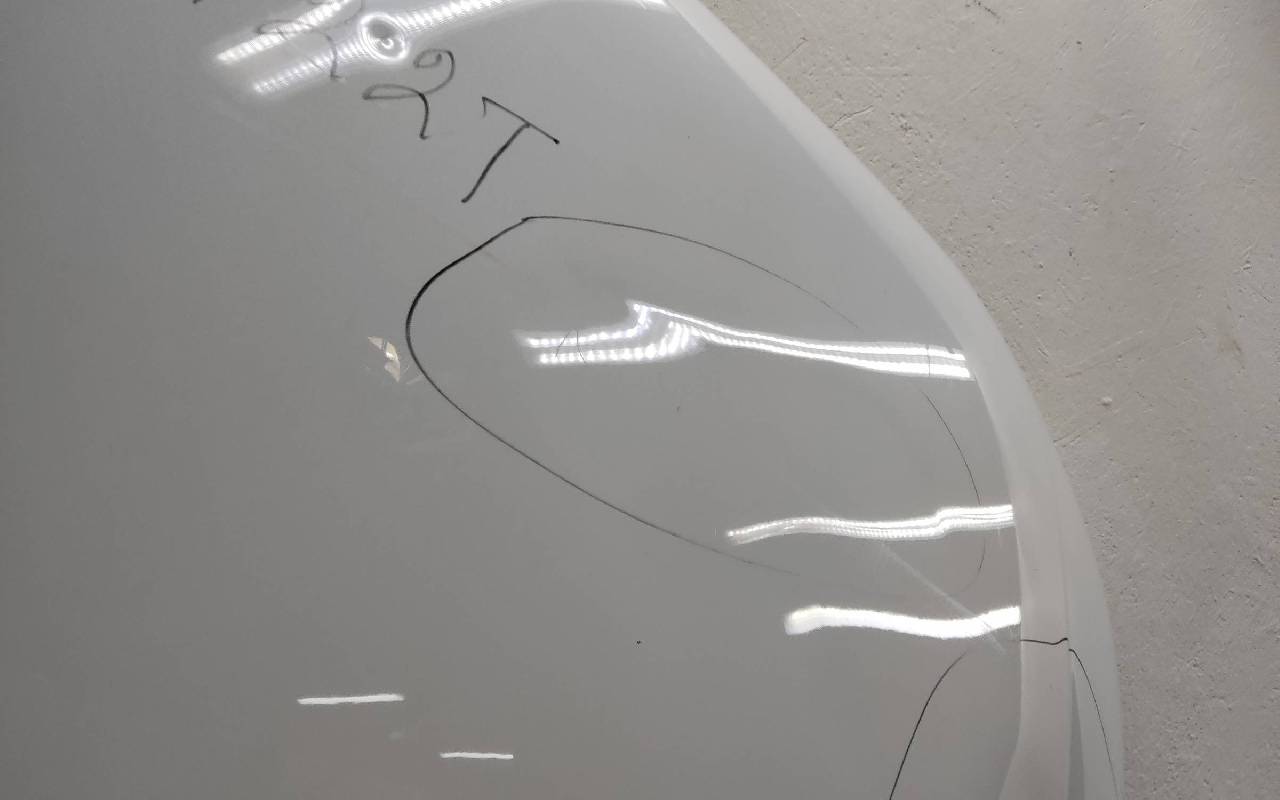 Состояние детали удовлетворительное. Белого цвета, скол ЛКП. Вмятины. Потребуется ремонт