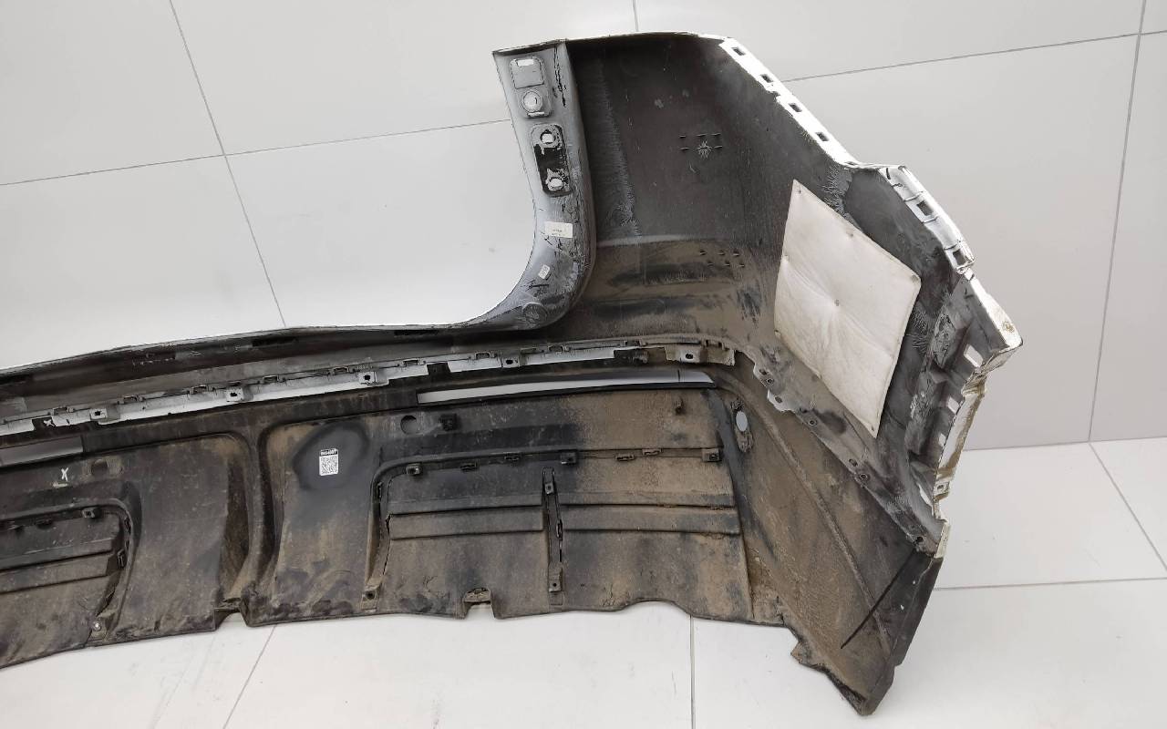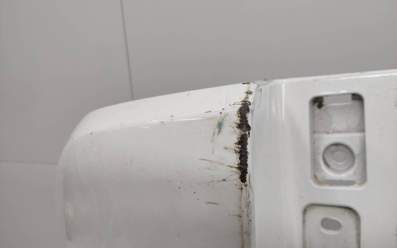 Состояние детали удовлетворительное. Белого цвета, царапины. Под парктроники. На юбке трещины. Отсутствует одно крепление на бампере и четыре на юбке под правую ПТФ, дефект двух и пластика кронштейна на фото. Потребуется ремонт