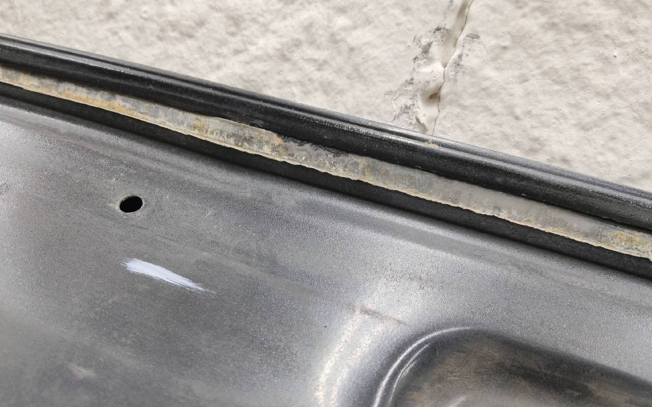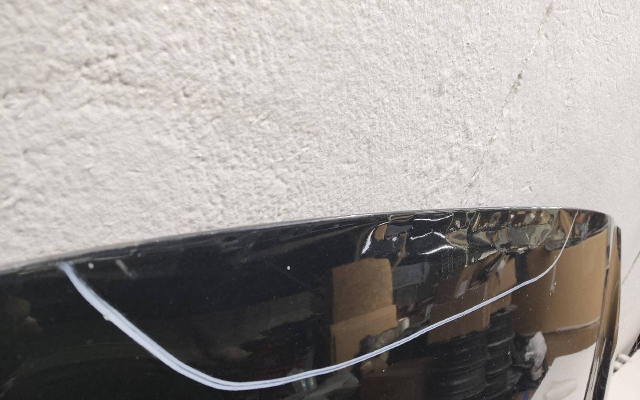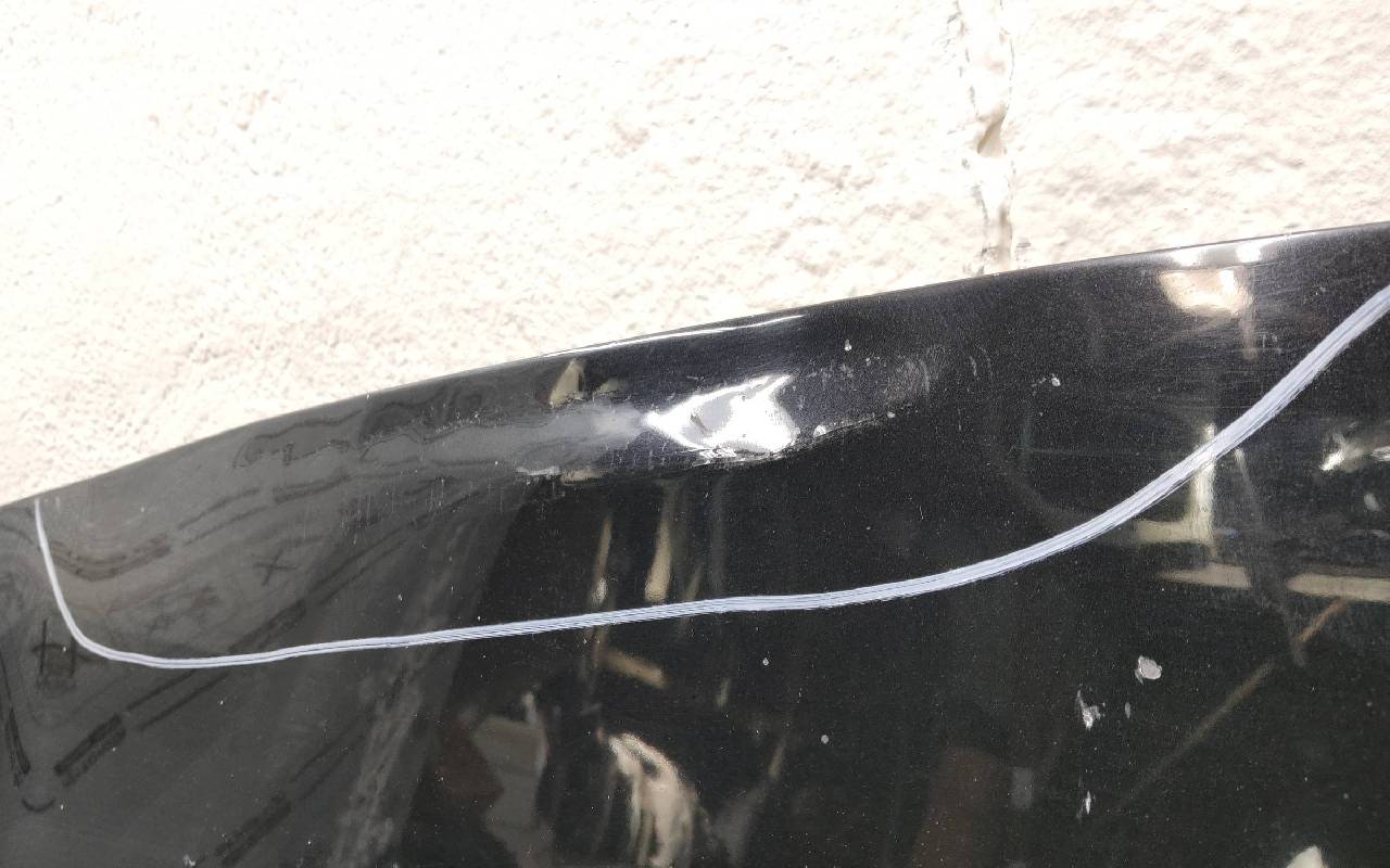 Состояние детали удовлетворительное. Чёрного цвета, скол ЛКП. Небольшая вмятина в передней части, лопнул по шву. Потребуется незначительный ремонт