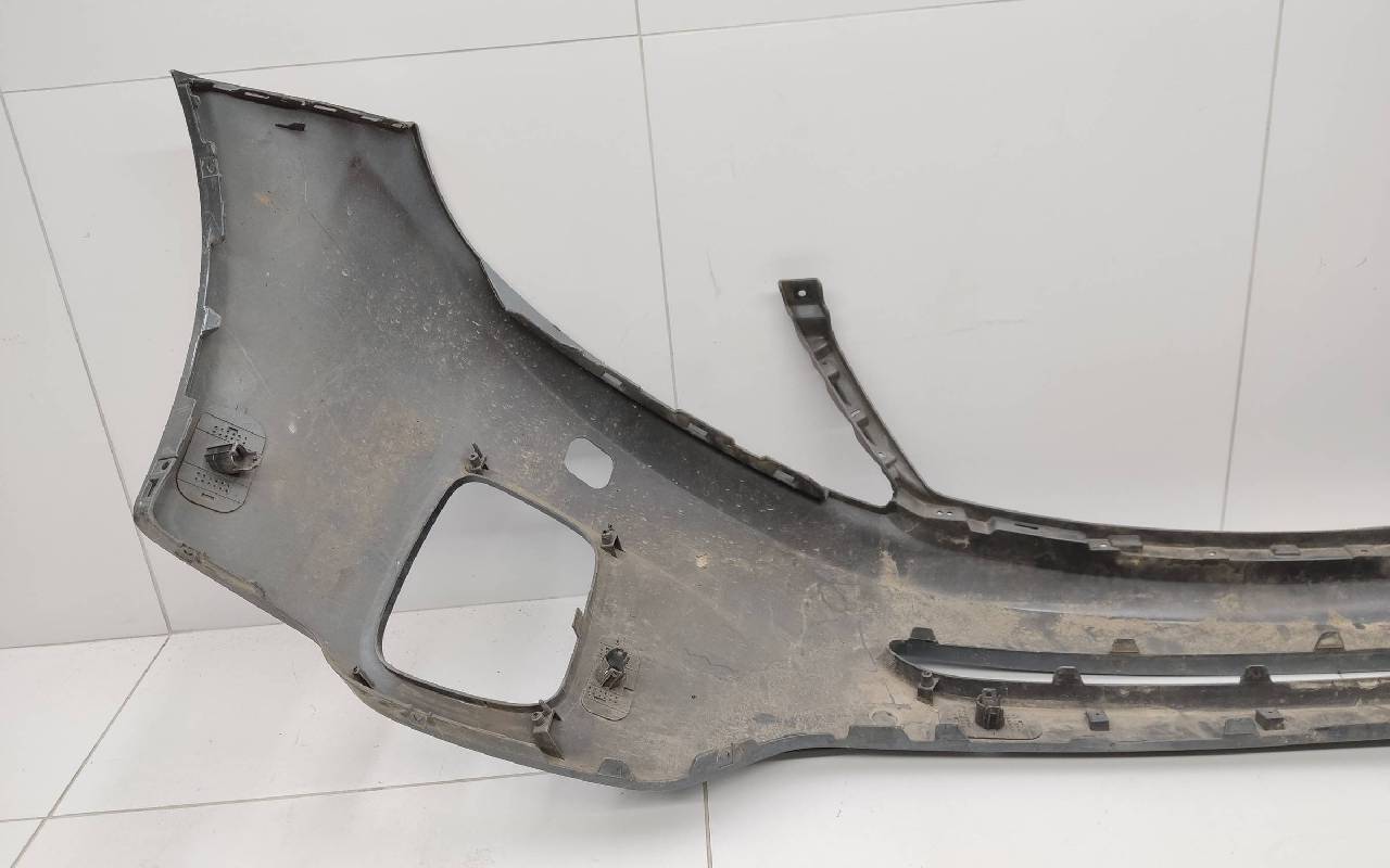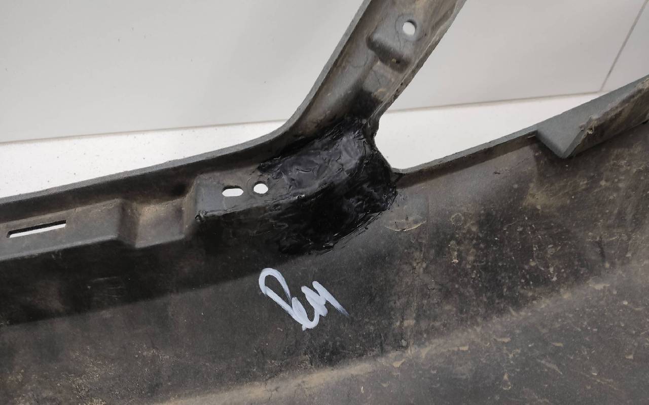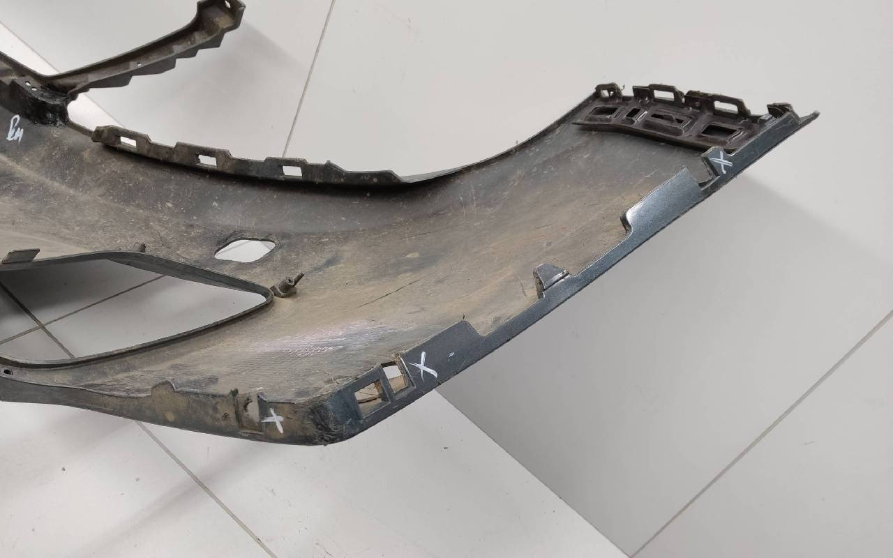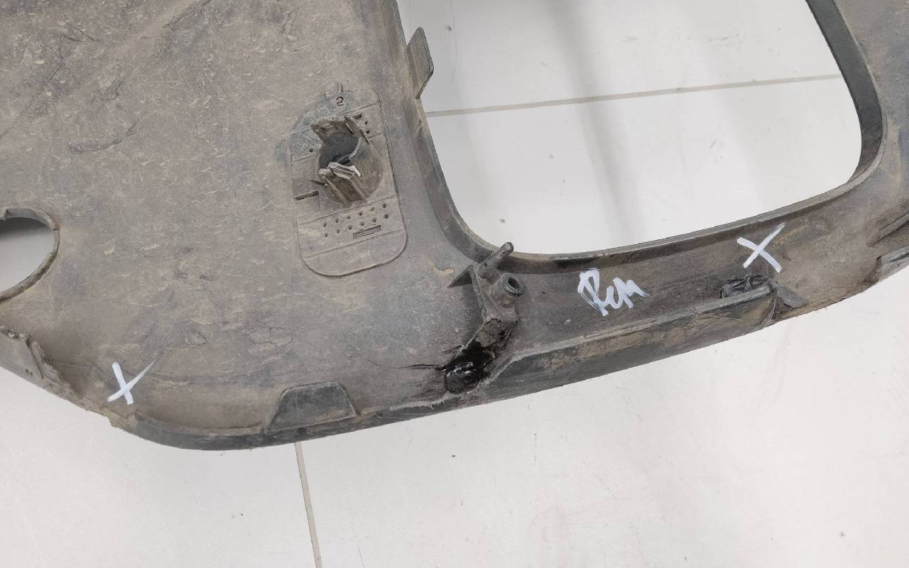 Состояние детали хорошее. Тёмно-серого цвета под парктроники и омыватели фар. После небольшого ремонта. Царапины. Отсутствуют три крепления под юбку в нижней части и два справа. Потребуется дополнительный ремонт