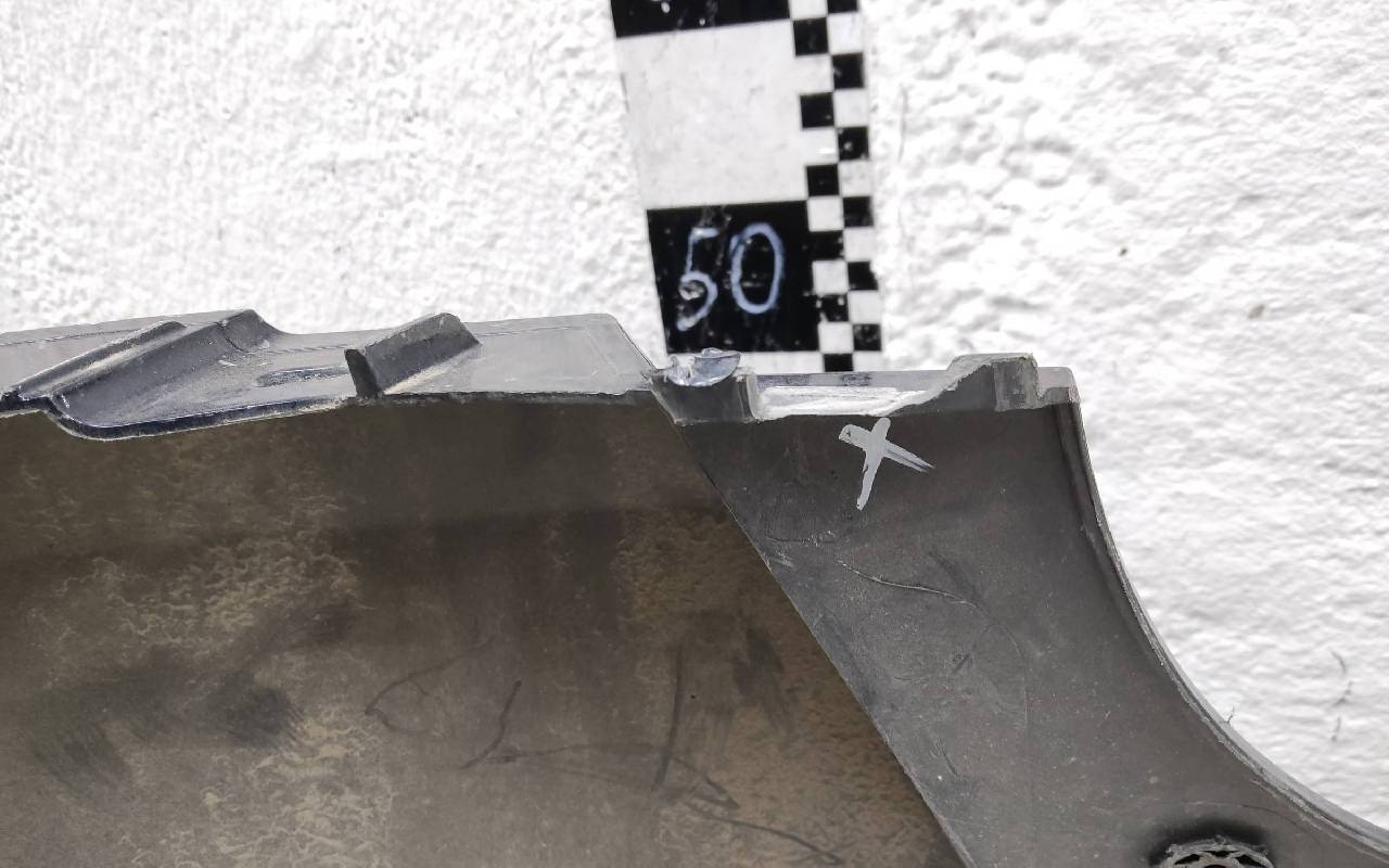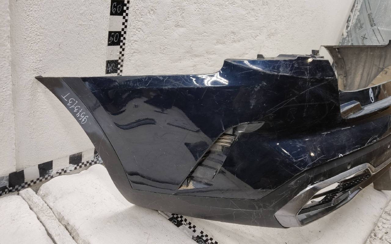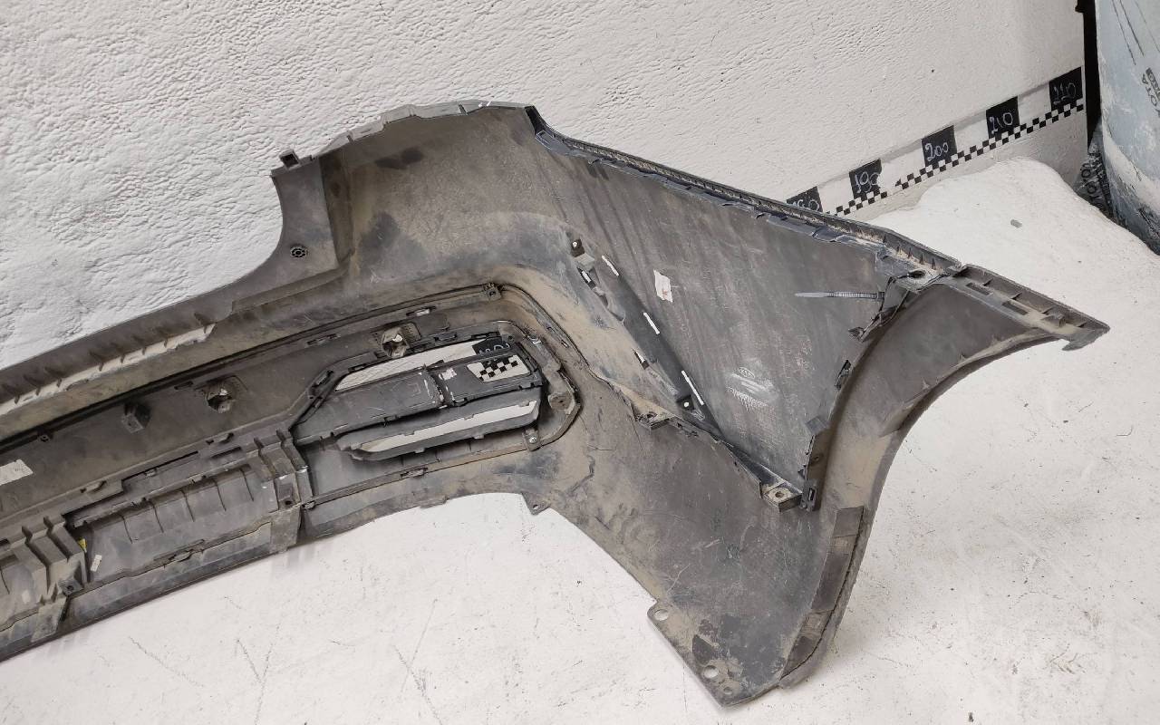 Состояние детали удовлетворительное. Тёмно-синего цвета под парктроники. Вмятина на полке. Небольшие трещины на бампере и накладках. Дефект пластика юбки на фото. Отсутствуют два крепления под юбку и одна верхняя направляющая. Трещина вдоль кронштейна юбки под накладку, отсутствует одно крепление на самой накладка. Потребуется ремонт
