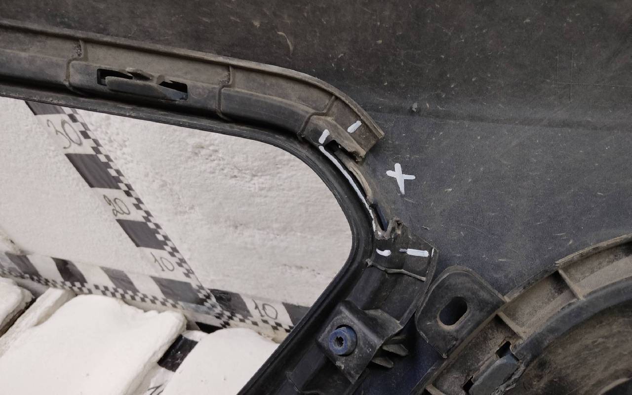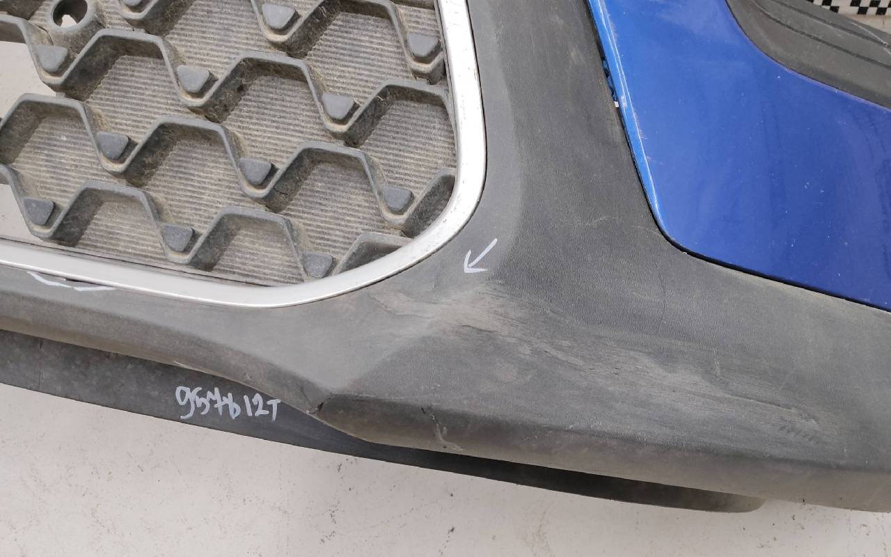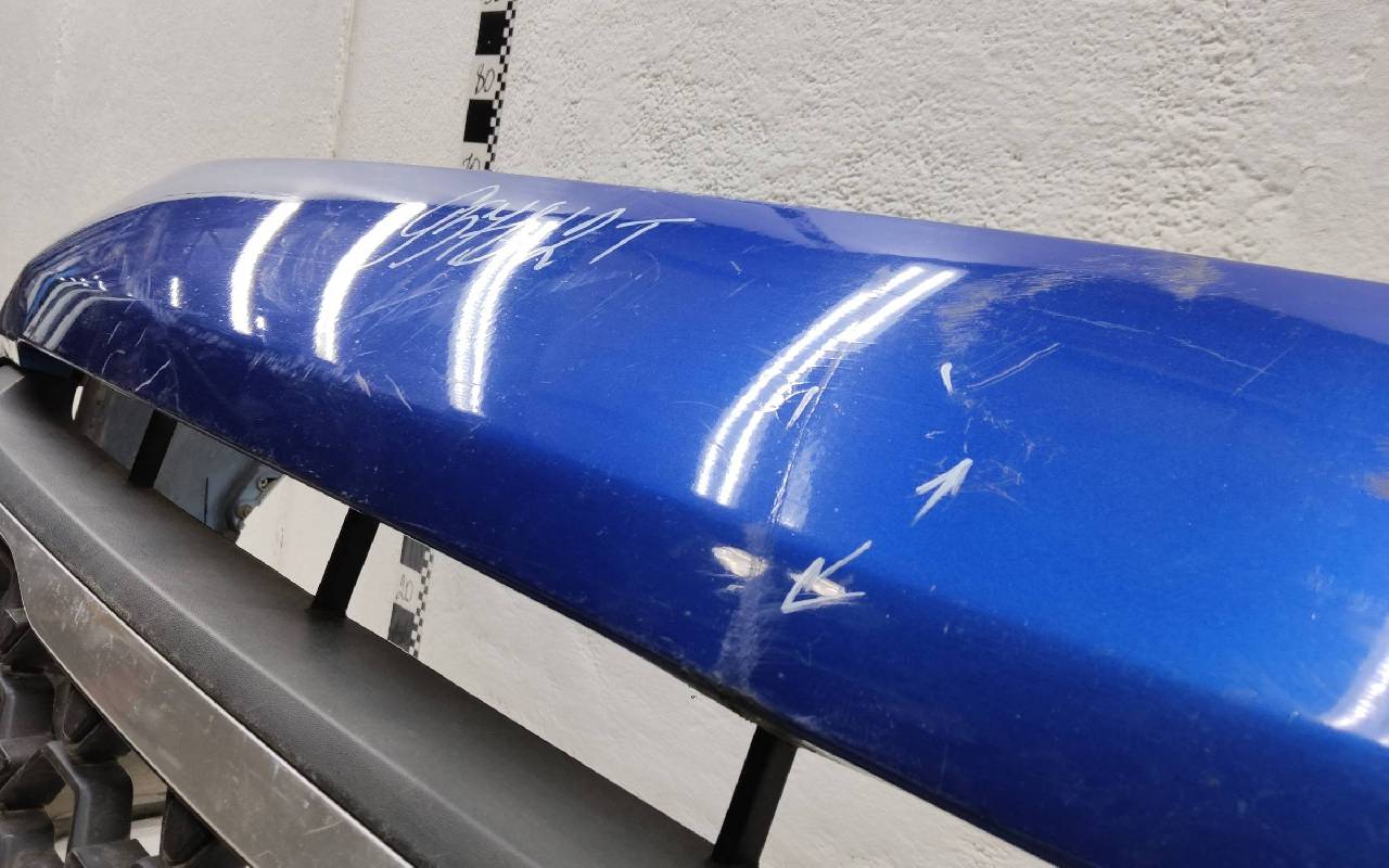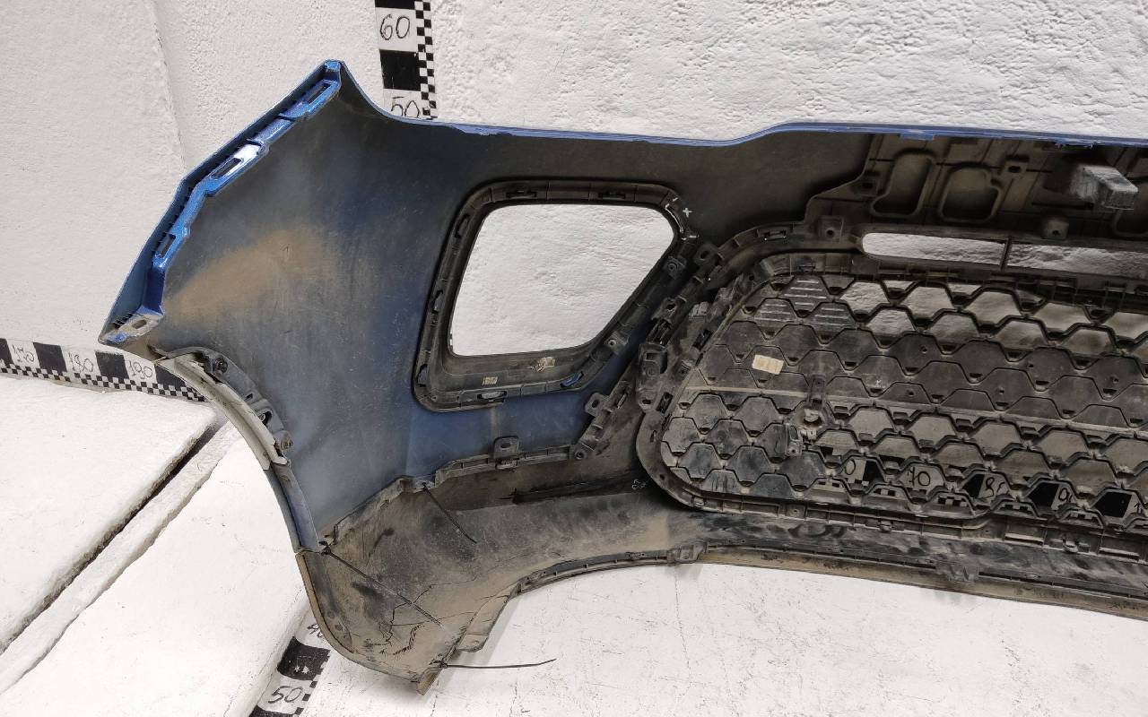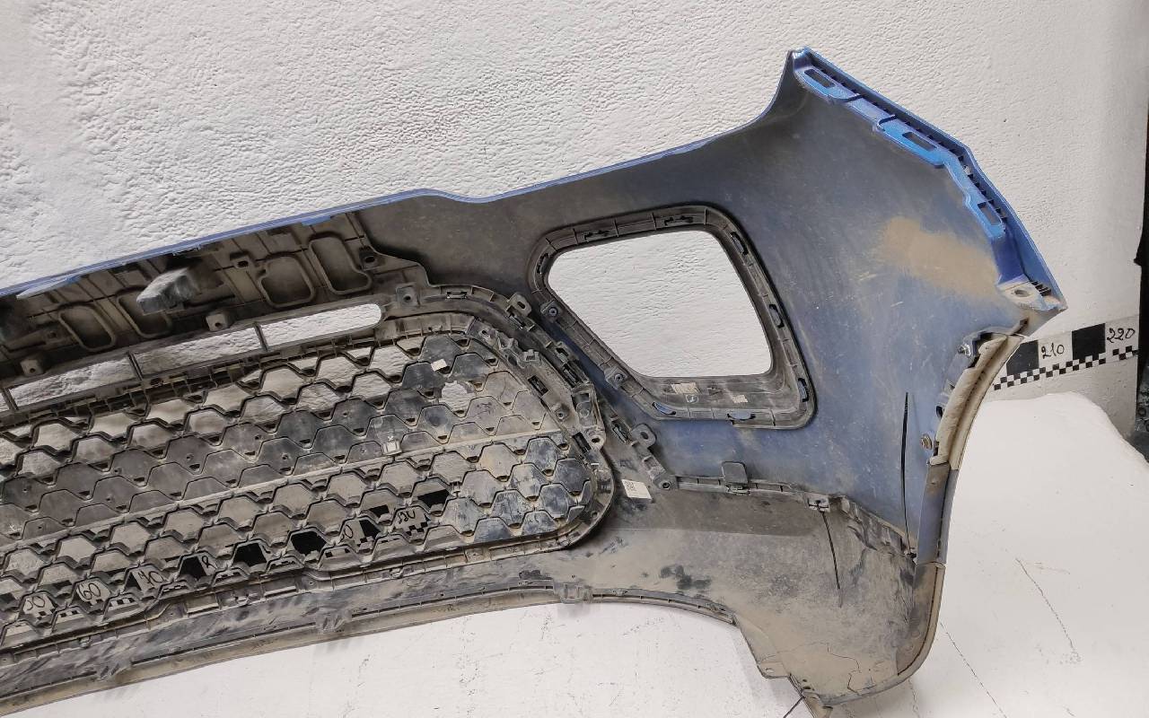 Состояние детали хорошее. Синего цвета в сборе. После небольшого ремонта. Вмятинка на верхней части бампера, дефект пластика нижней части и решетки на фото. Отсутствуют направляющая под правую рамку ПТФ и две на нижней решетке. Сломано одно крепление на рамке. Потребуется незначительный дополнительный ремонт