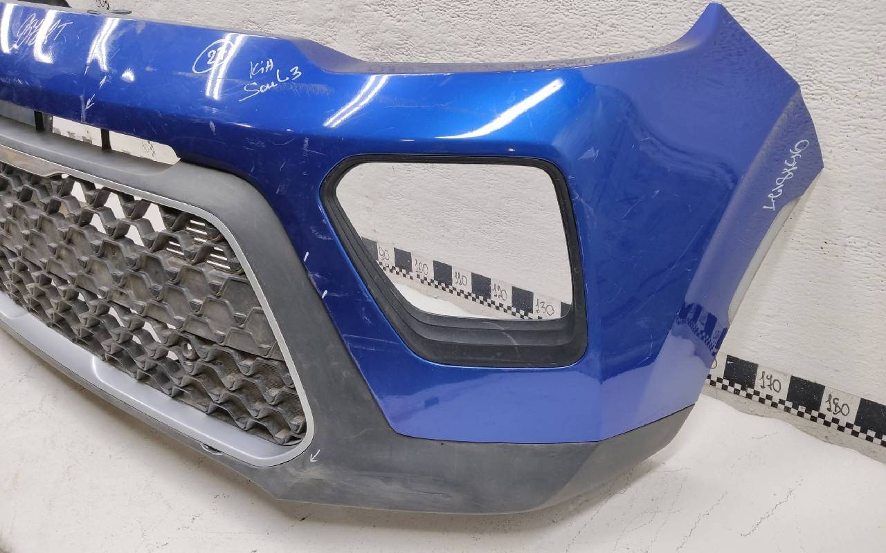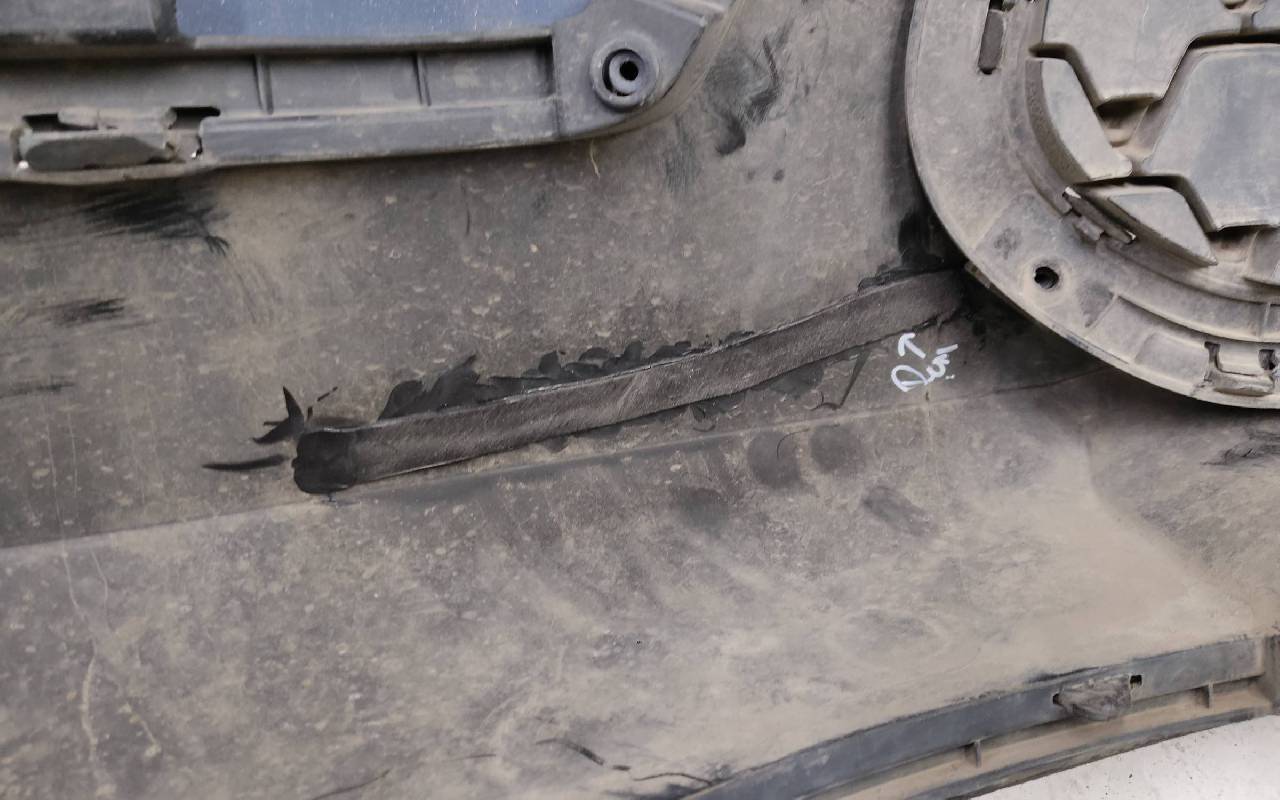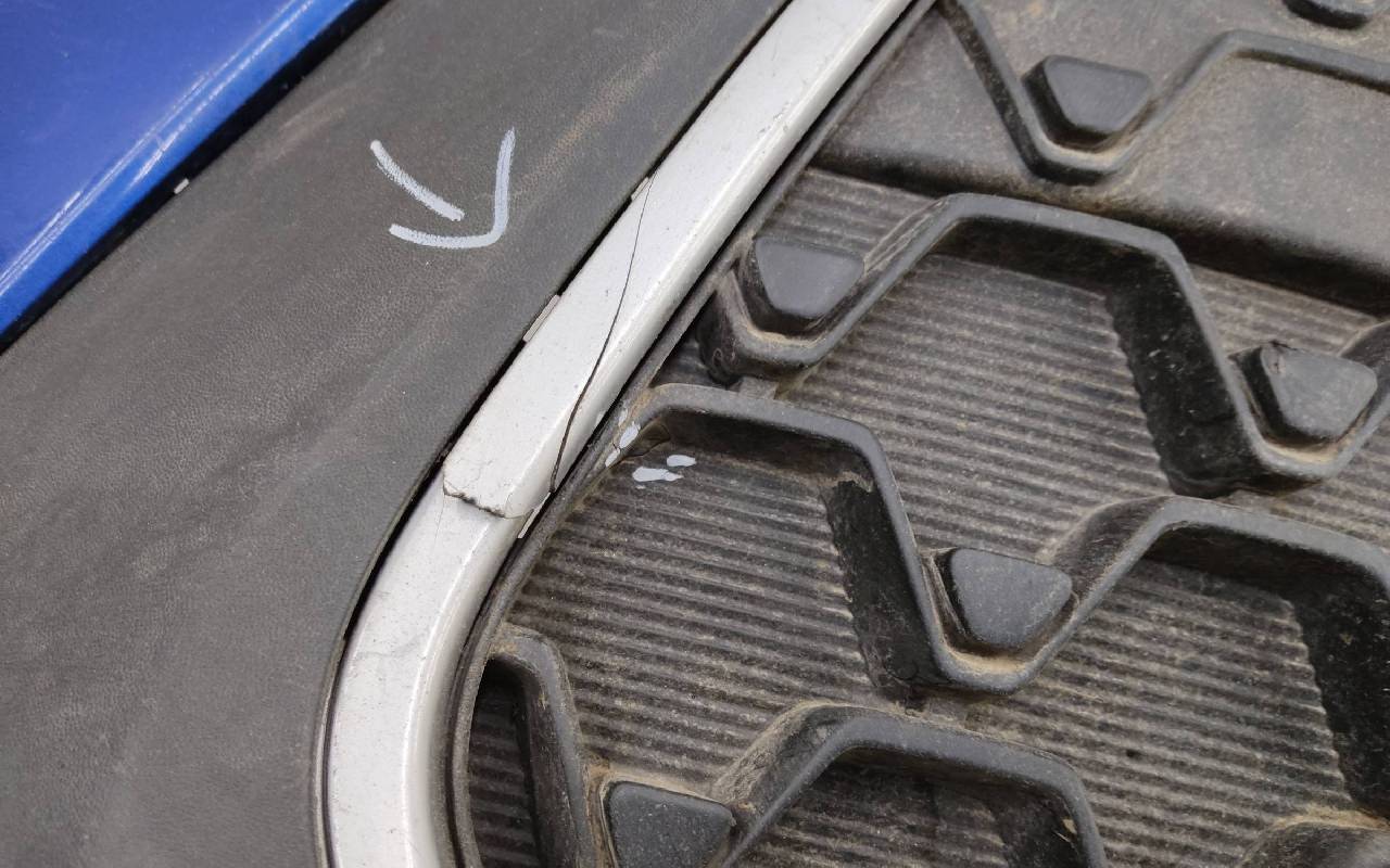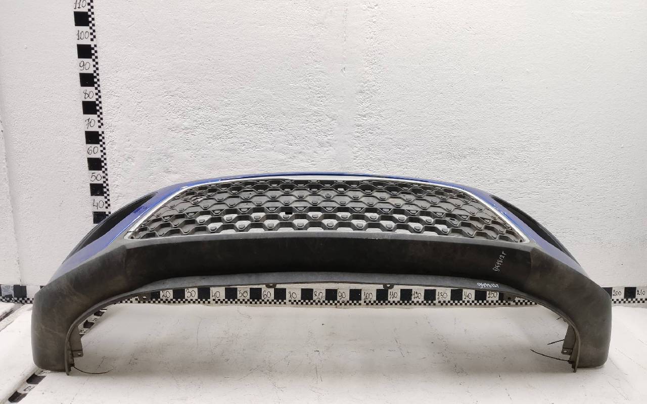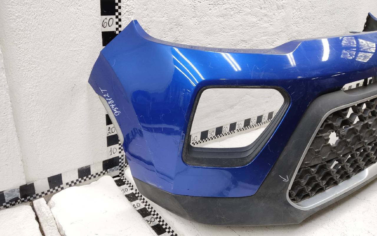 Состояние детали хорошее. Синего цвета в сборе. После небольшого ремонта. Вмятинка на верхней части бампера, дефект пластика нижней части и решетки на фото. Отсутствуют направляющая под правую рамку ПТФ и две на нижней решетке. Сломано одно крепление на рамке. Потребуется незначительный дополнительный ремонт