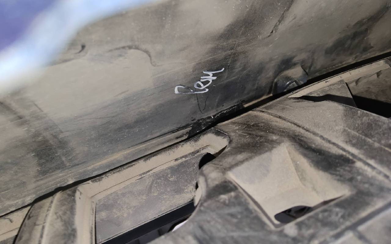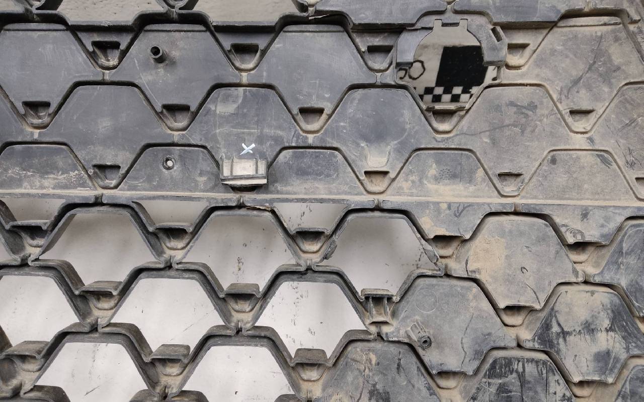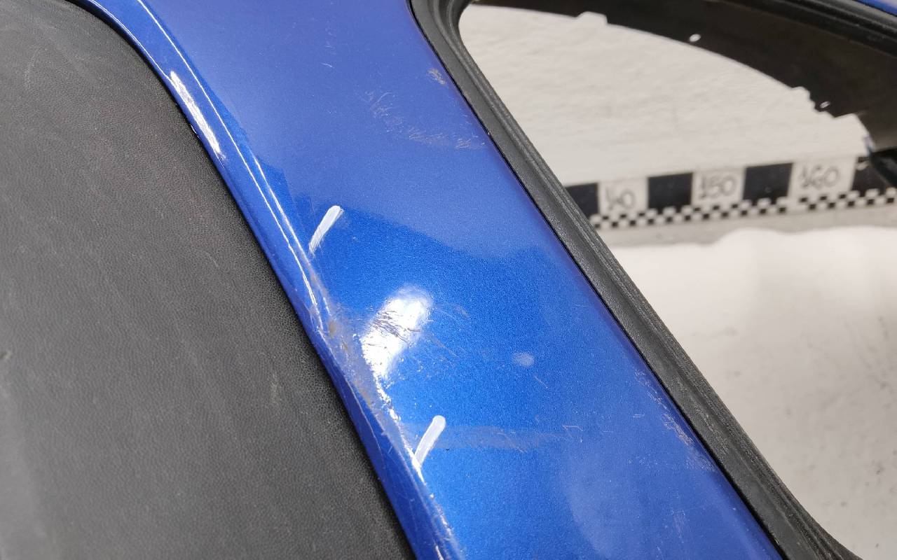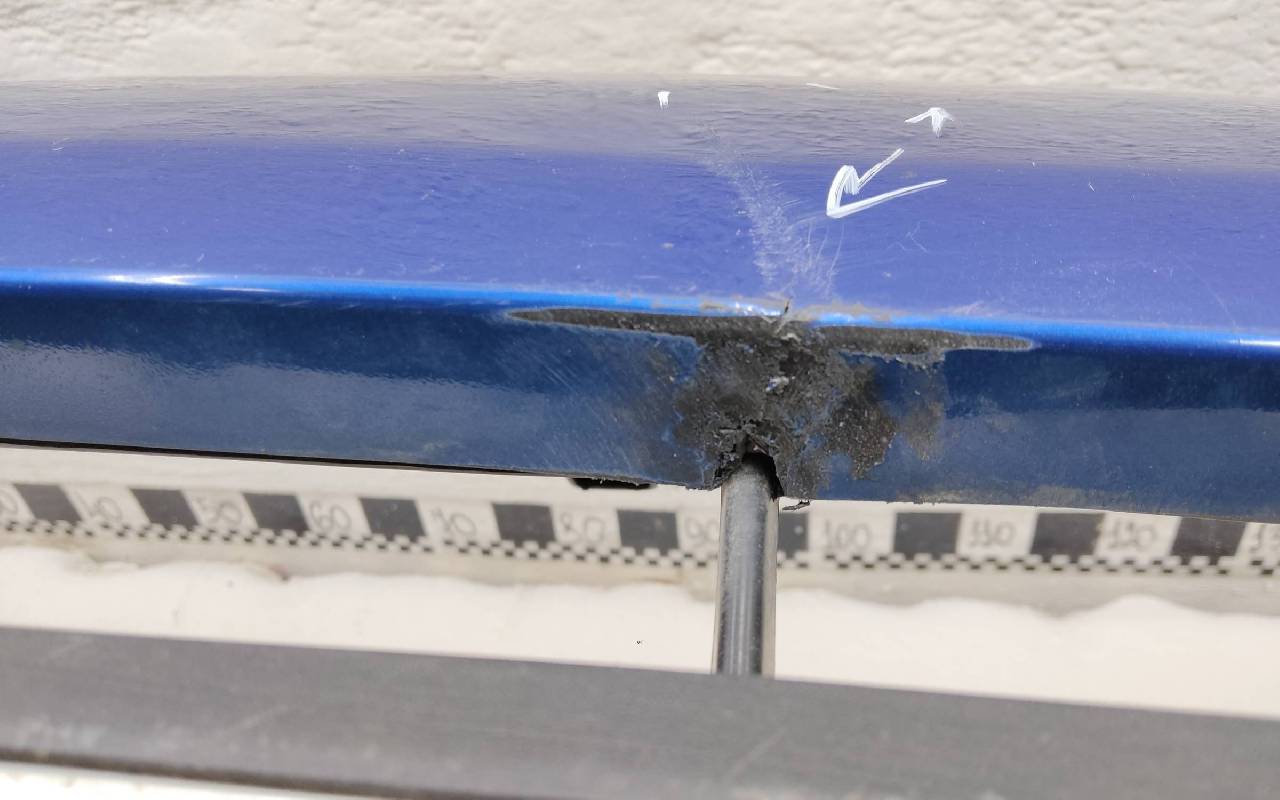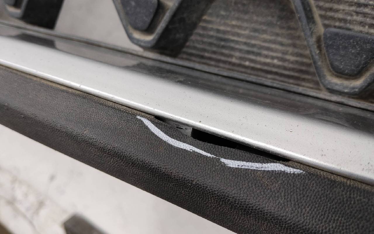 Состояние детали хорошее. Синего цвета в сборе. После небольшого ремонта. Вмятинка на верхней части бампера, дефект пластика нижней части и решетки на фото. Отсутствуют направляющая под правую рамку ПТФ и две на нижней решетке. Сломано одно крепление на рамке. Потребуется незначительный дополнительный ремонт