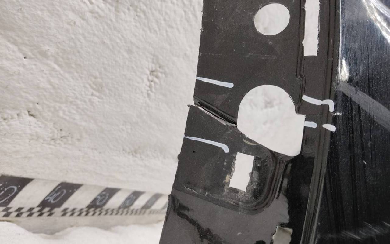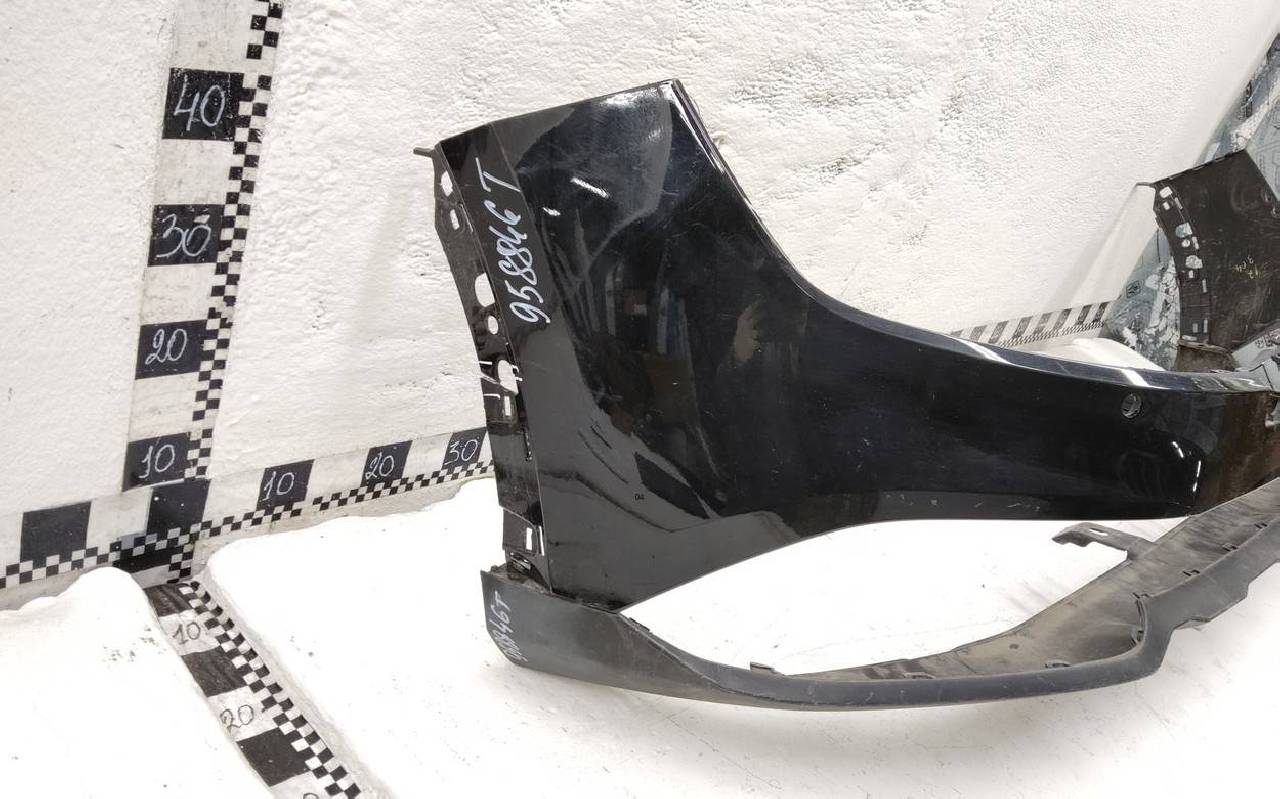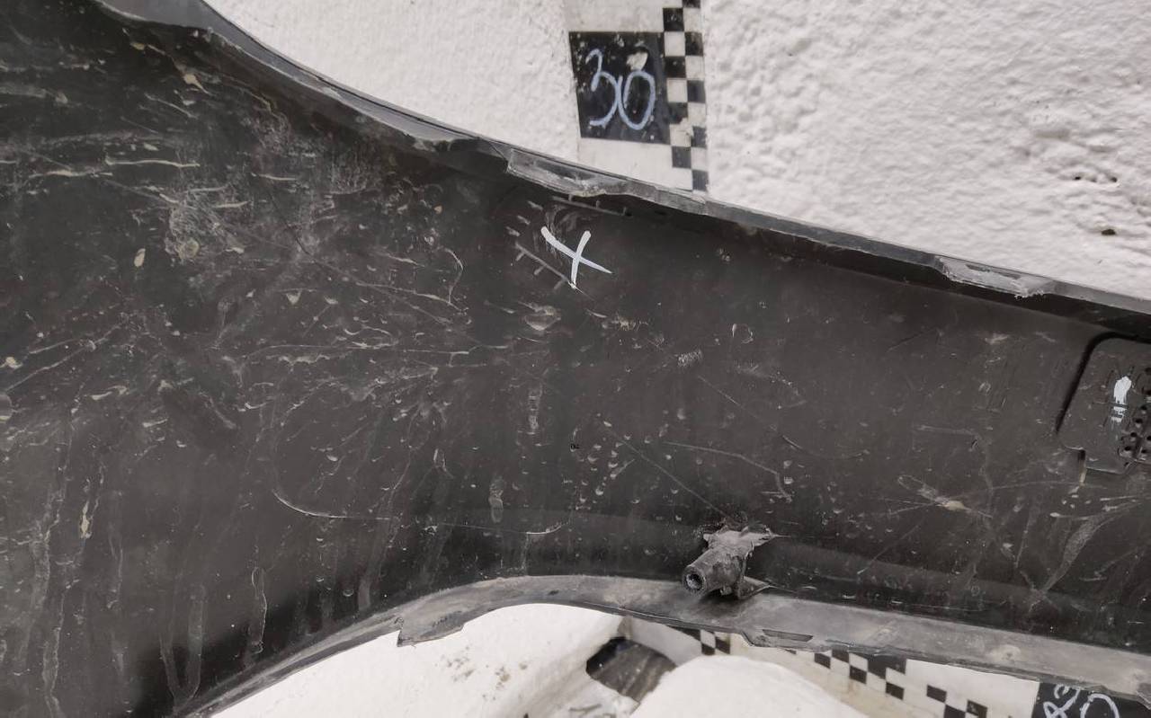 Состояние детали хорошее. Чёрного цвета под парктроники, трещинка. Царапины на юбке. Отсутствует по одному креплению на юбке и бампере. Потребуется незначительный ремонт