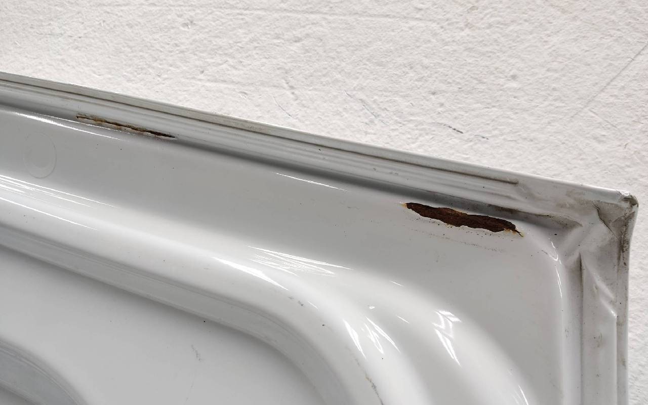 Состояние детали удовлетворительное. Белого цвета, скол ЛКП. Вмятины. Потребуется ремонт