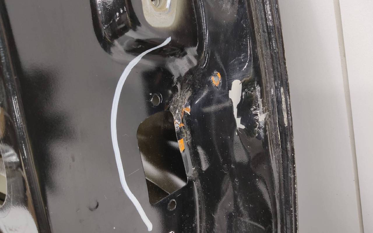 Состояние детали удовлетворительное. Чёрного цвета, скол ЛКП. Вмятины на внешней и внутренней поверхности. Потребуется ремонт