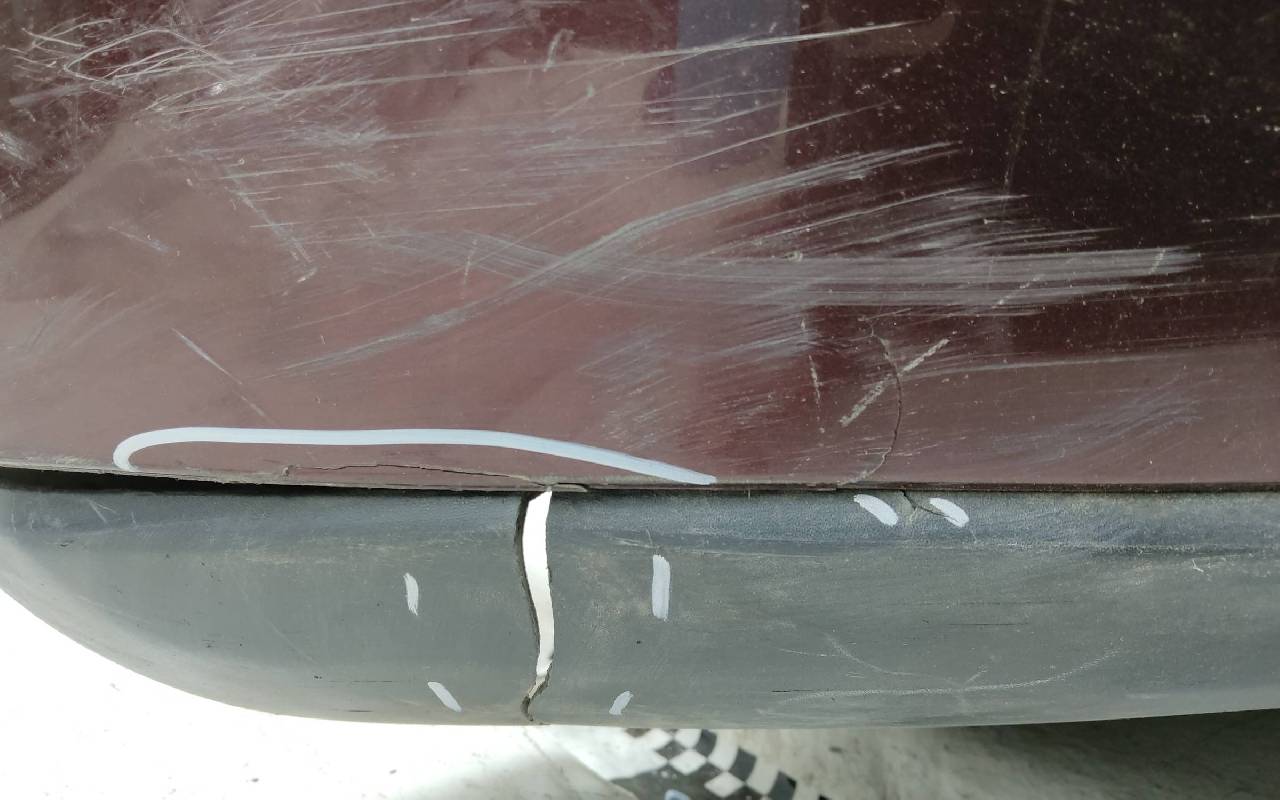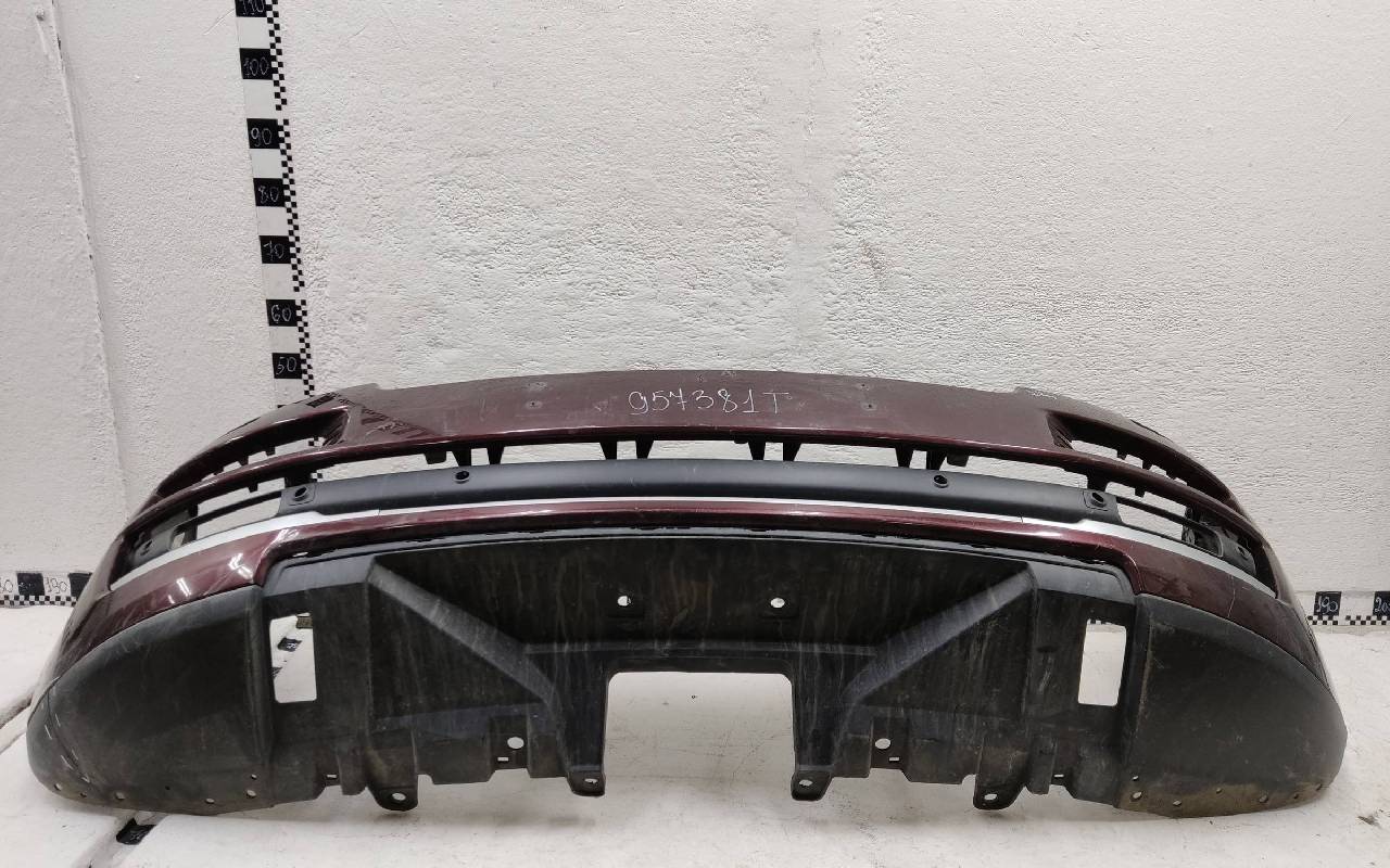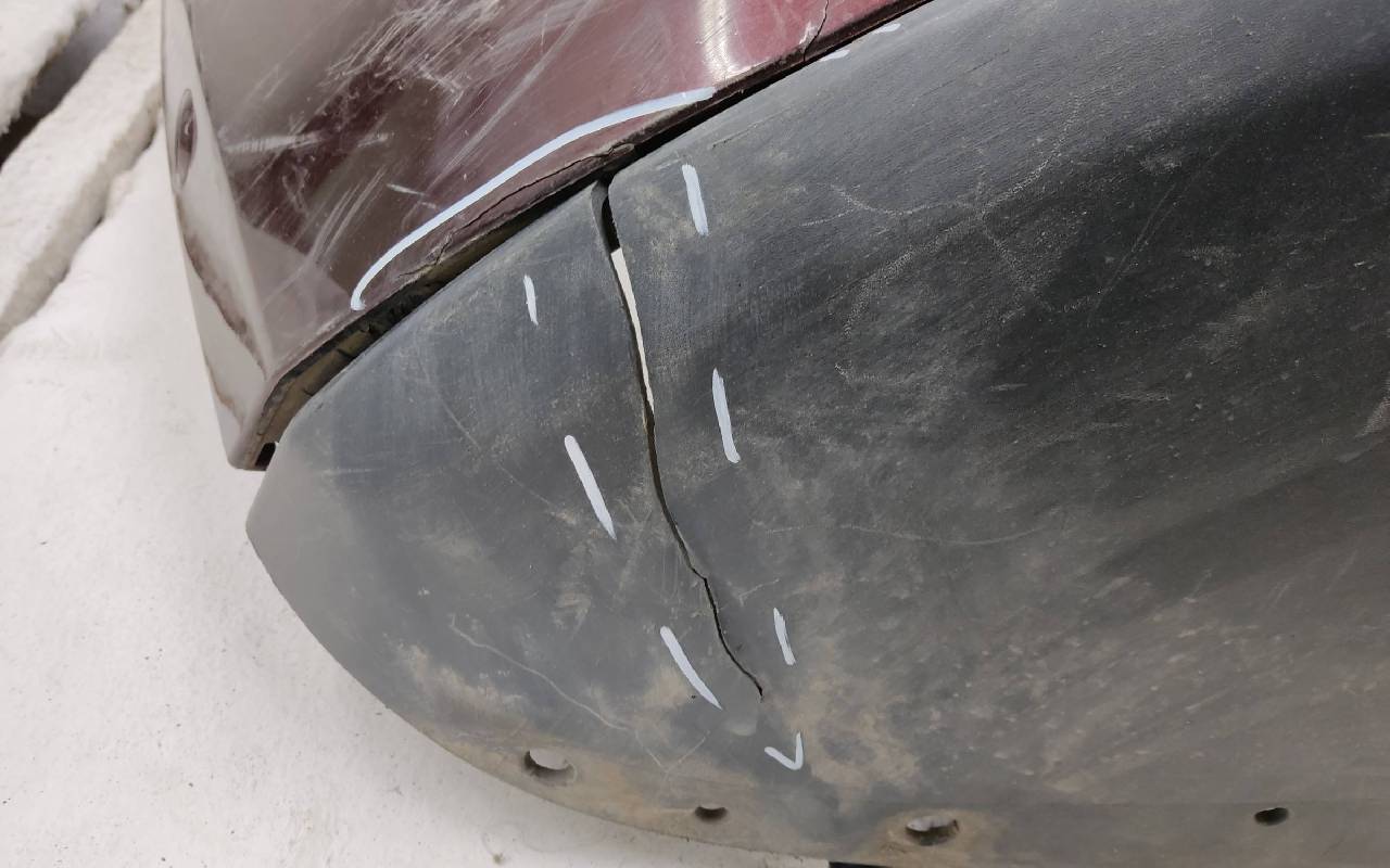 Состояние детали удовлетворительное. Бордового на под парктроники и омыватели фар. Небольшие трещины. Отсутствует правый съёмный кронштейн, одно крепление и две направляющие, дефект креплений юбки на фото. Потребуется ремонт