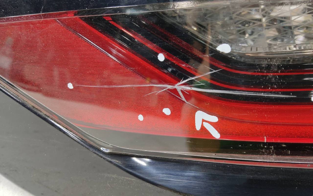 Состояние детали удовлетворительное. Трещина стекла. Скол на кромке. Потертости. Крепления целые. Требуется ремонт