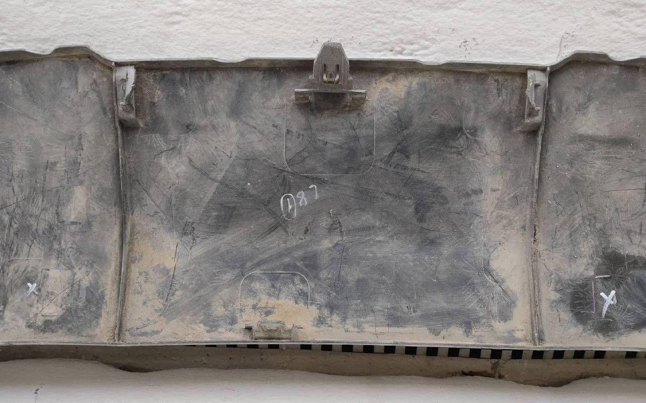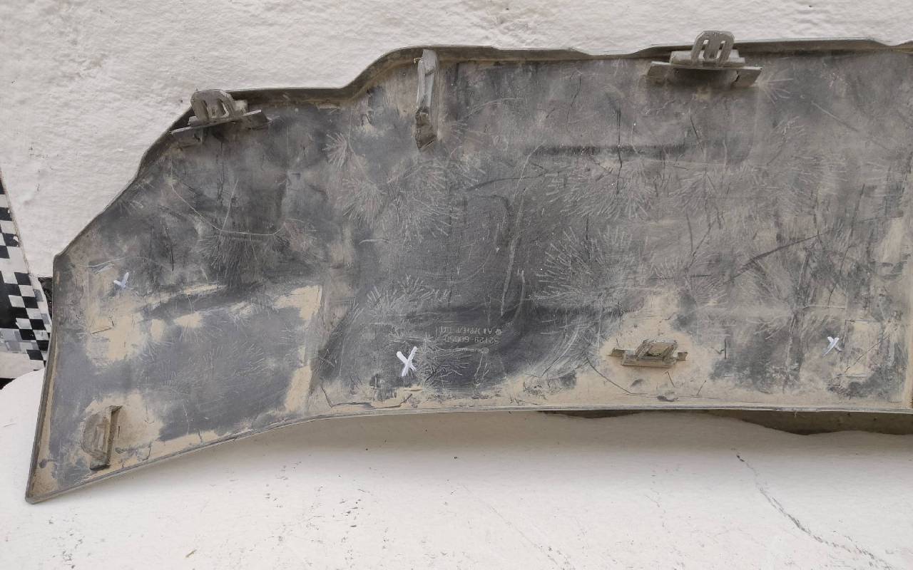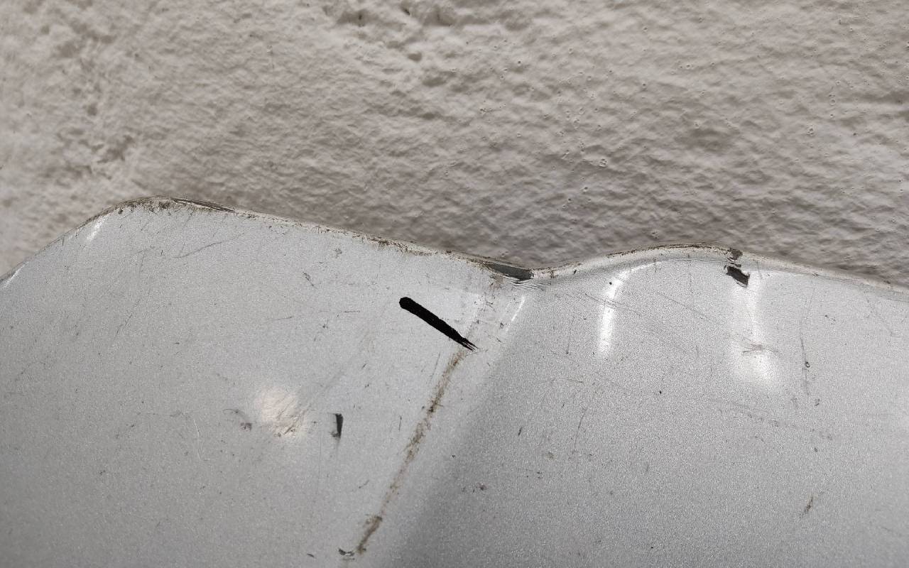 Состояние детали удовлетворительное. Серебристого цвета, вмятинки, царапины. Отсутствуют шесть креплений. Потребуется незначительный ремонт