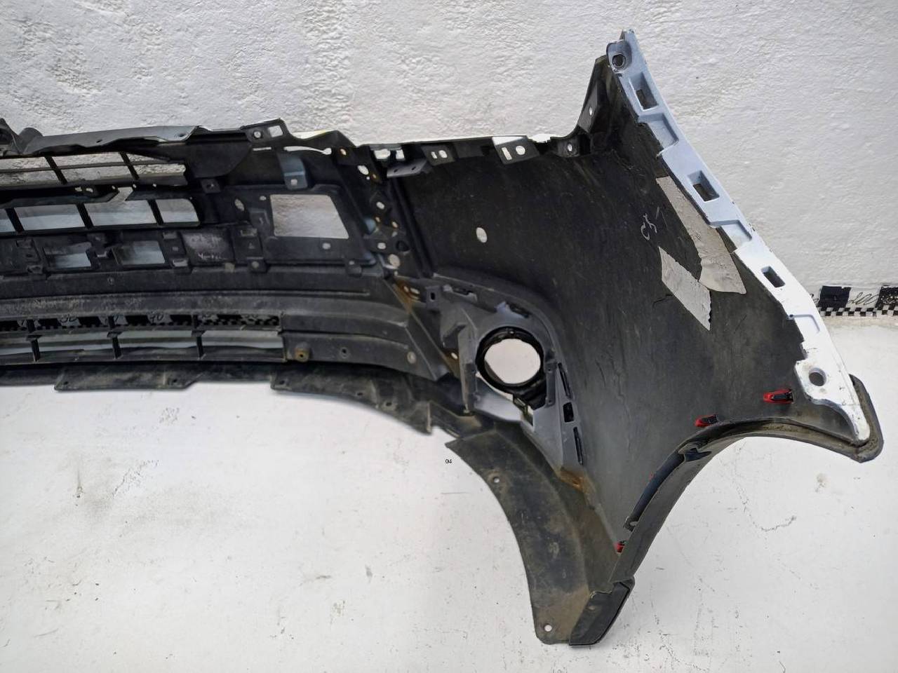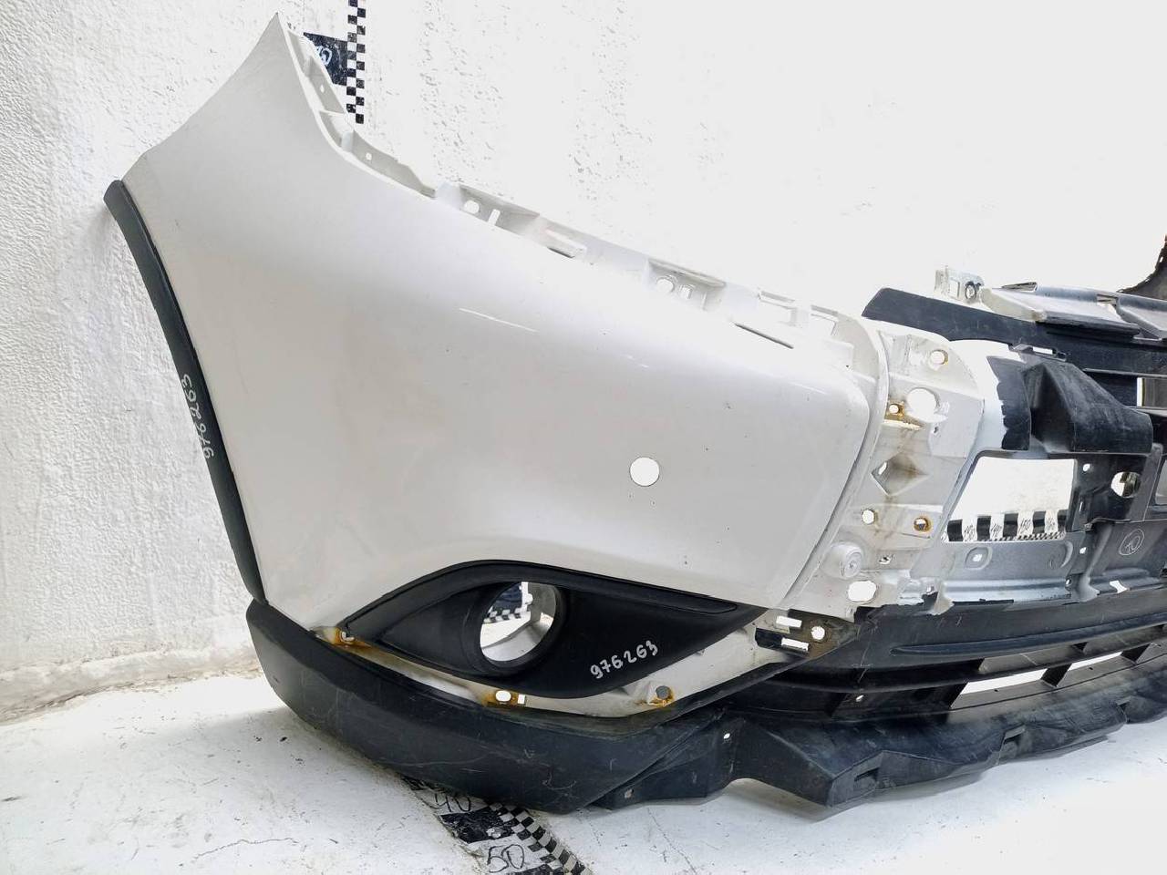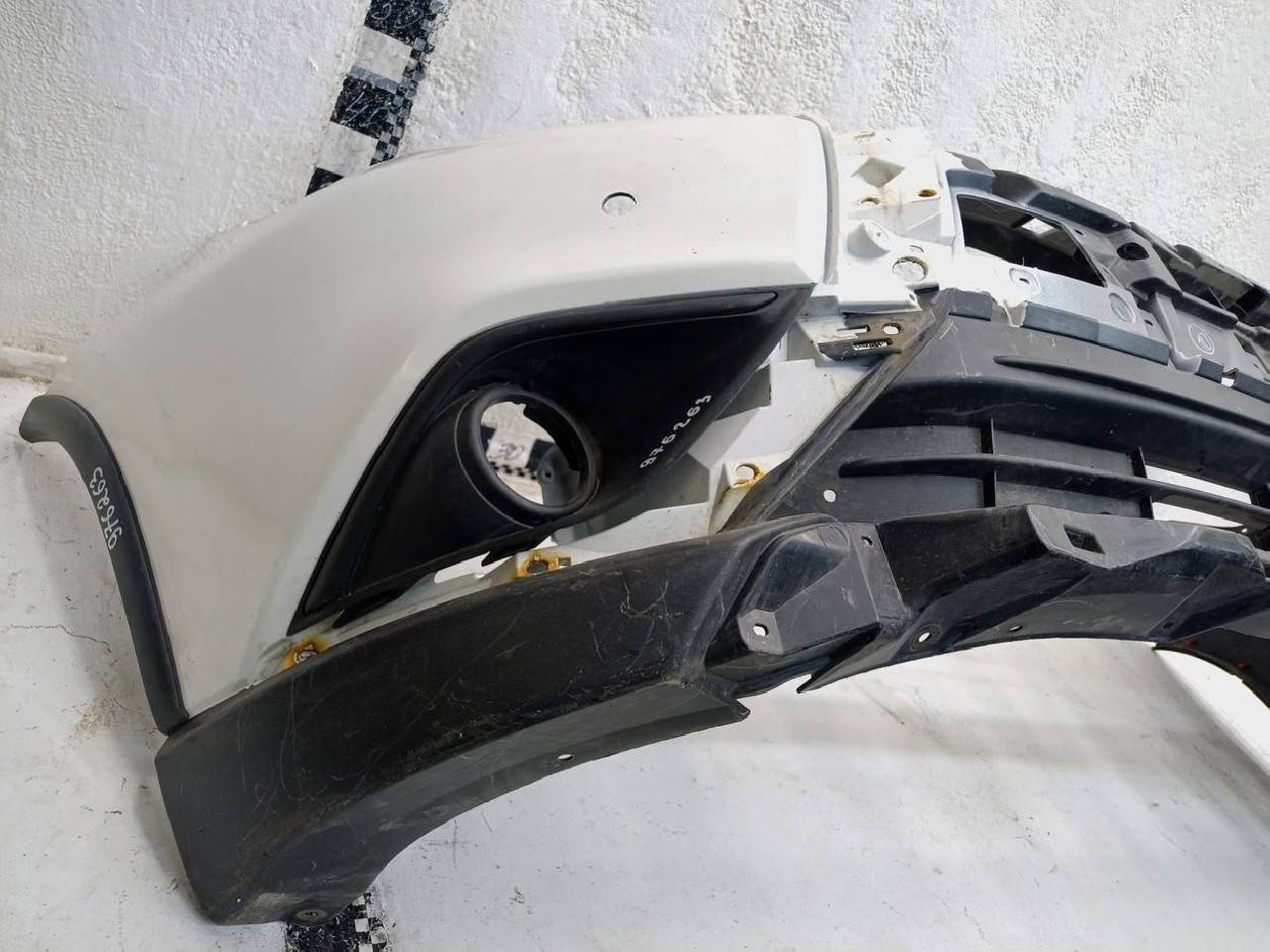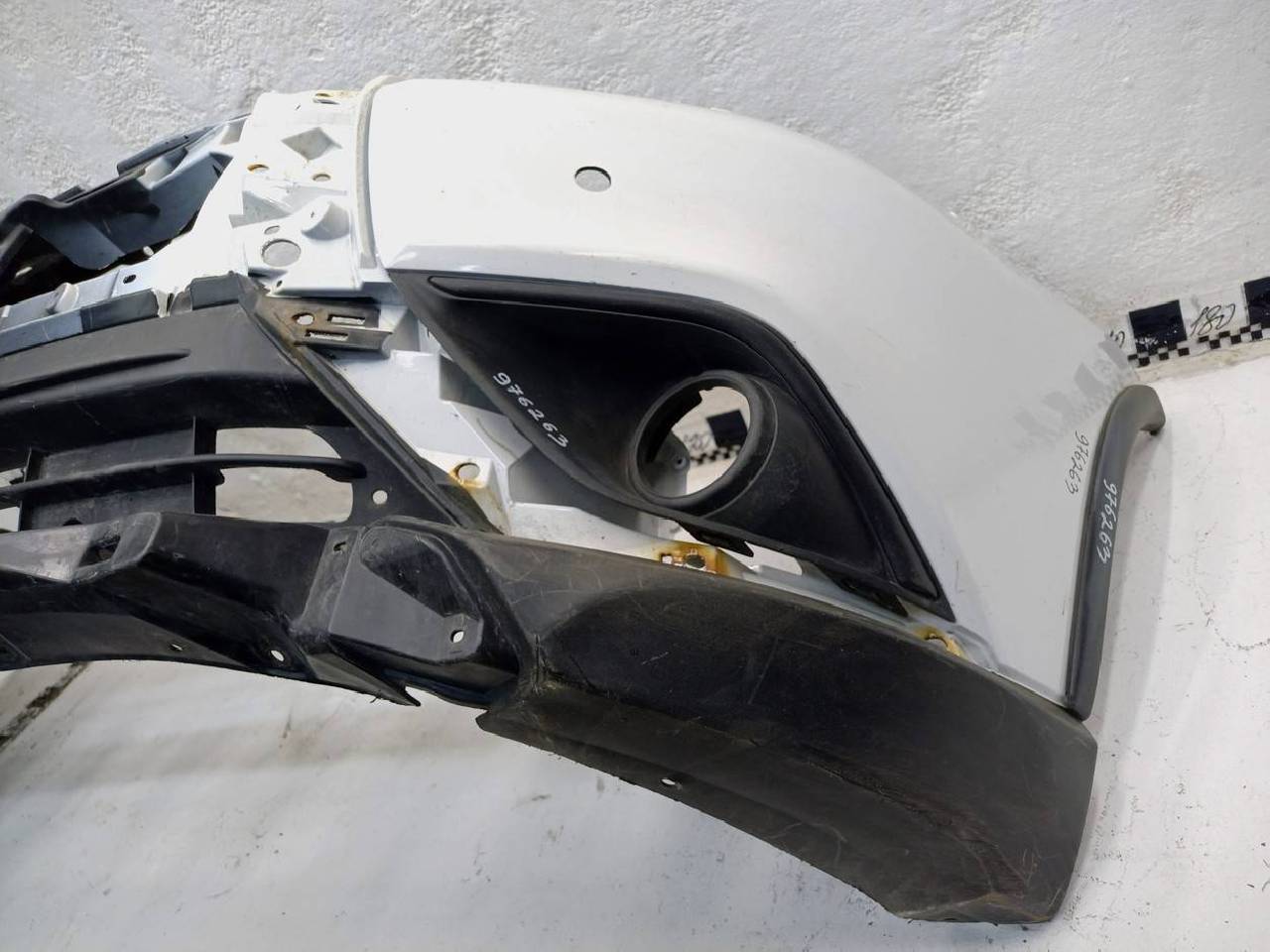 Состояние детали хорошее. Следы эксплуатации. Царапины пластика. В сборе с боковыми накладками и рамками птф. Крепления целые, без видимых повреждений. Под покраску