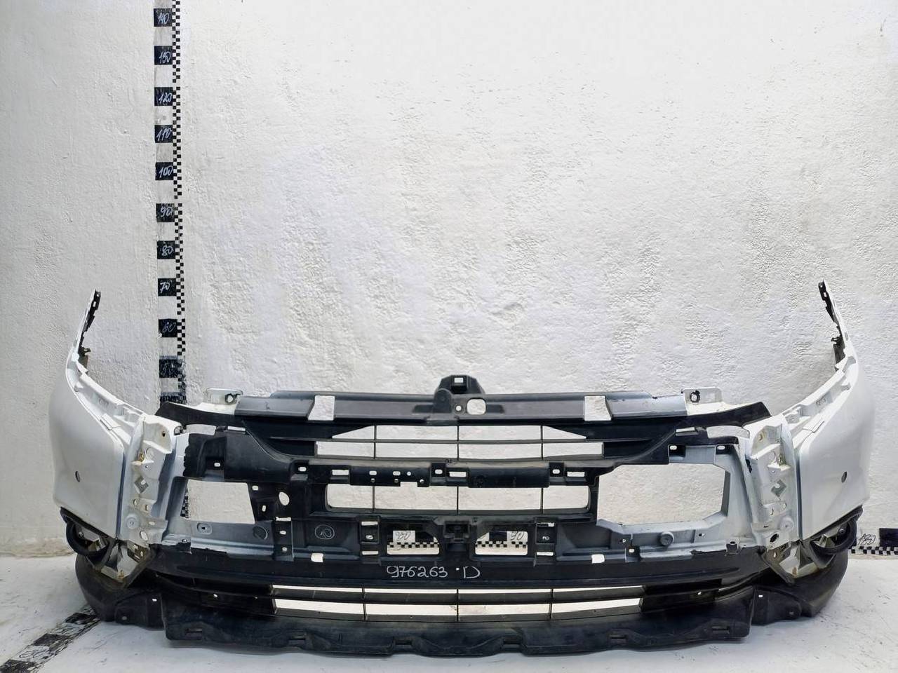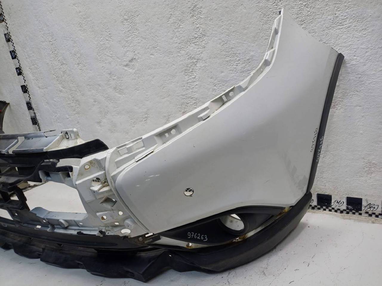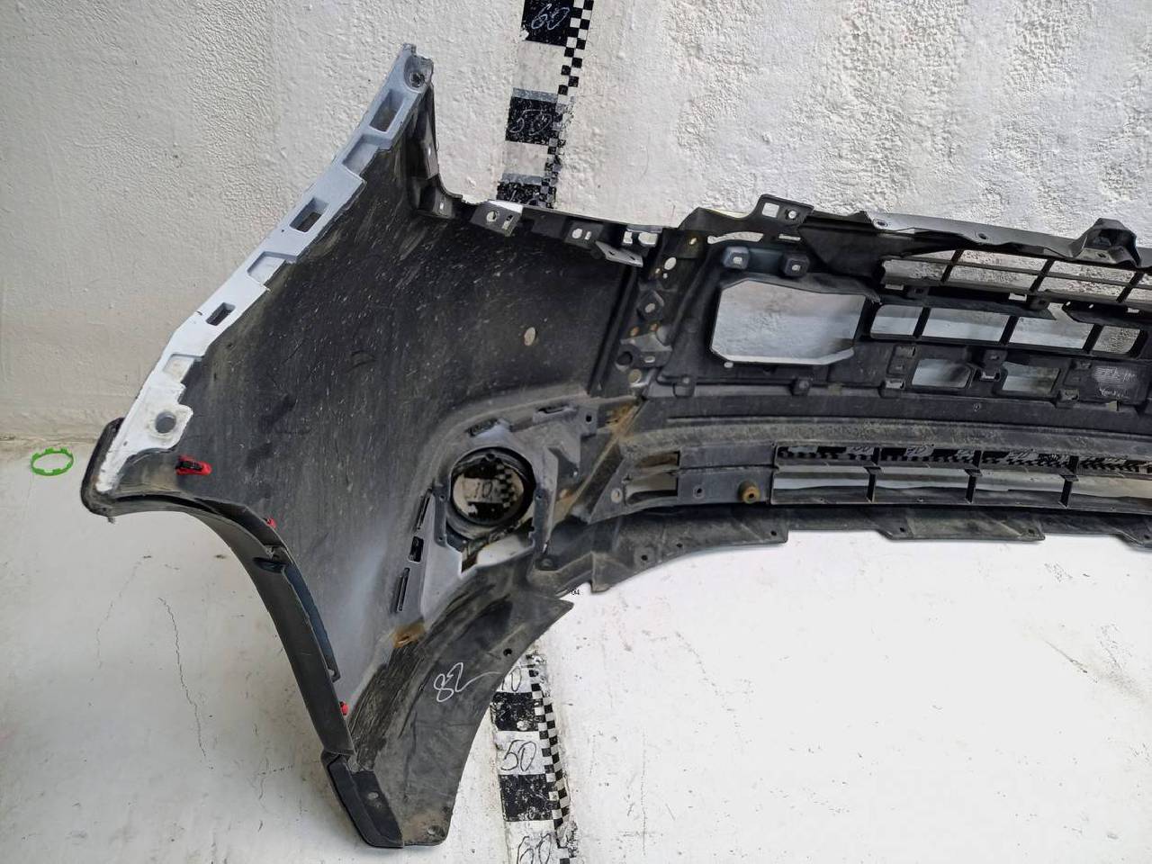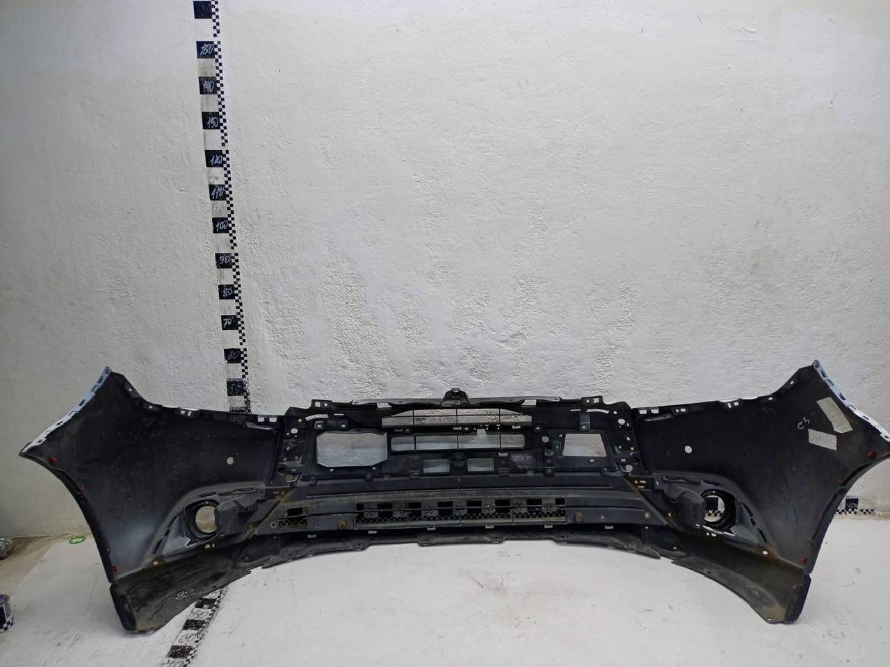 Состояние детали хорошее. Следы эксплуатации. Царапины пластика. В сборе с боковыми накладками и рамками птф. Крепления целые, без видимых повреждений. Под покраску