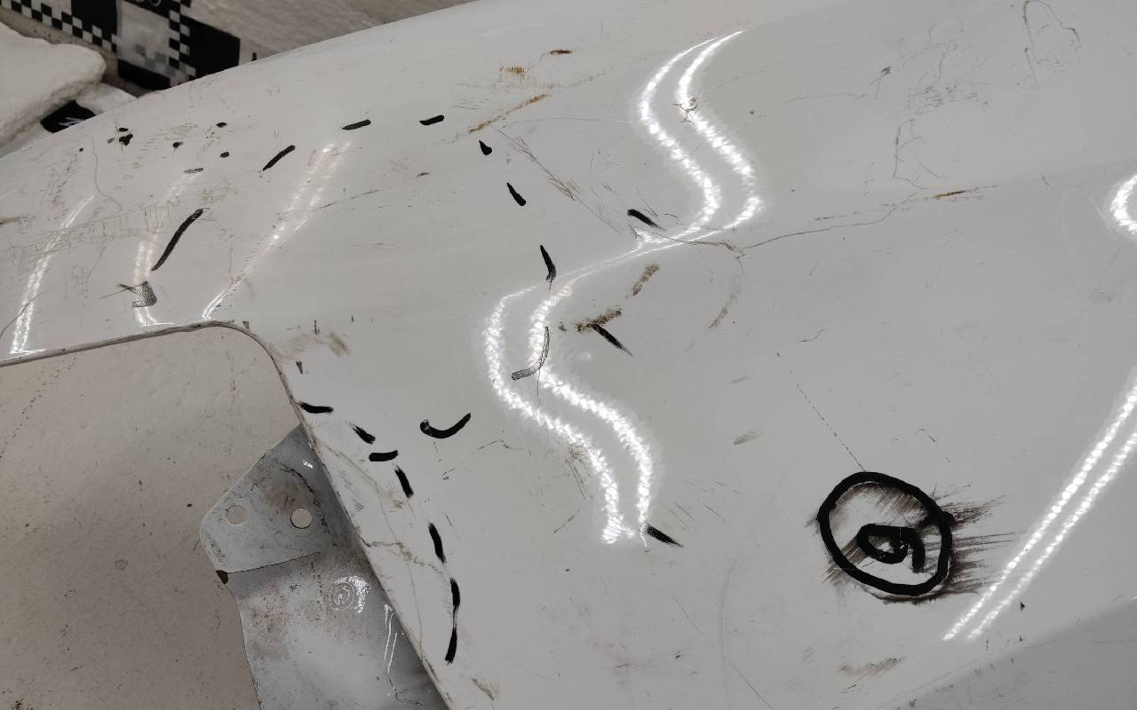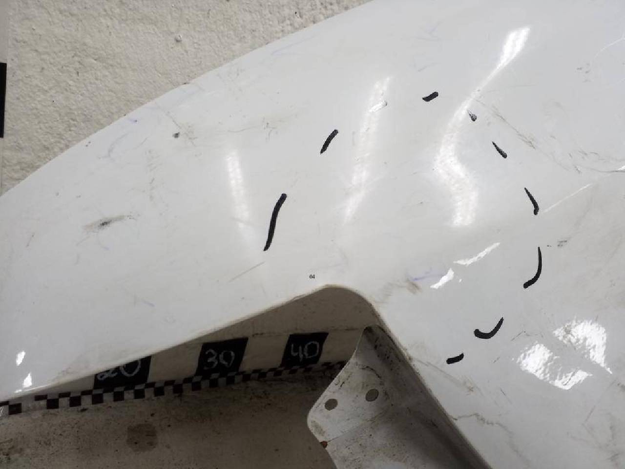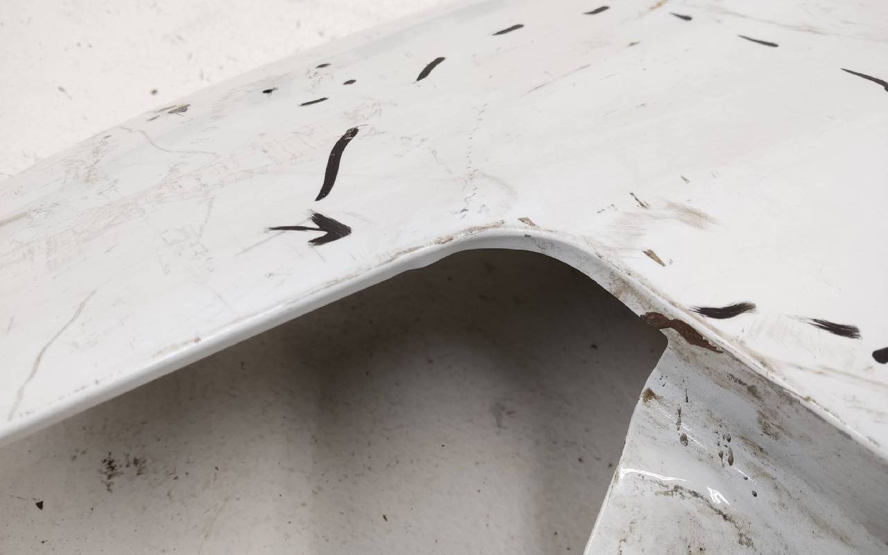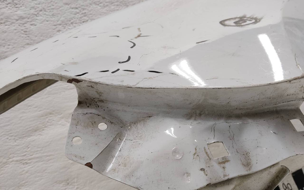 Состояние детали хорошее. Белого цвета,потертость поверхности,под покраску. Дефект металла вмятинка на фото. Под ремонт