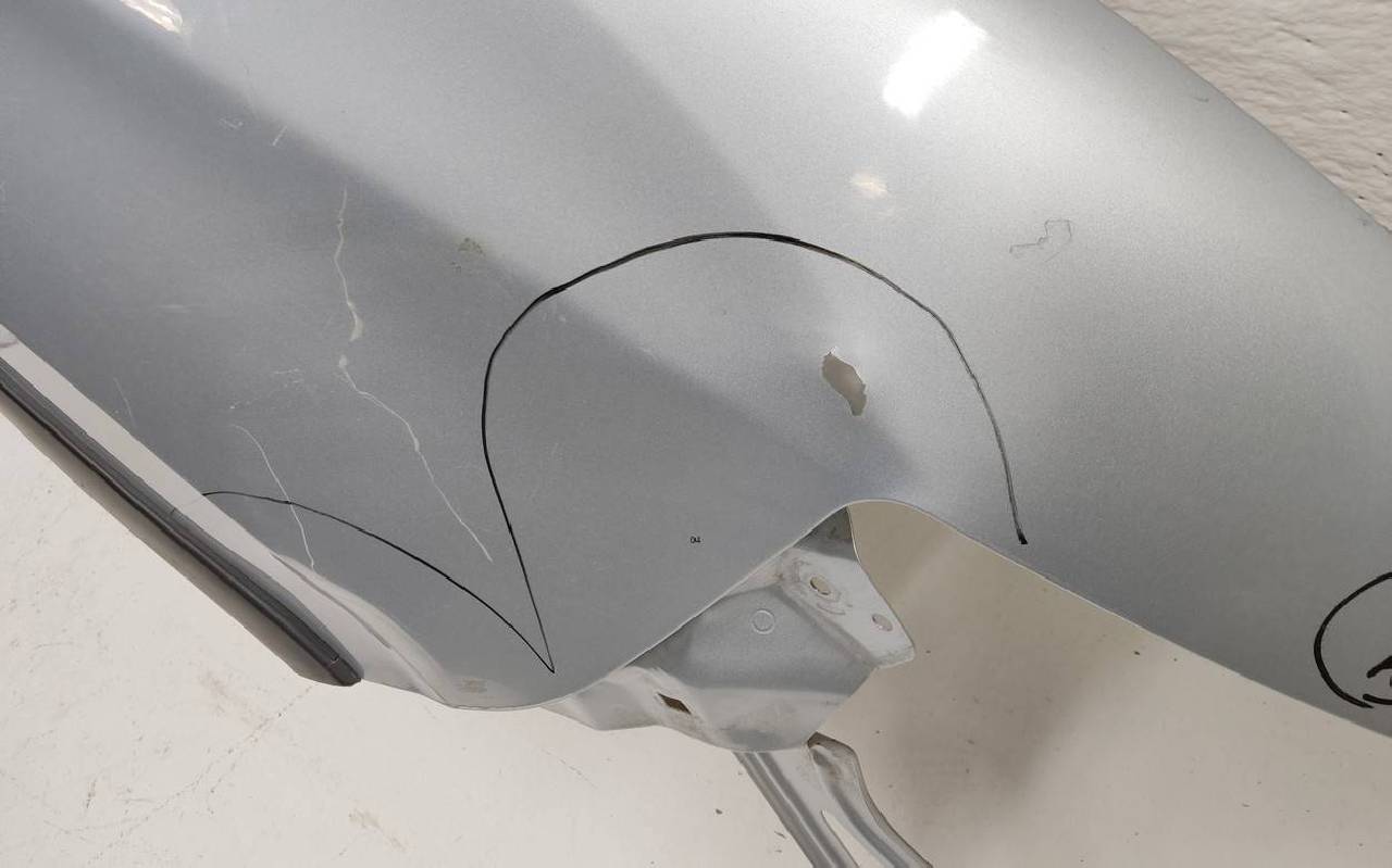 Состояние детали удовлетворительное. Серебристого цвета, скол ЛКП. Накладка с царапинами. Вмятины в передней части. Потребуется ремонт
